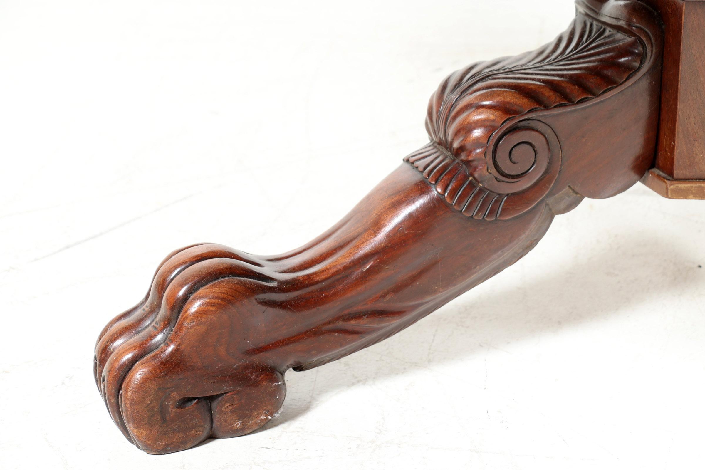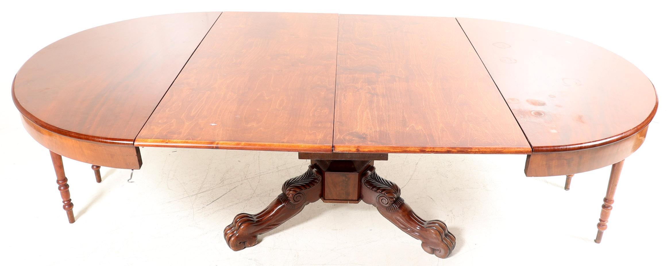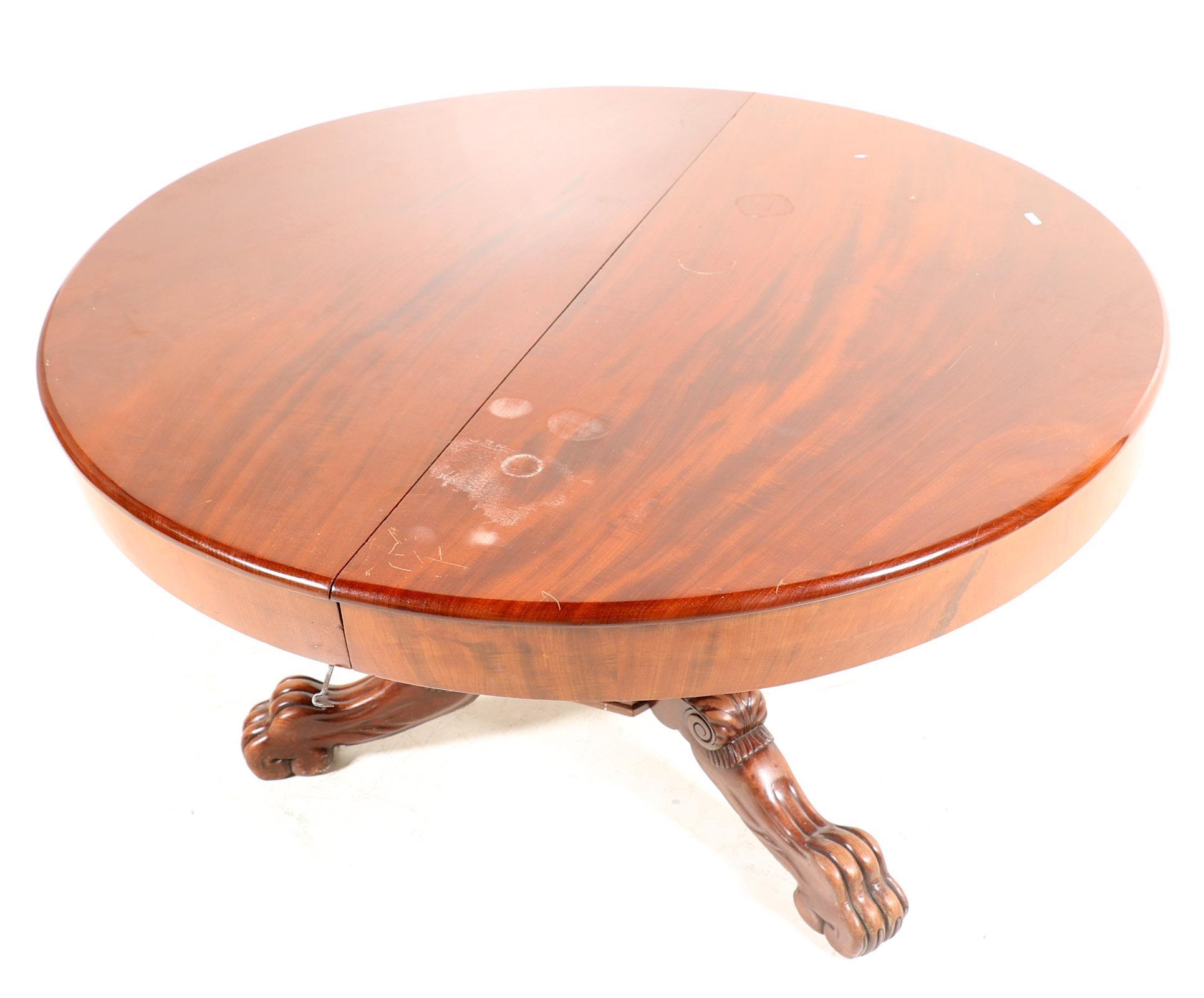 Antieke mahoniehouten coulissetafel rustend op 3 klauwpoten en 2 bijgemaakt tussenbladen, diam.135 cm. of 255 cm.