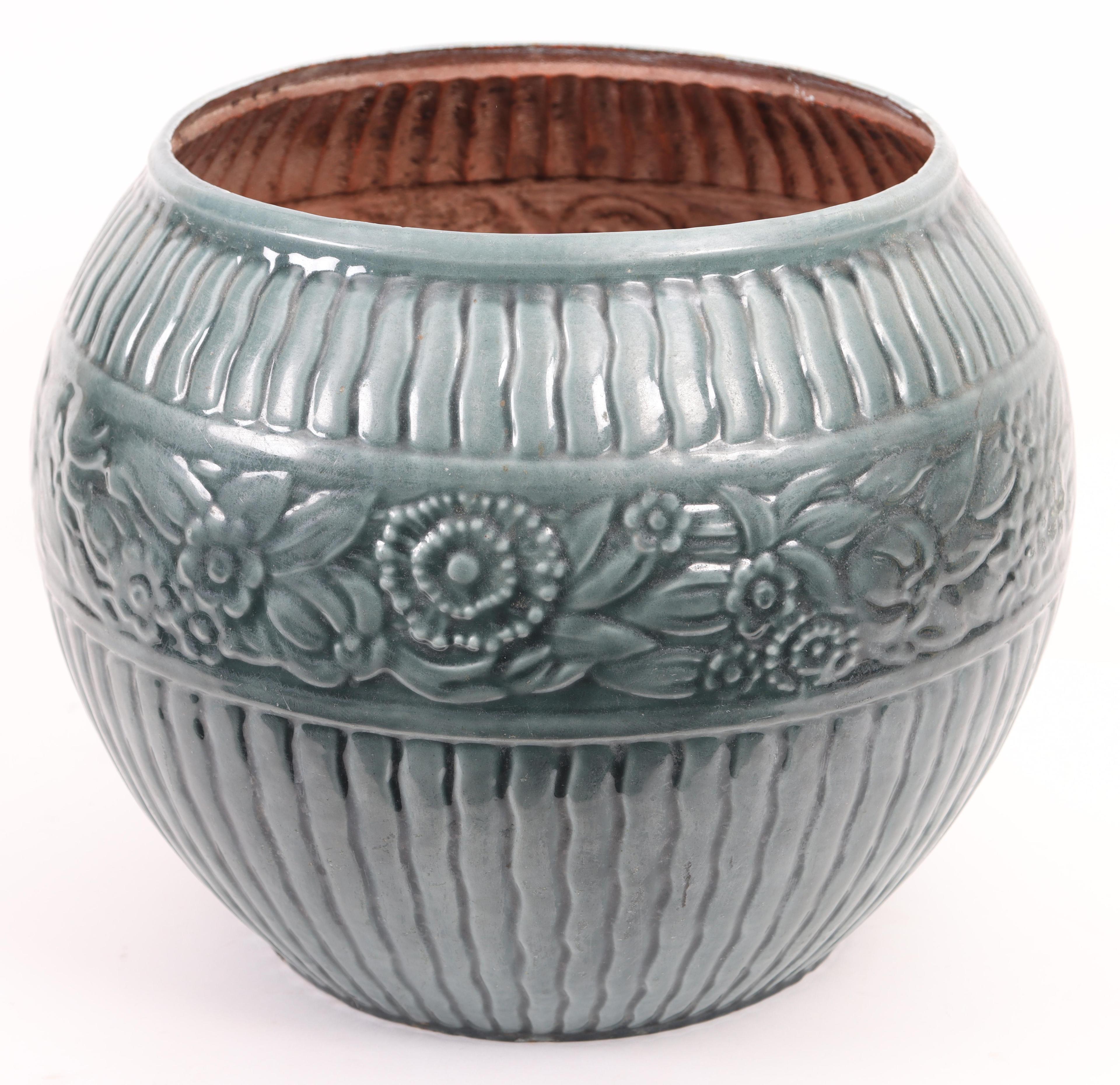 Blauw/groene geëmailleerde metalen bloempot, h.30 x diam.38 cm.