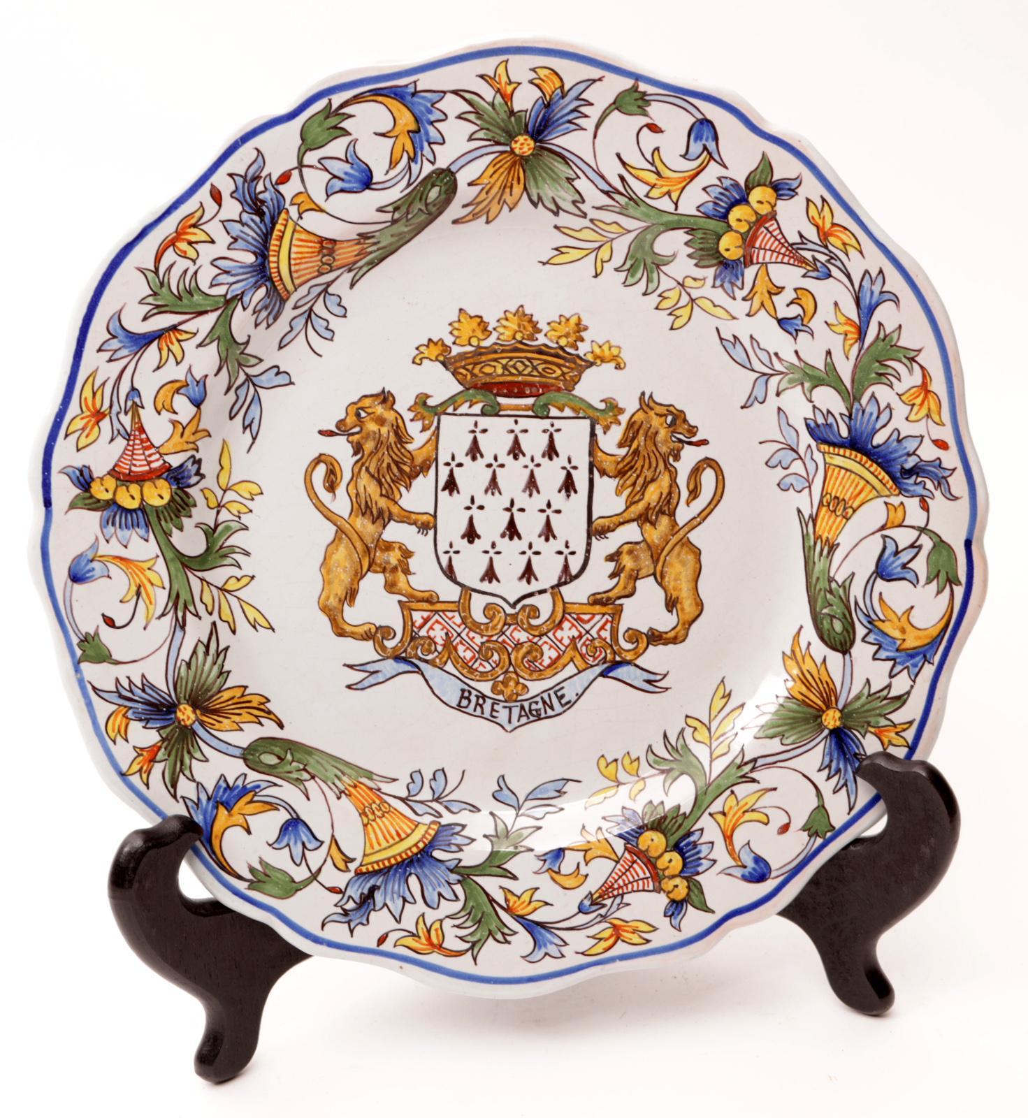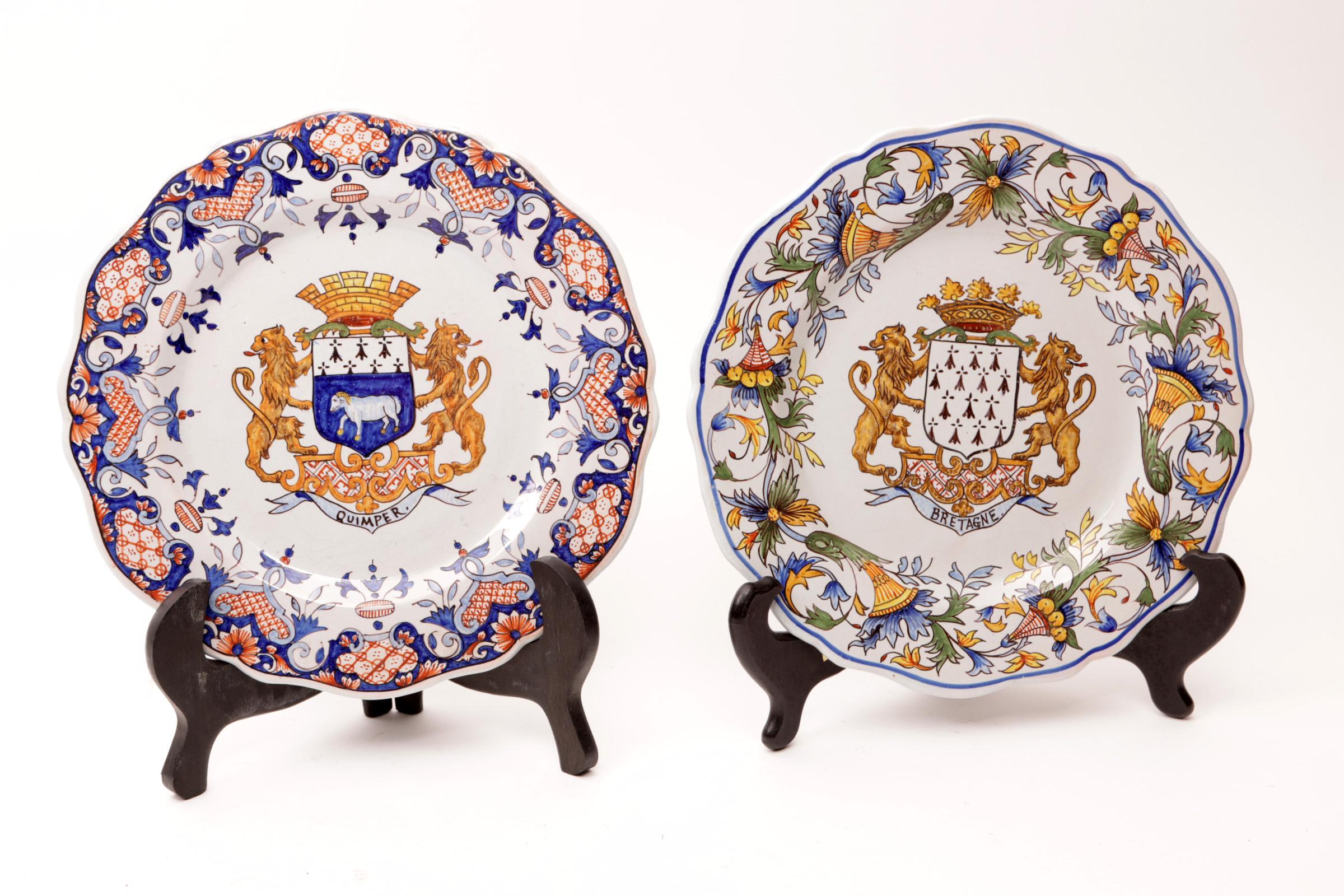 2 Gepolychromeerde stedenborden met Bretagne en Quimper, diam.24 cm.
