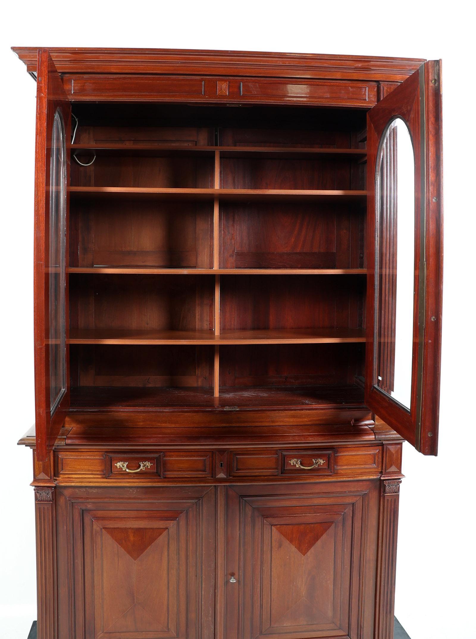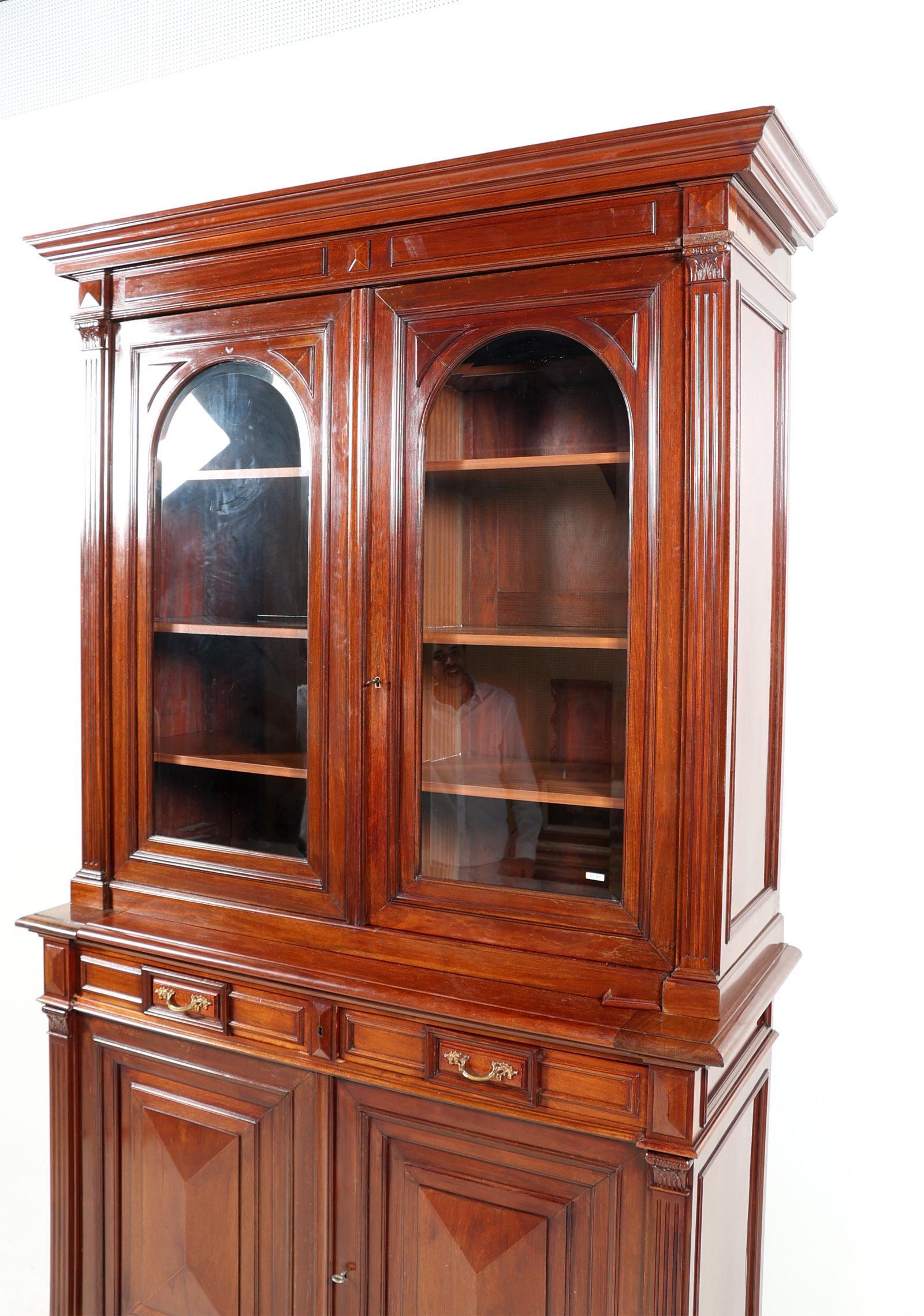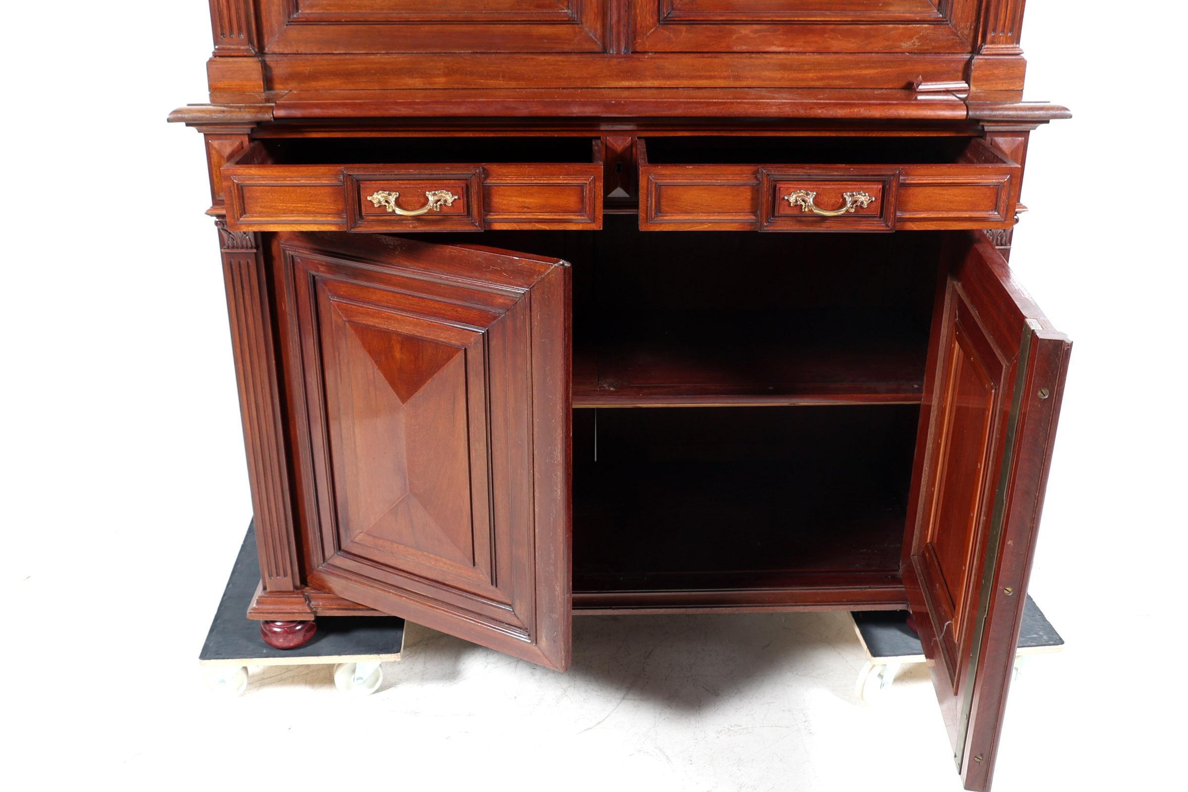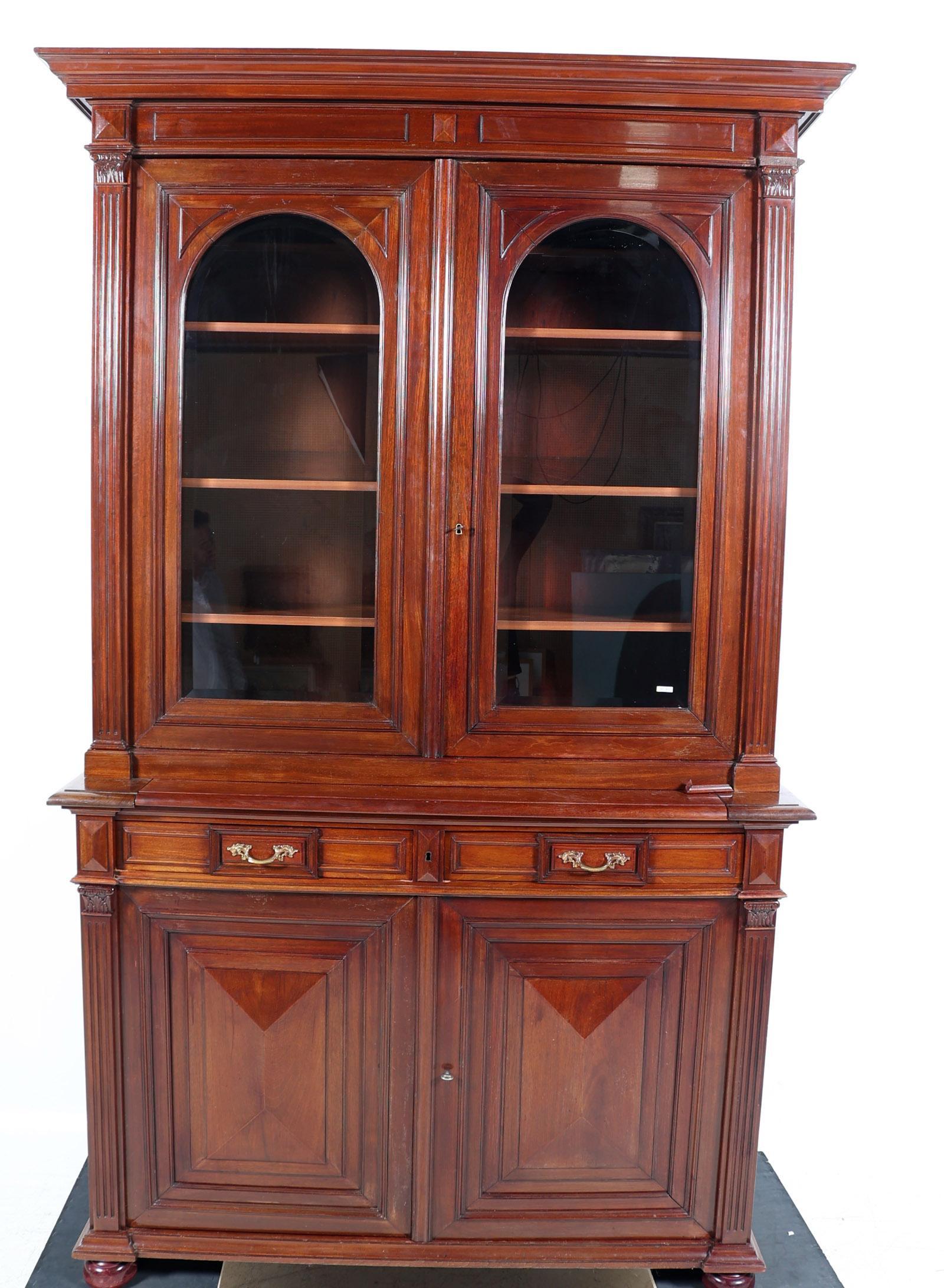 Oude mahoniehouten 4-deurs kast met vitrine opstand, rustend op bolpoten, h.249 x b.150 x d.60 cm.