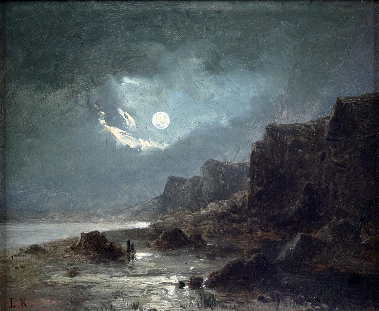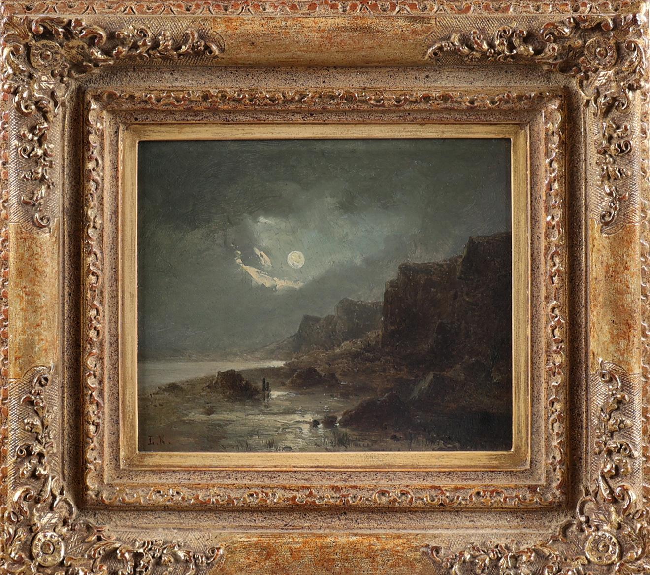 Monogram L.K., Kustlijn bij maanlicht, olieverf op paneel 21 x 17 cm., provenance particuliere collectie Nederland