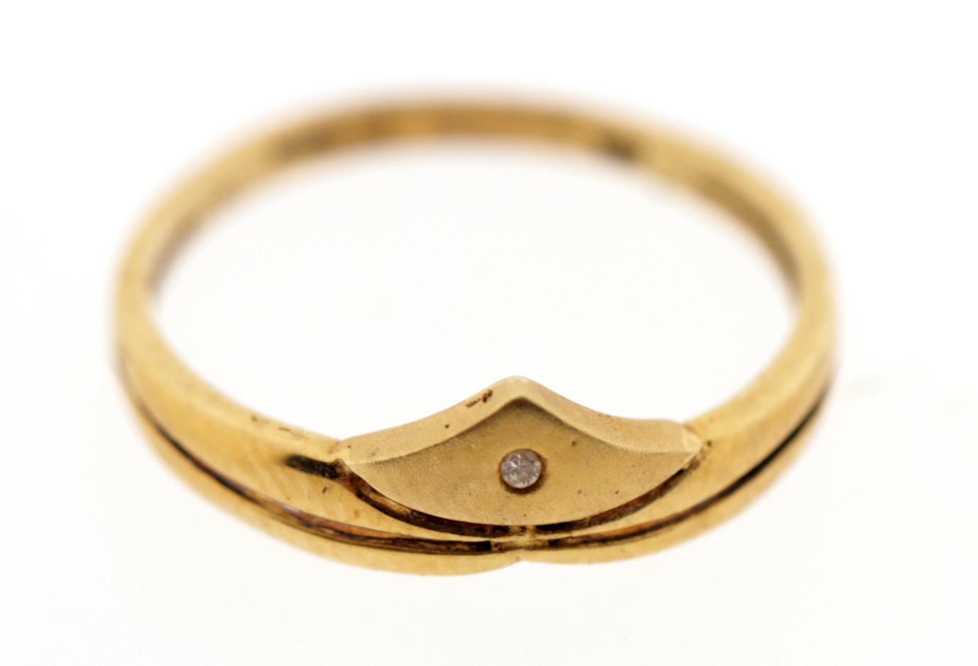 14 Kt. gouden damesring bezet met briljant geslepen diamant, ringmaat 17