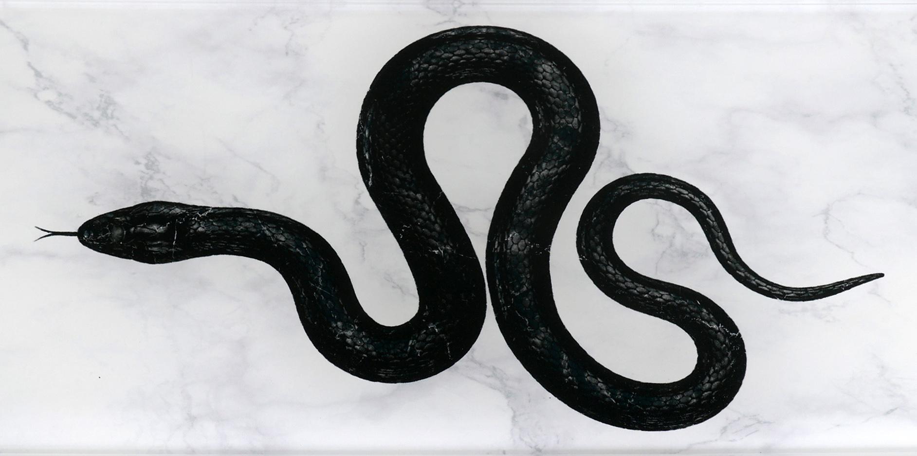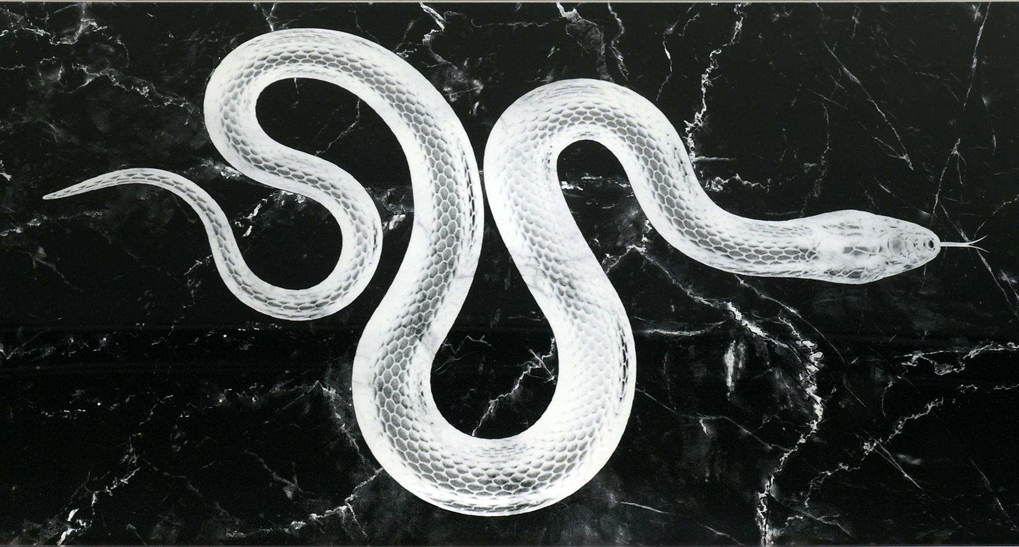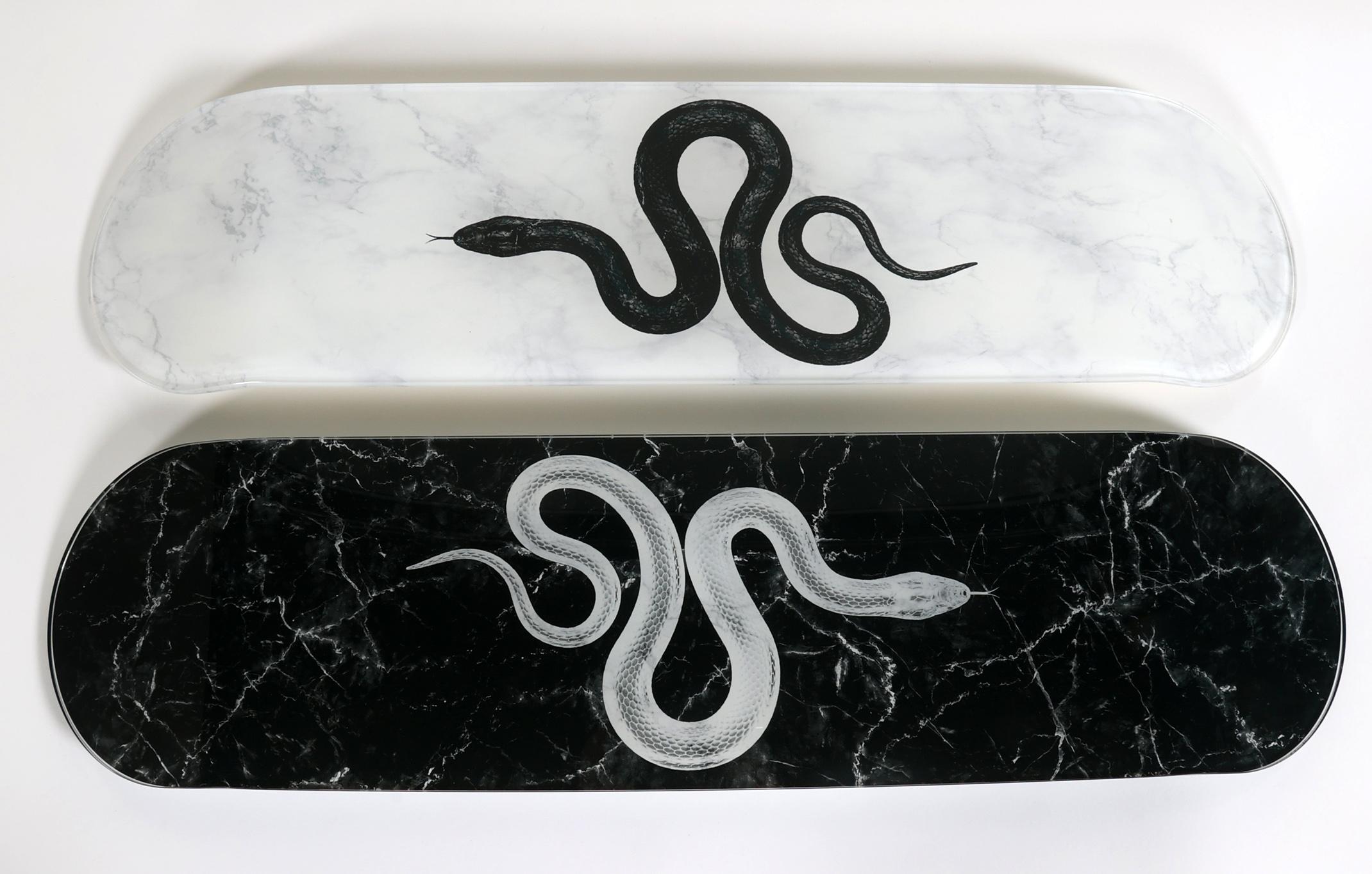 Twee met slangen gedecoreerde skateboards in plexiglas