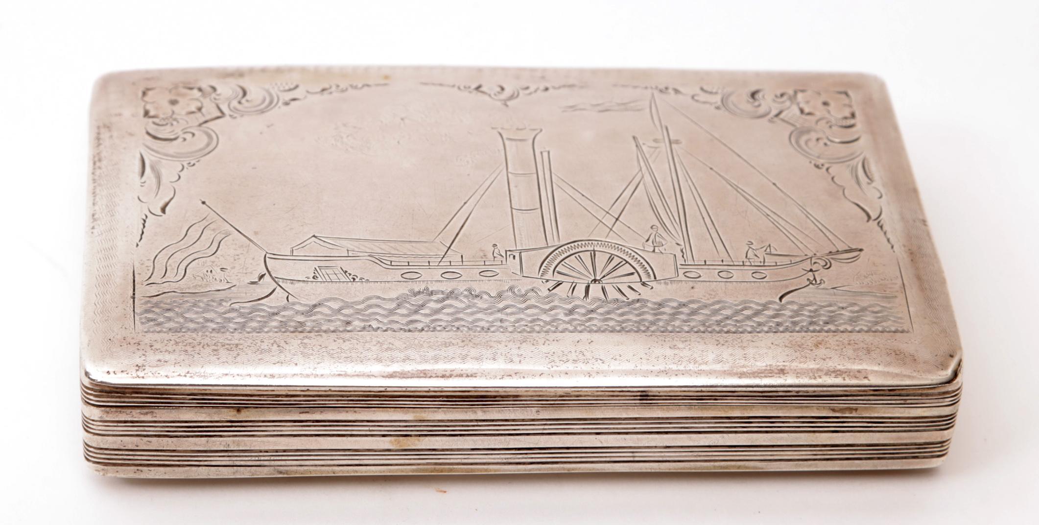 Zilveren tabaksdoos met afbeelding van stoomschip, 19e eeuw, 140 gram