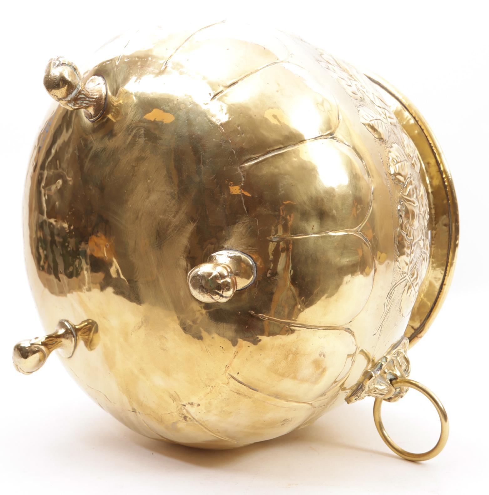 Messing cache-pot geflankeerd door leeuwenkoppen en rustend op klauwpoten, h.30 cm.
