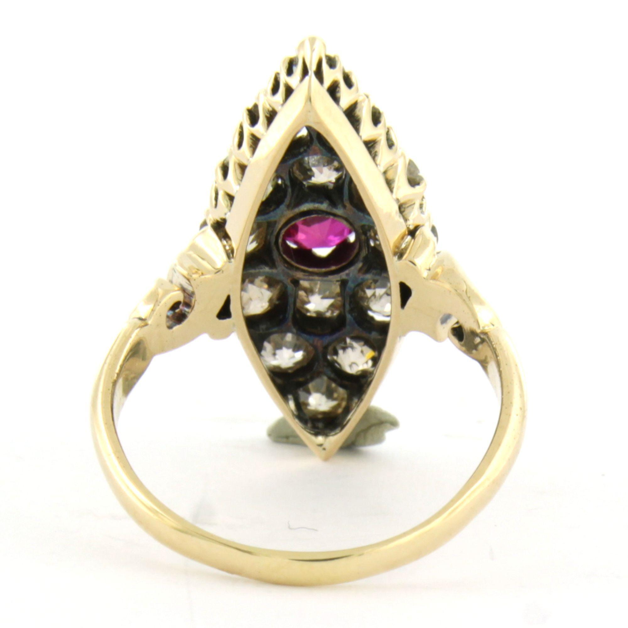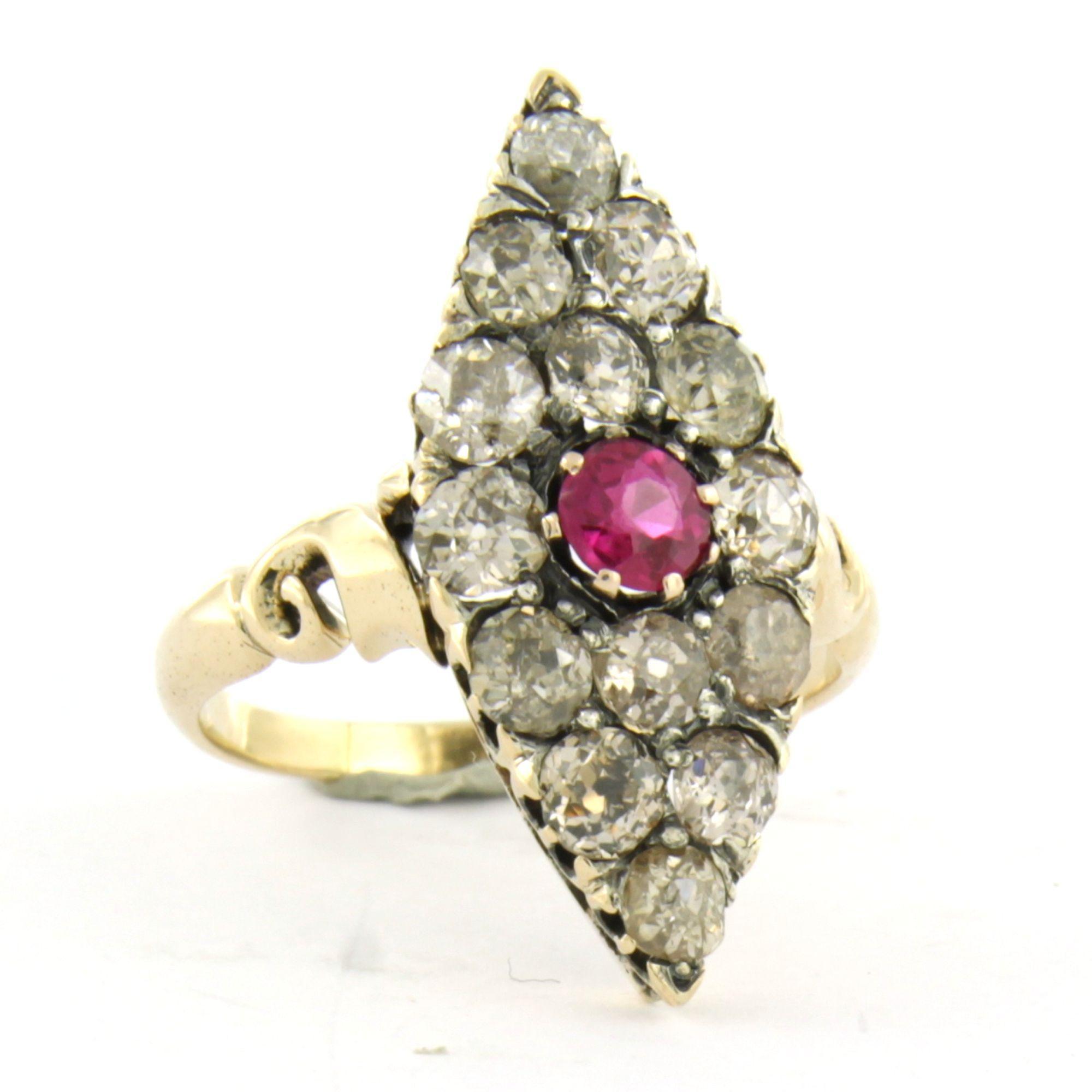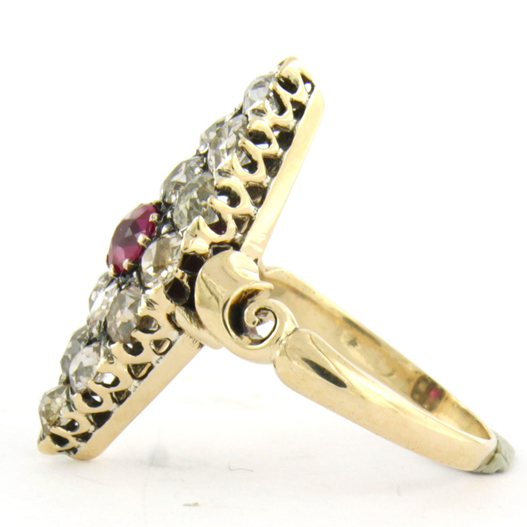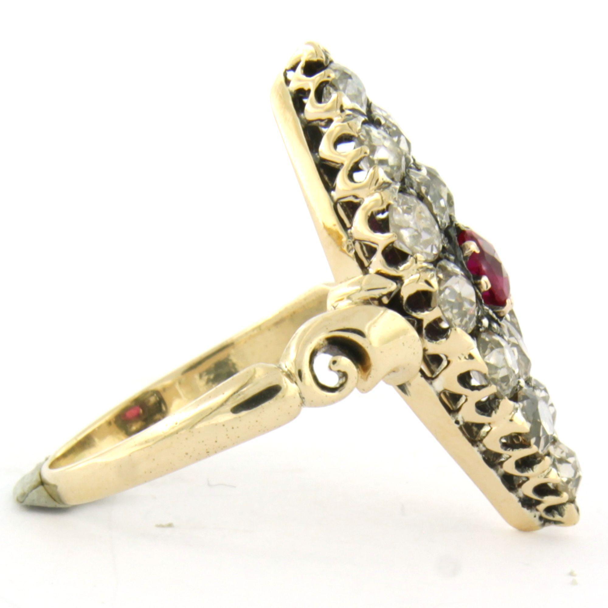 BWG gele ring bezet met centraal een robijn tot. 0.65ct en erom heen old mine cut geslepen diamant tot. 1.20ct – K/L - pique - ringmaat 17(53)