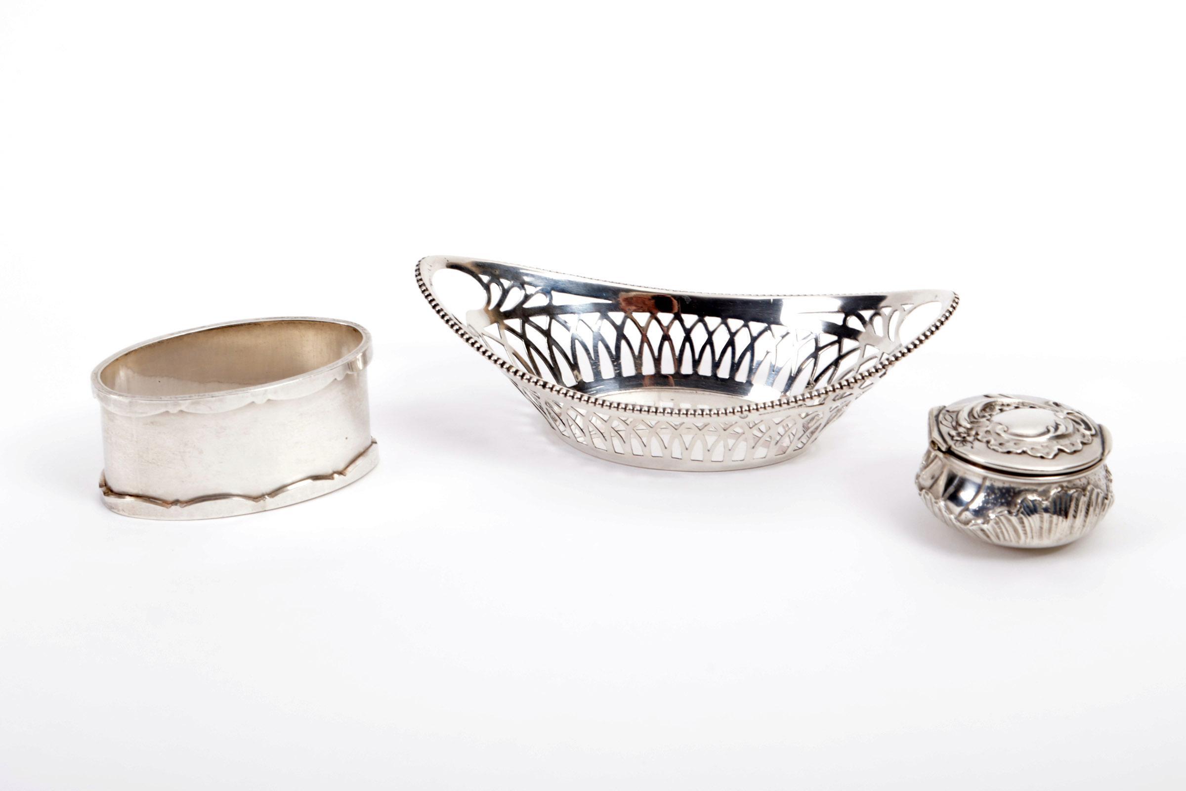 2e Gehalte zilveren bonbonschaaltje, vingerboekbanden en pillendoosje, 101 gram