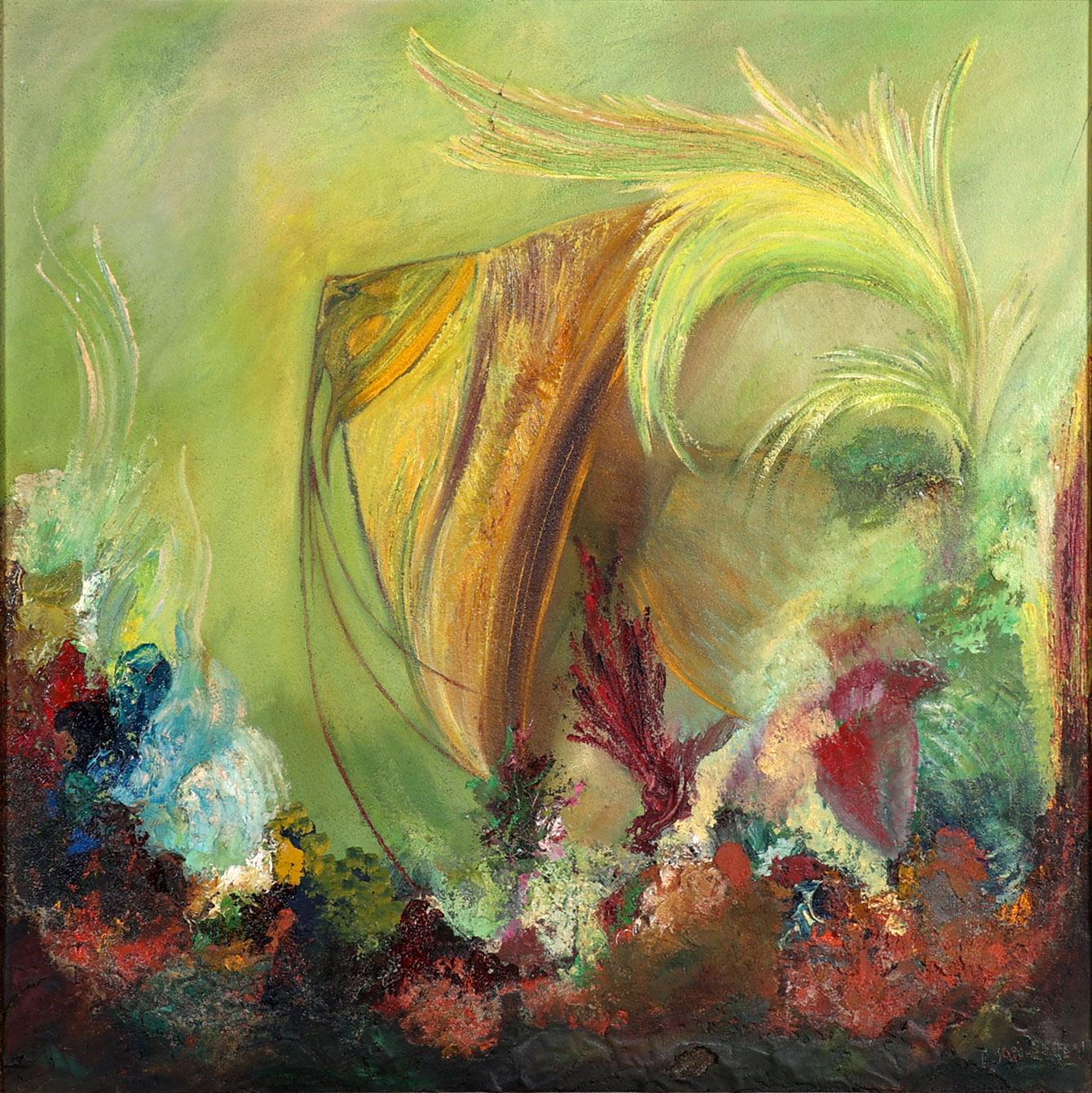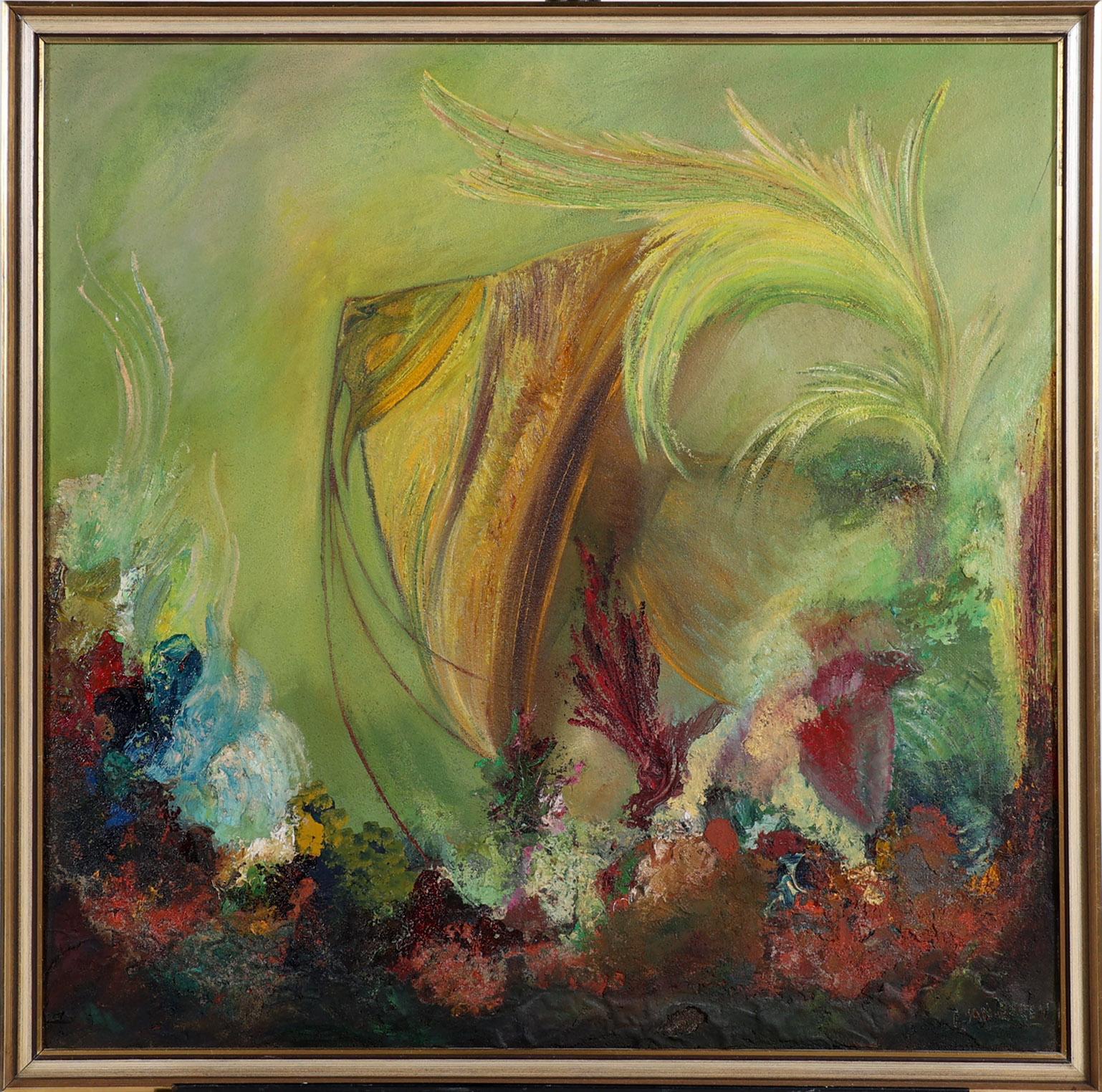 Adrianus jr. (Janus) van Zeegen (1881-1966), Onderwater scene met koraal en visch op de bodem der zee, gemengde techniek op paneel, 77 x 77 cm.