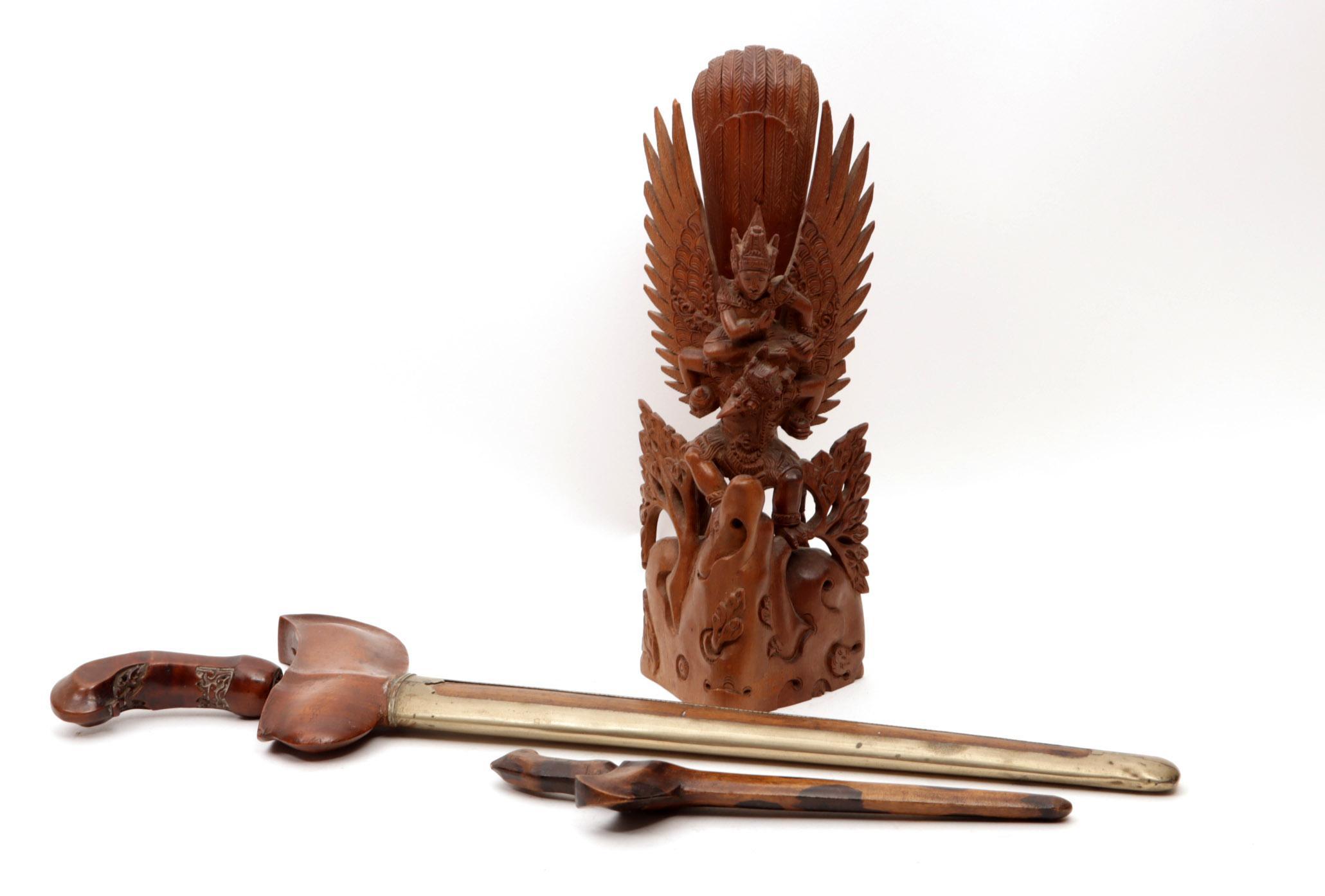 Koopje van een Indonesisch beeld van Garuda en 2 krissen