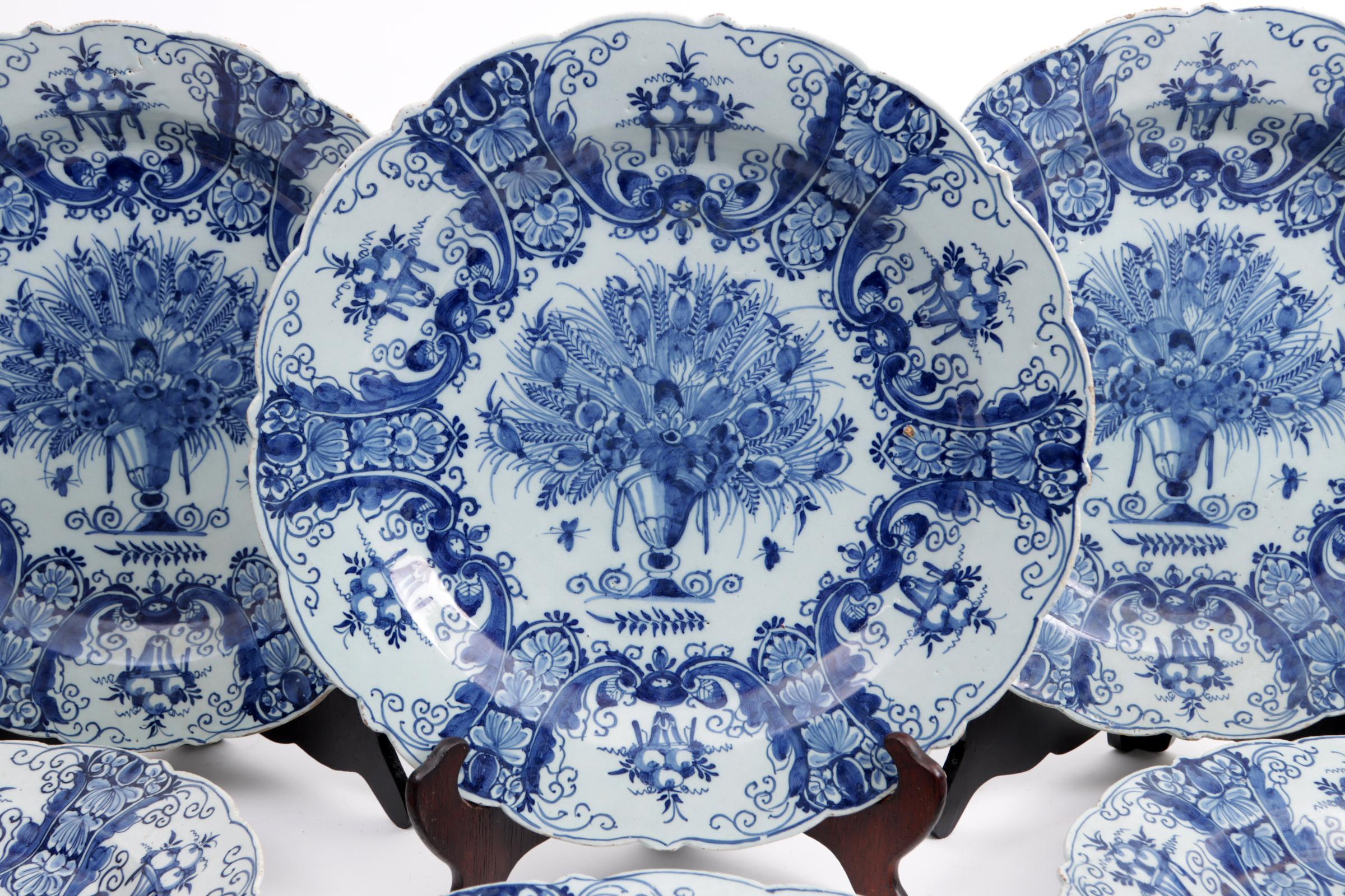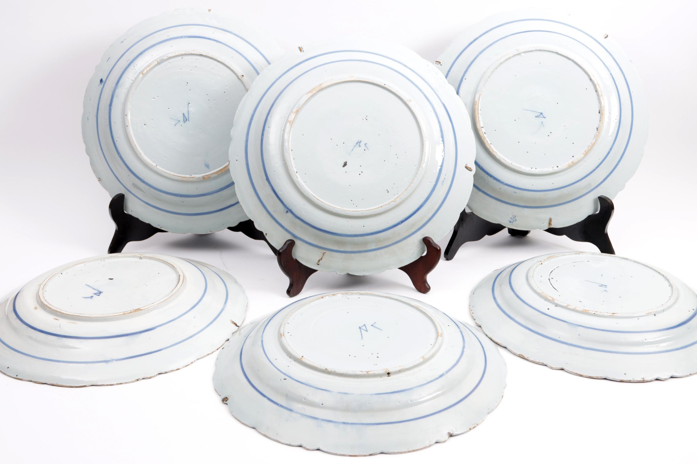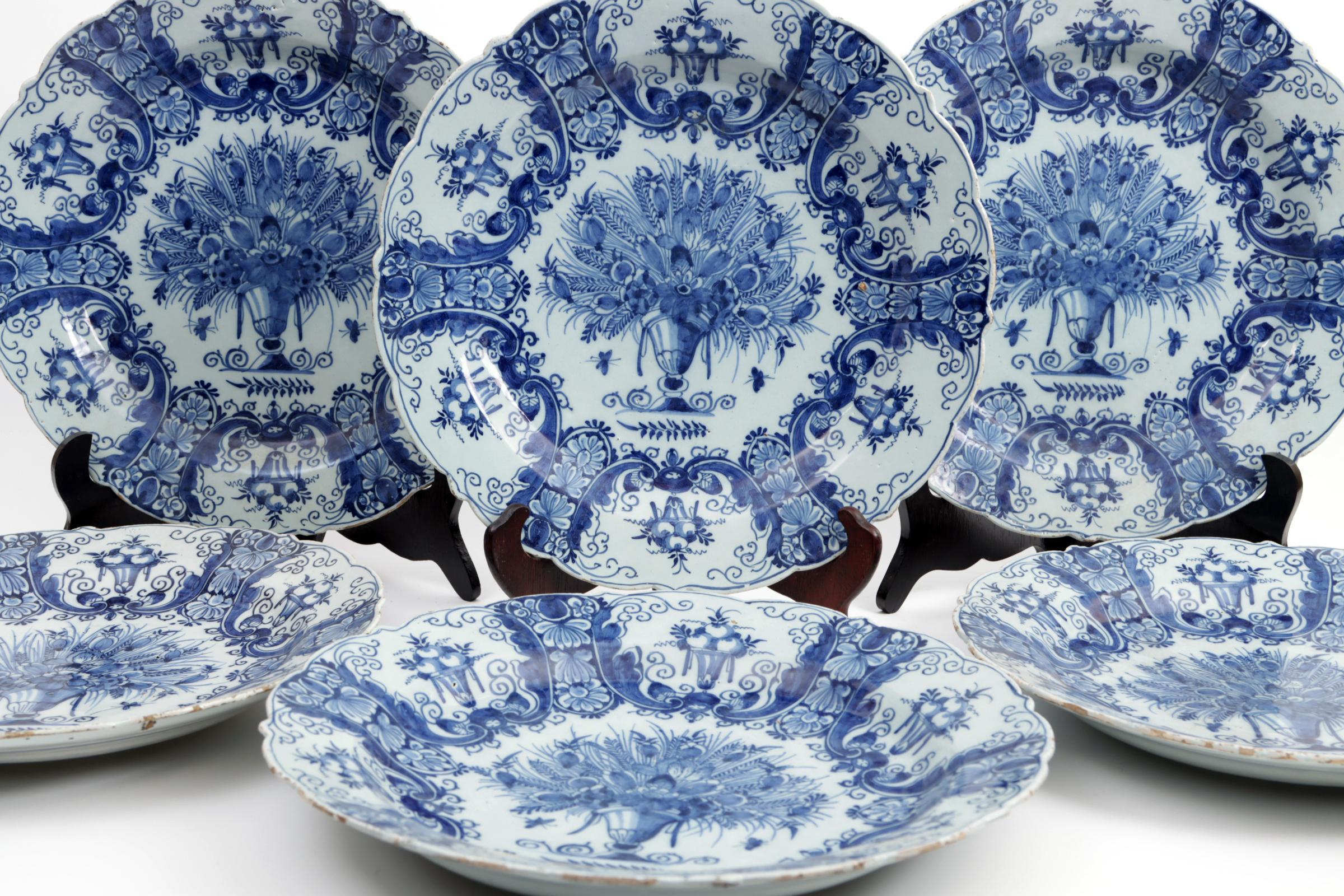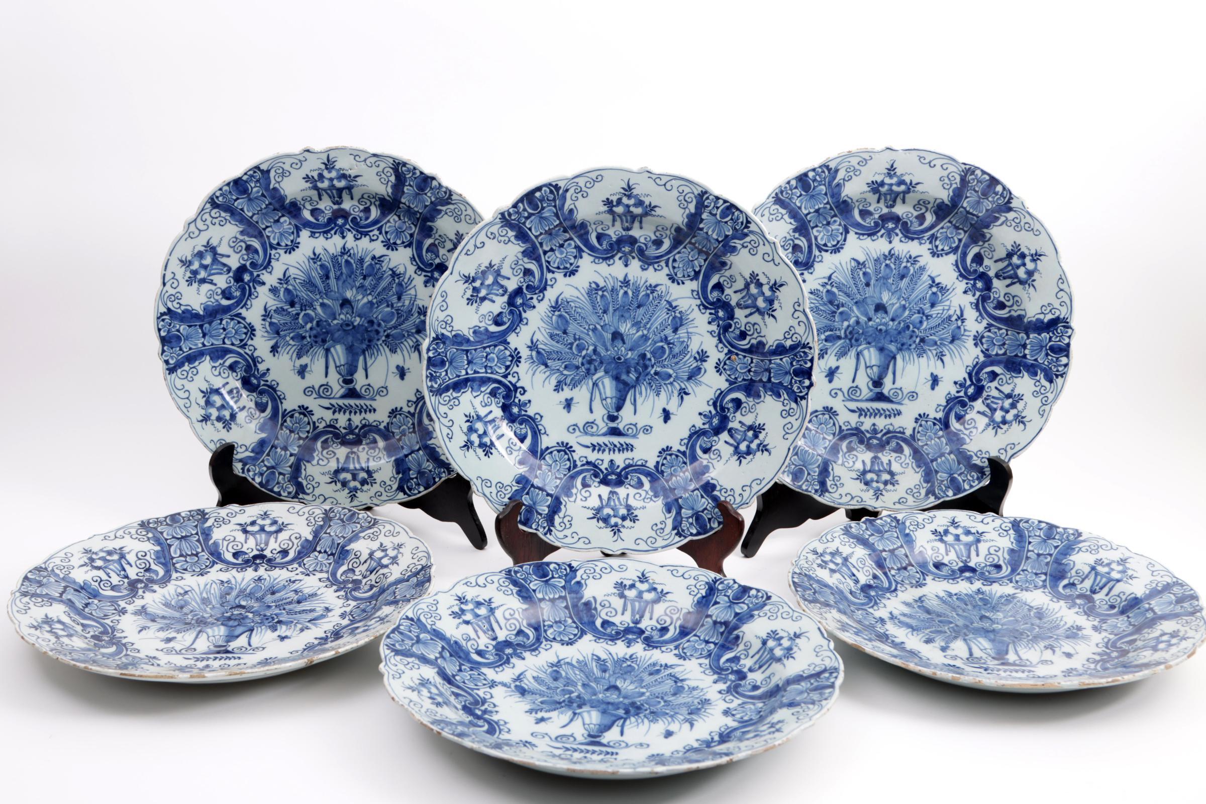 6 Fijn blauw/witte Delftse schotel met pauwenstaartdecoratie, gemerkt Porseleinen bijl, diam. 35 cm., 18e eeuw, diam 35 cm.