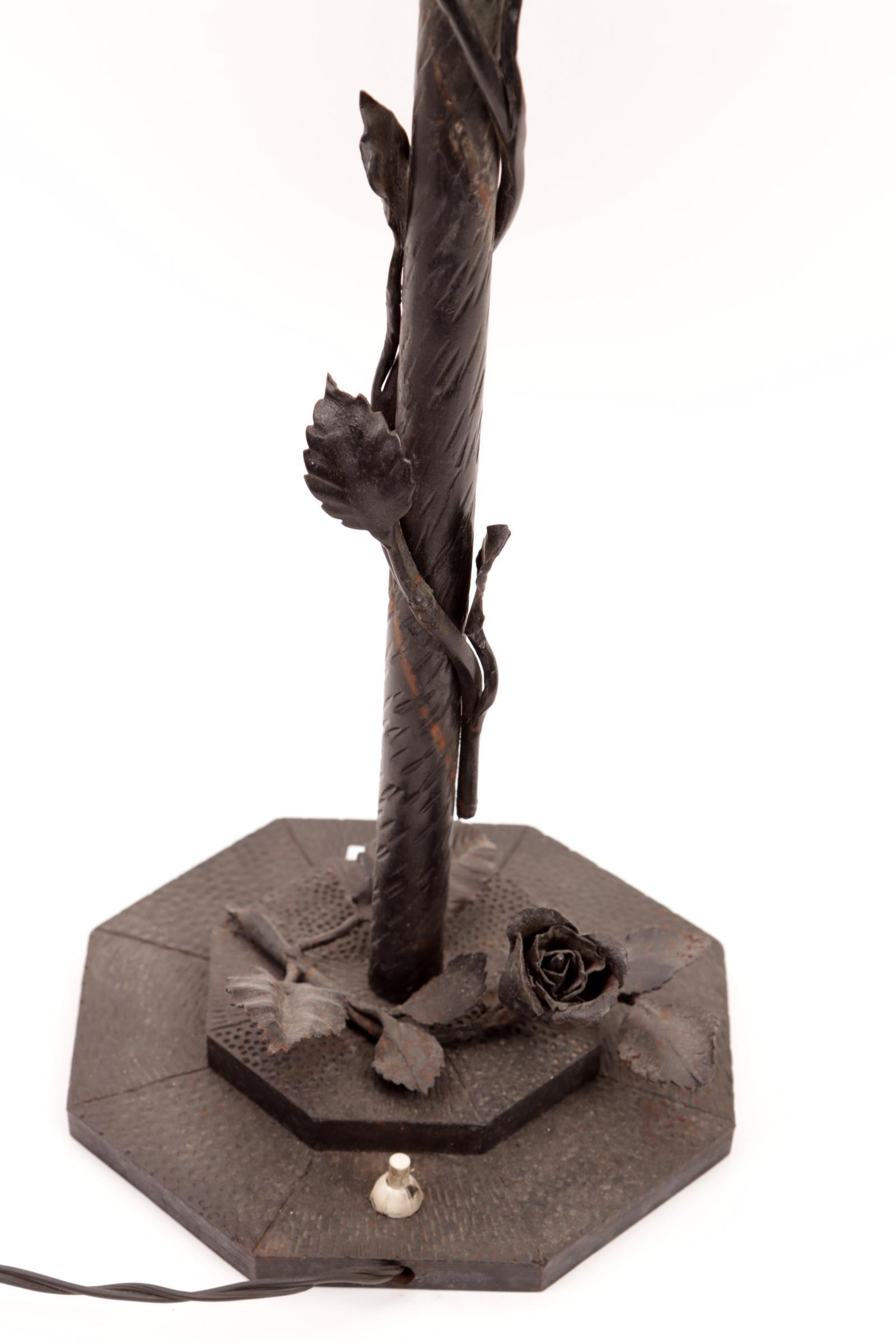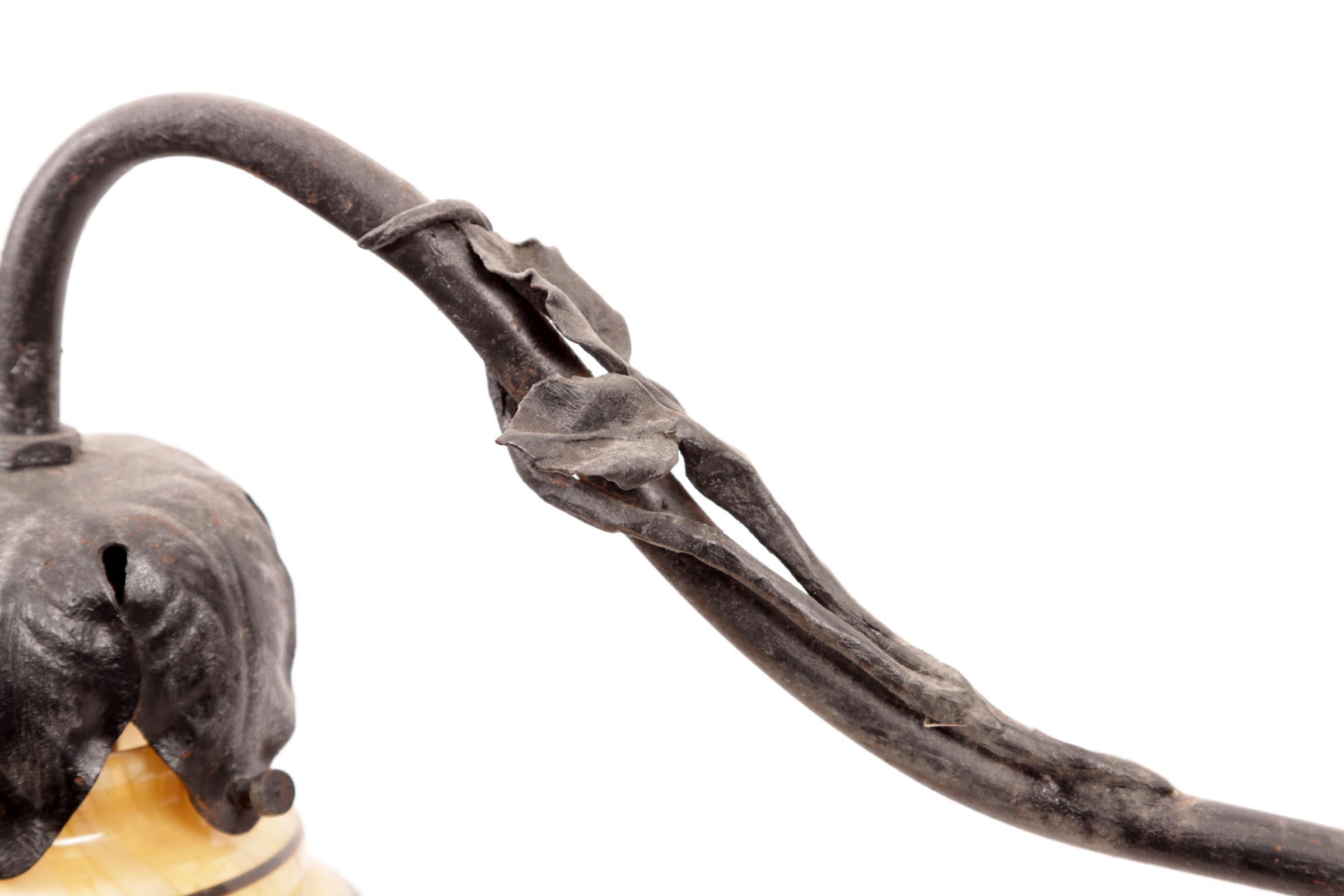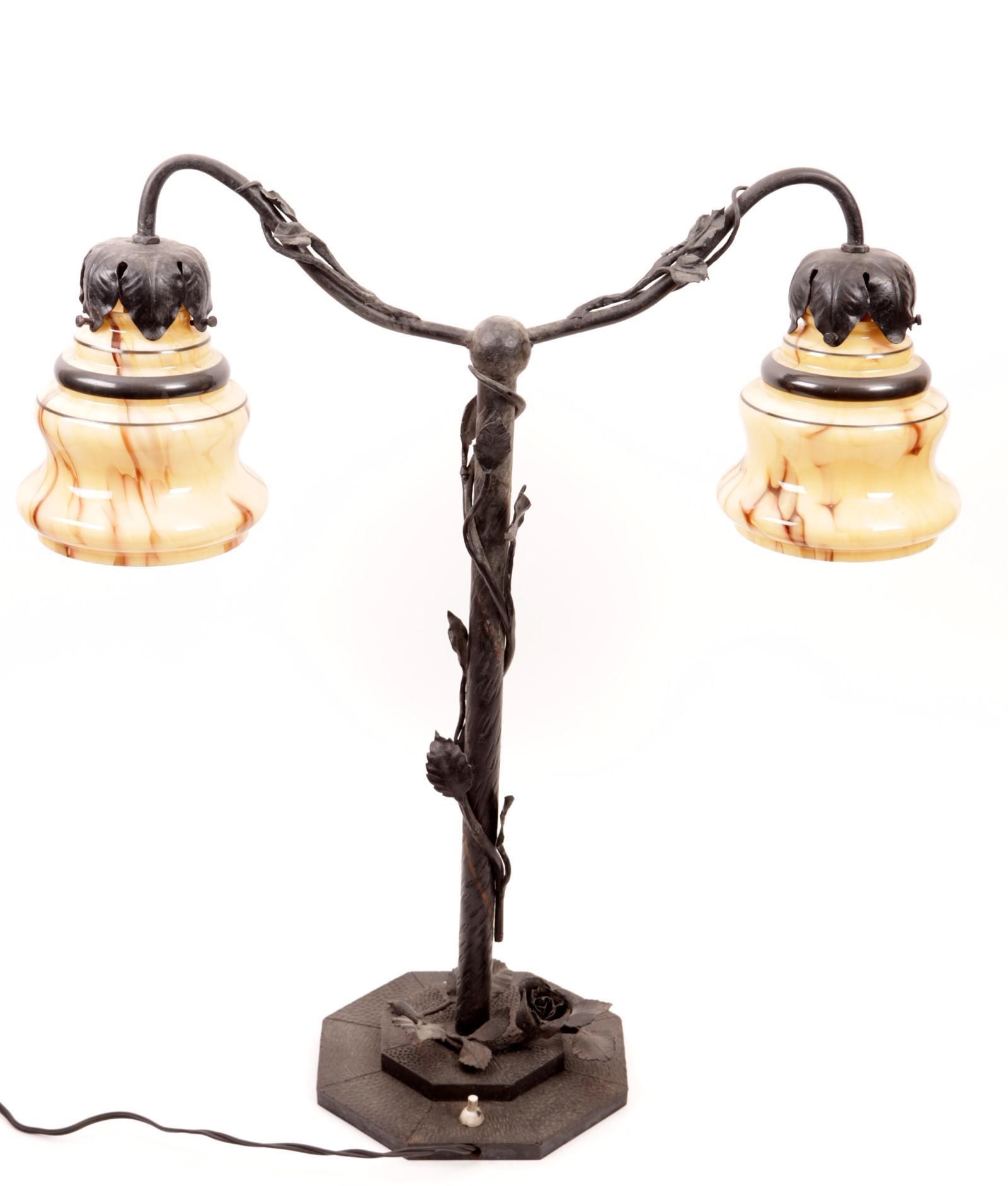 Smeedijzeren tafellamp met glazen kapjes, h.59 cm.
