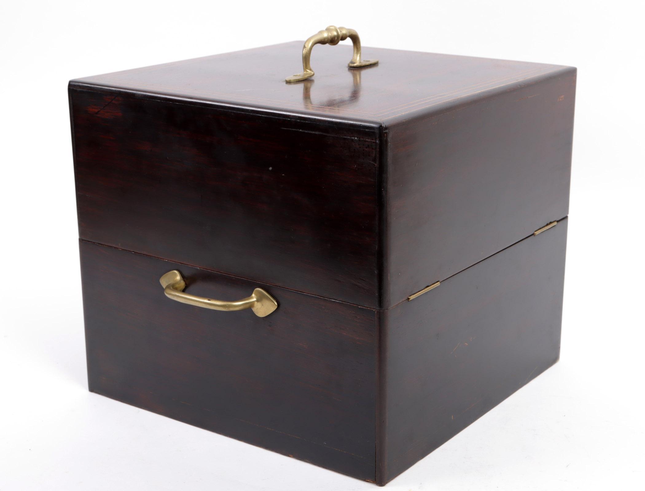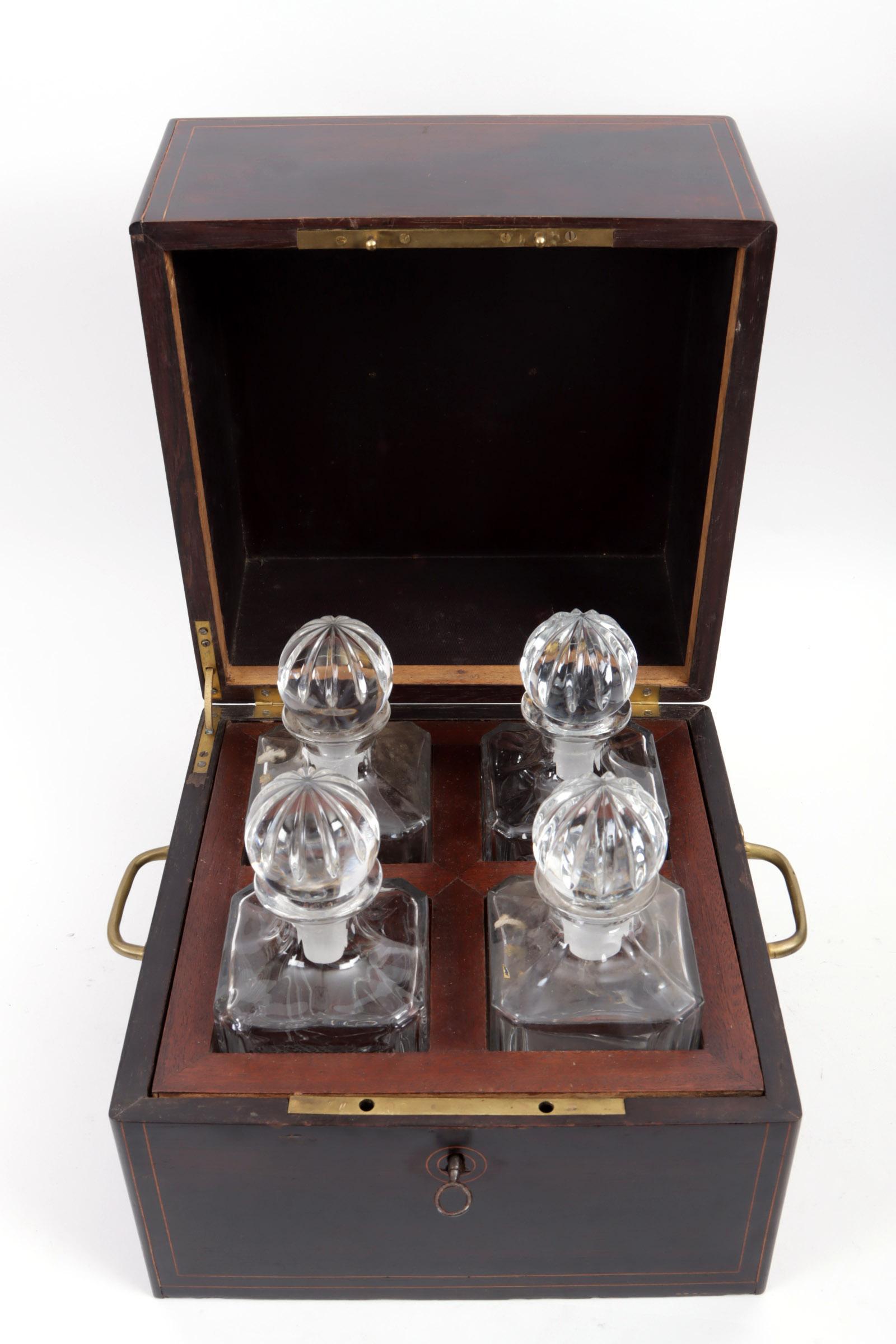 Antieke palissanderhouten likeurkelder met vier kristallen karaffen