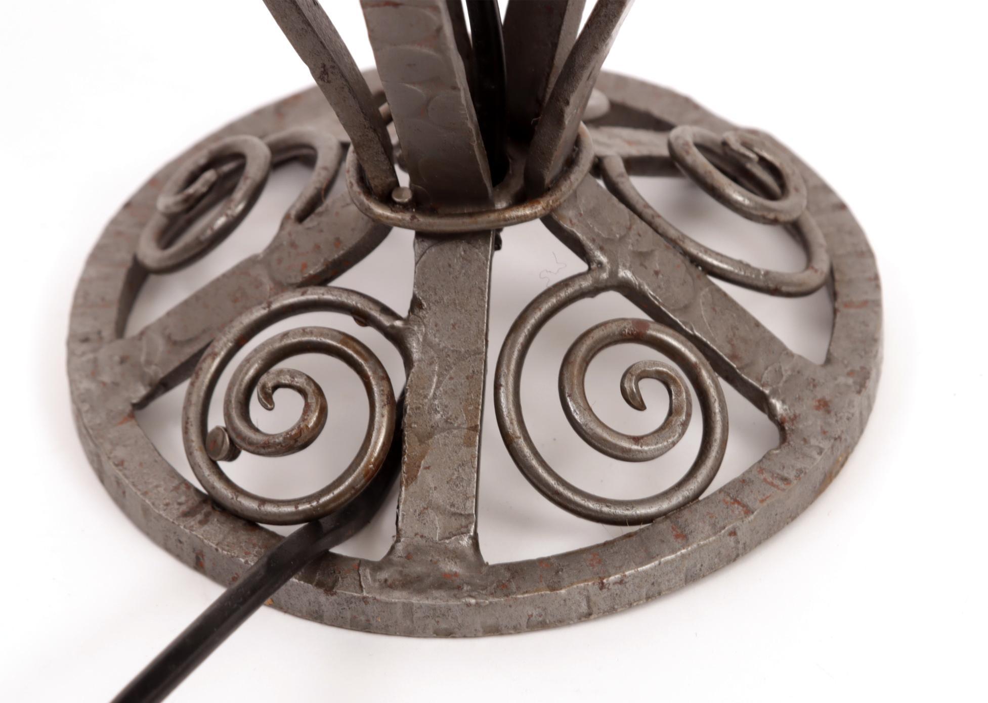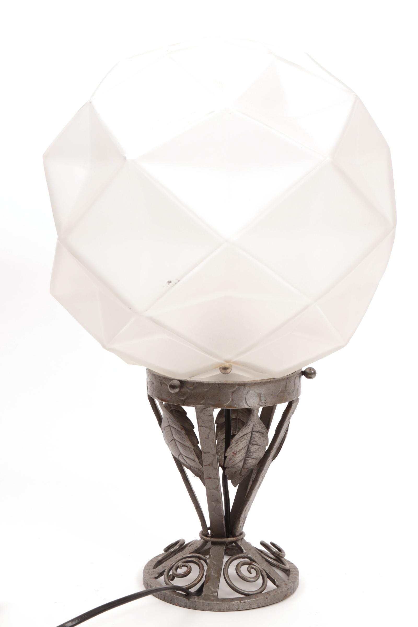 Art Deco tafellamp op smeedijzeren voet met gesatineerd glazen bol in hoog reliëf, h.42 cm.