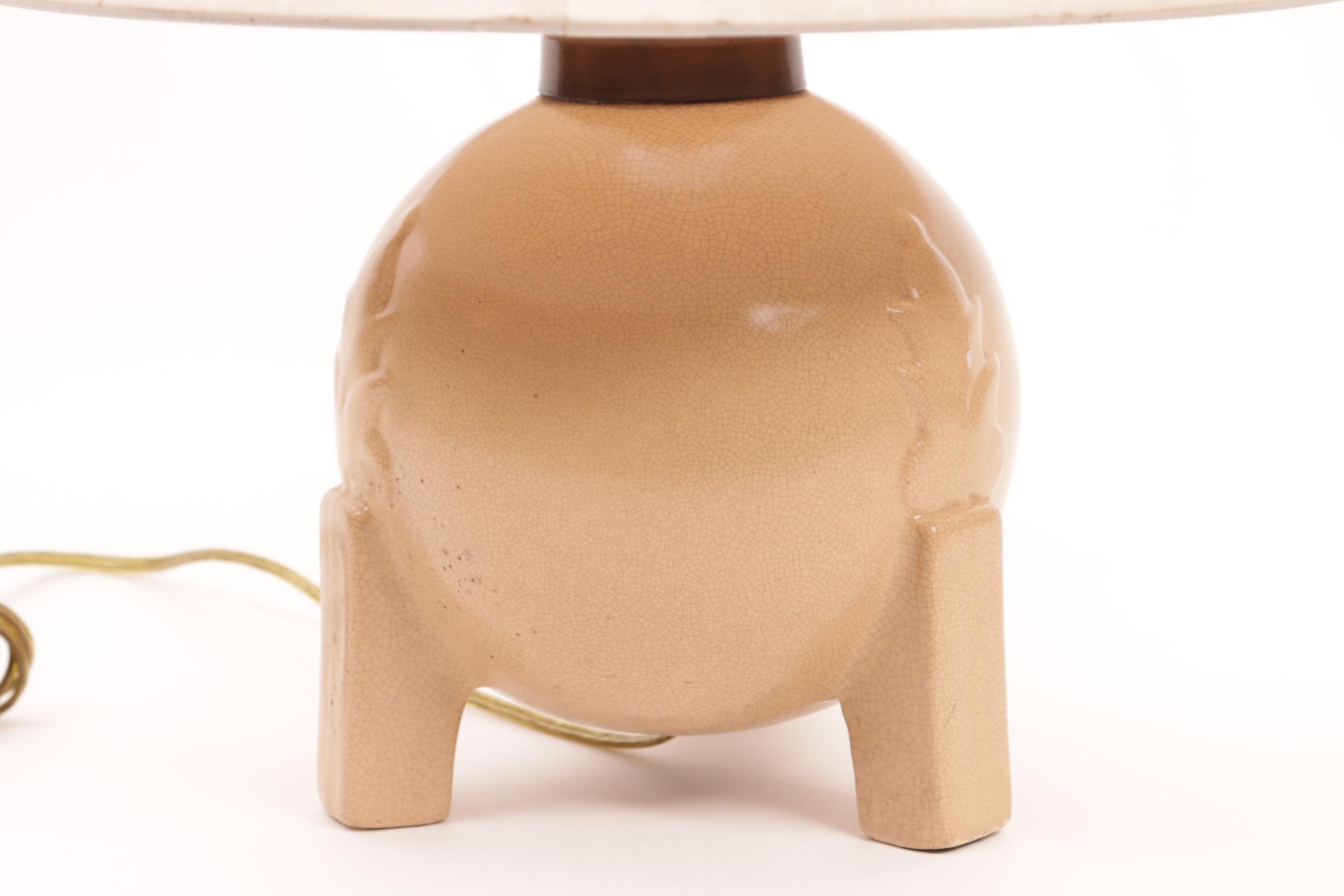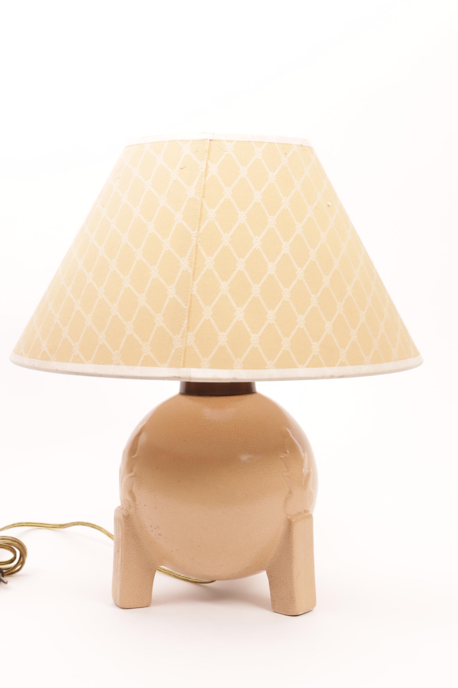 Art Deco tafellamp op crèmekleurig aardewerk voet met stoffen kap, h.38 cm.