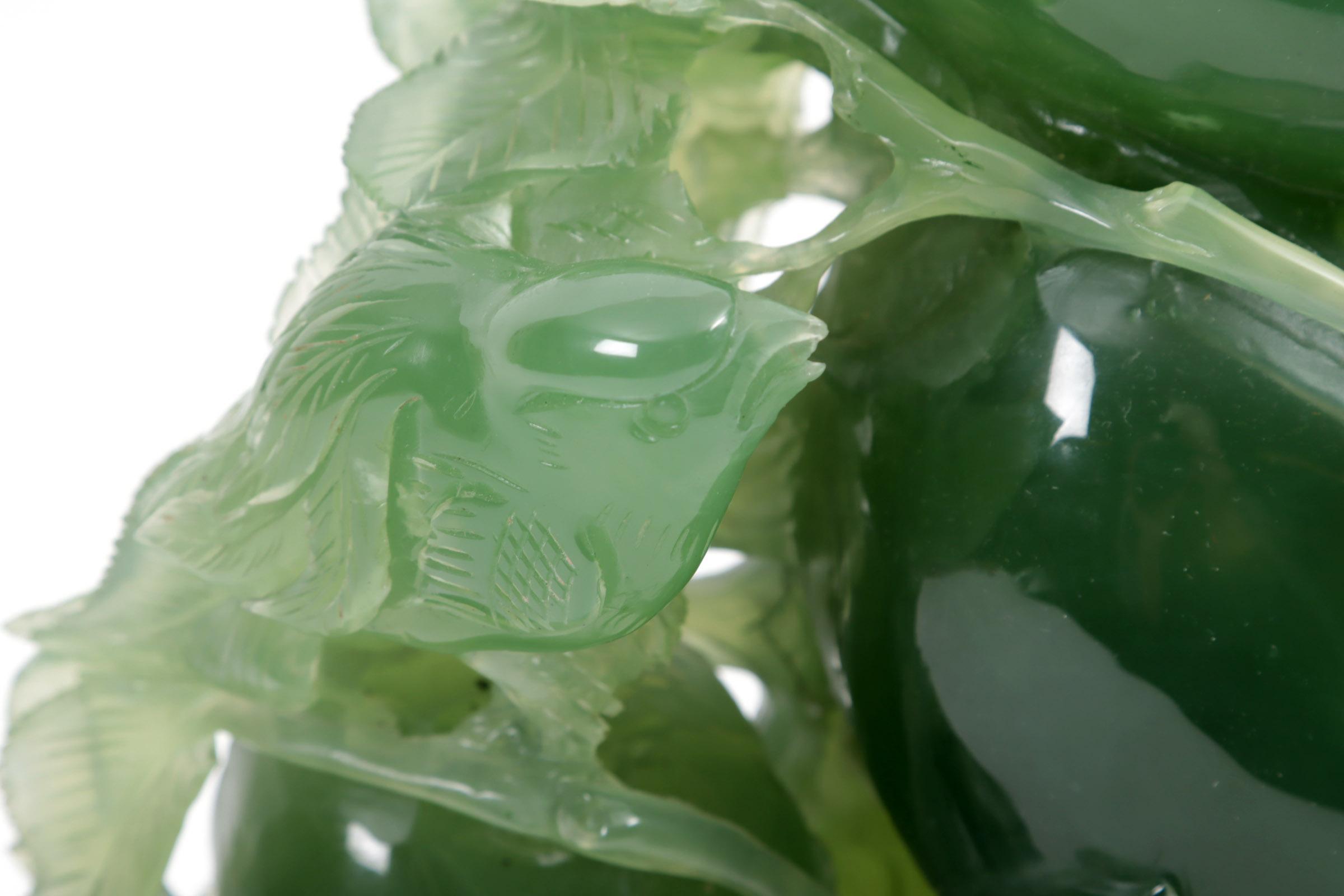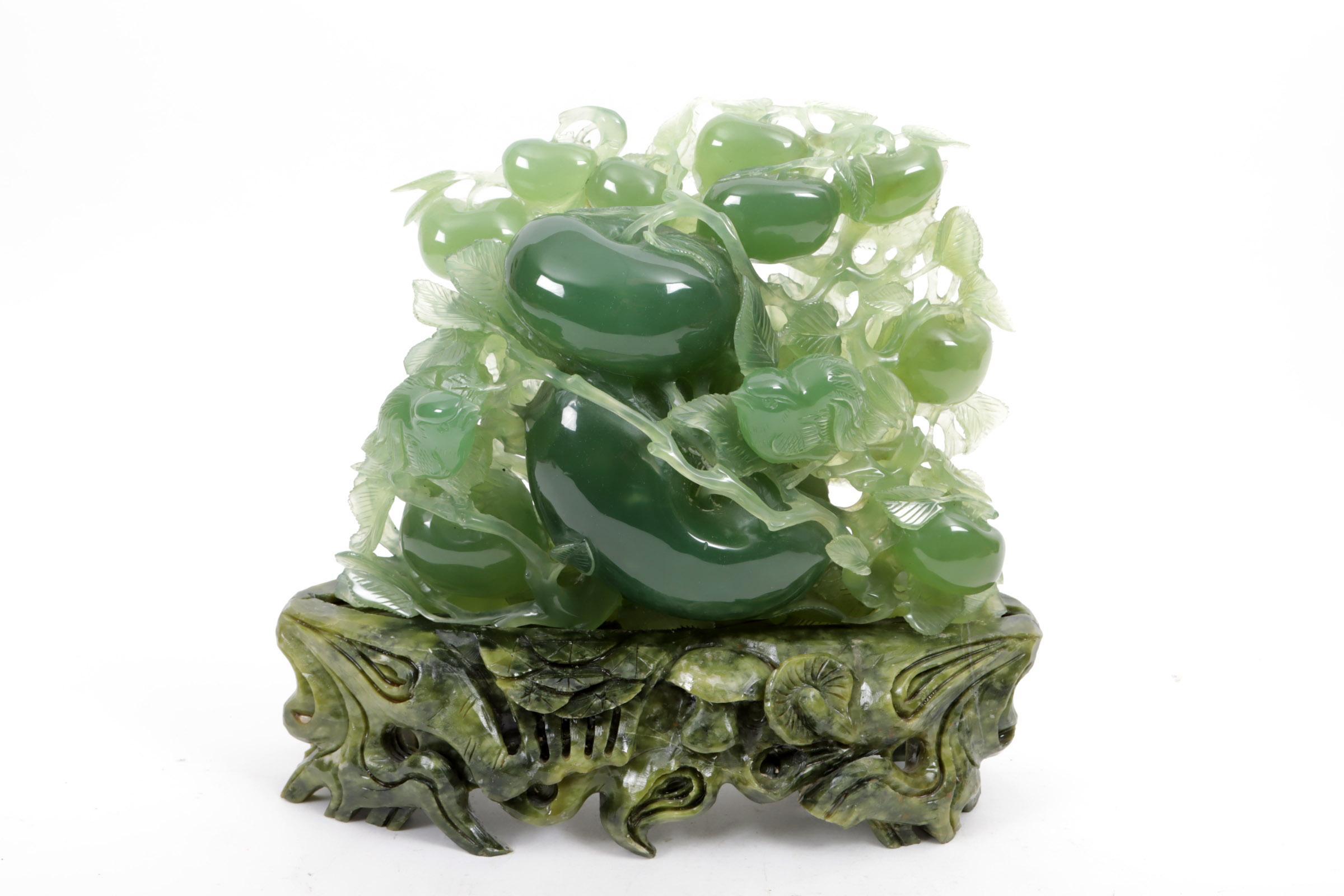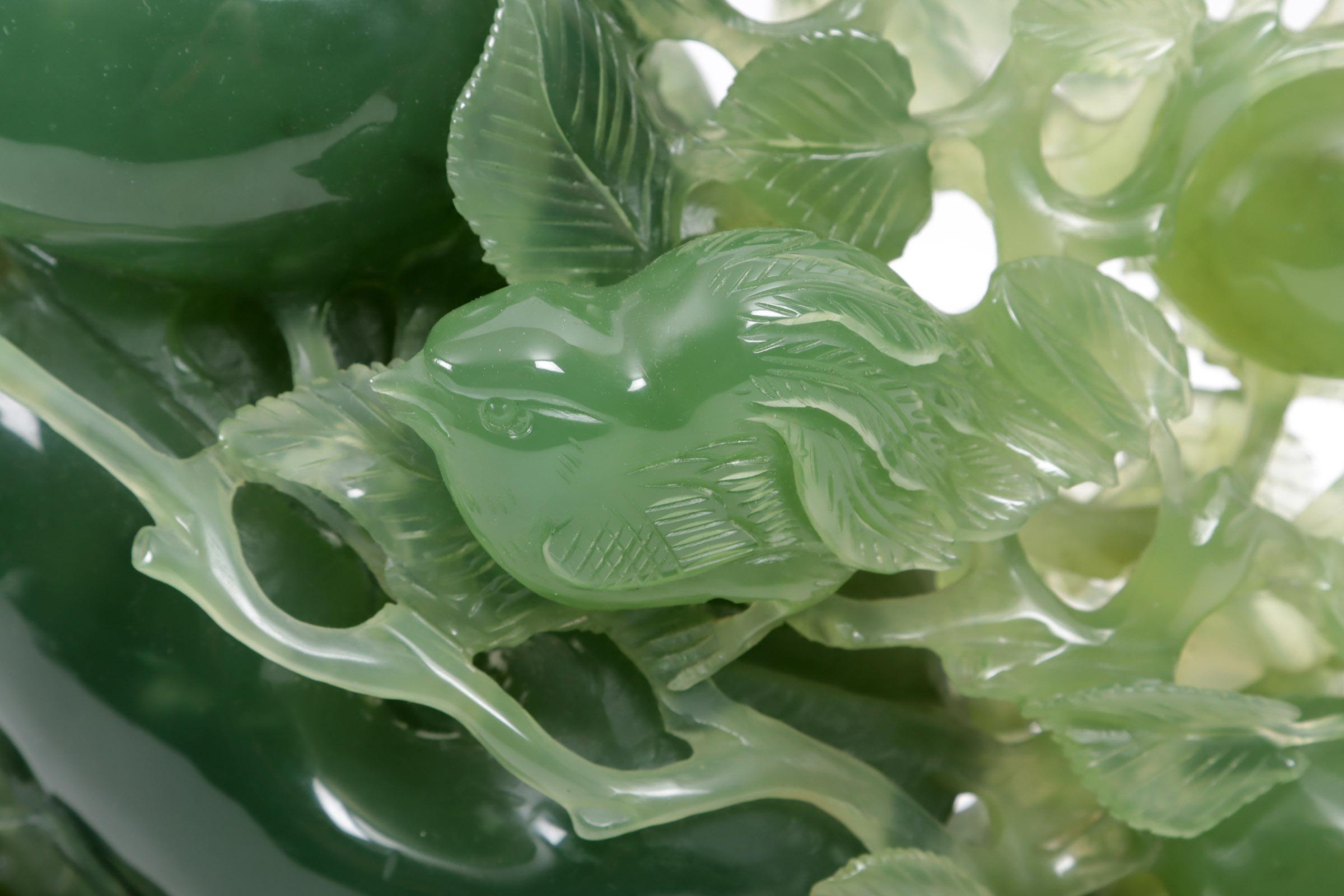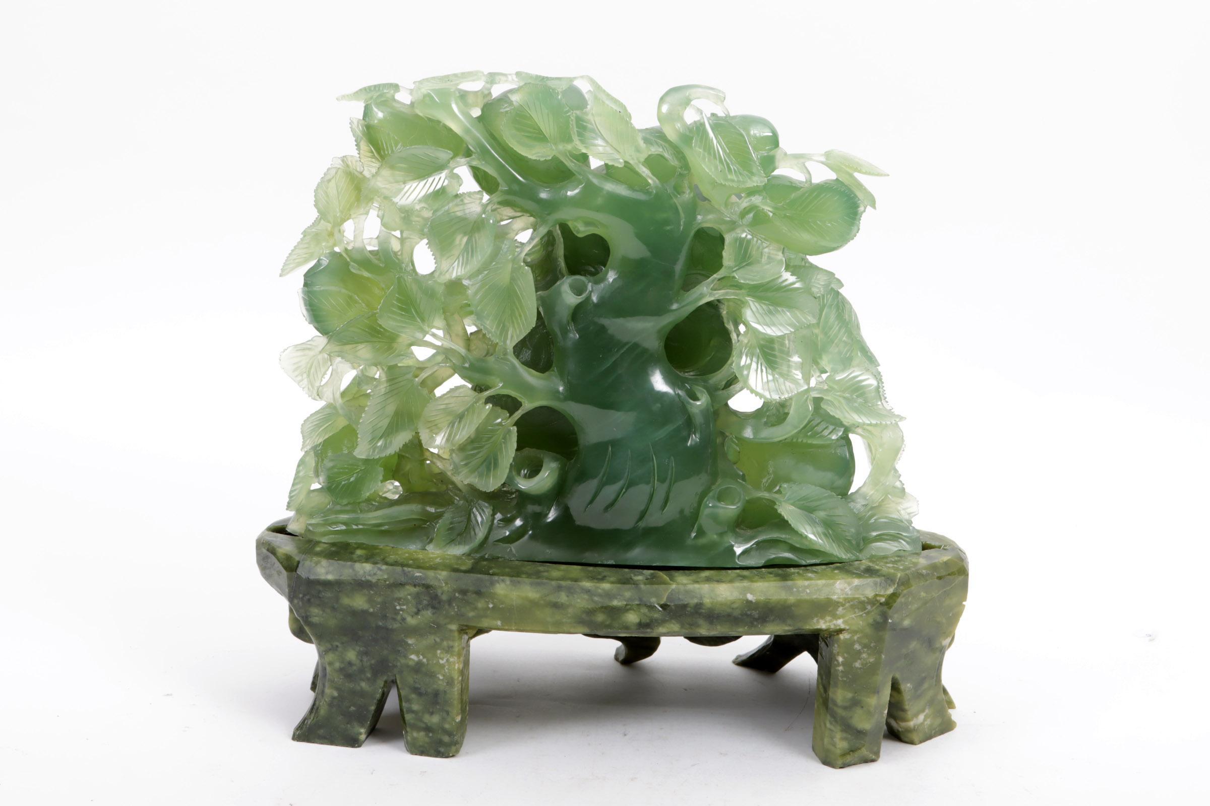 Groen serpentijn snijstuk met decoratie van vogels en appels, h.32 (incl.sokkel) x b.35 x d.15 cm.