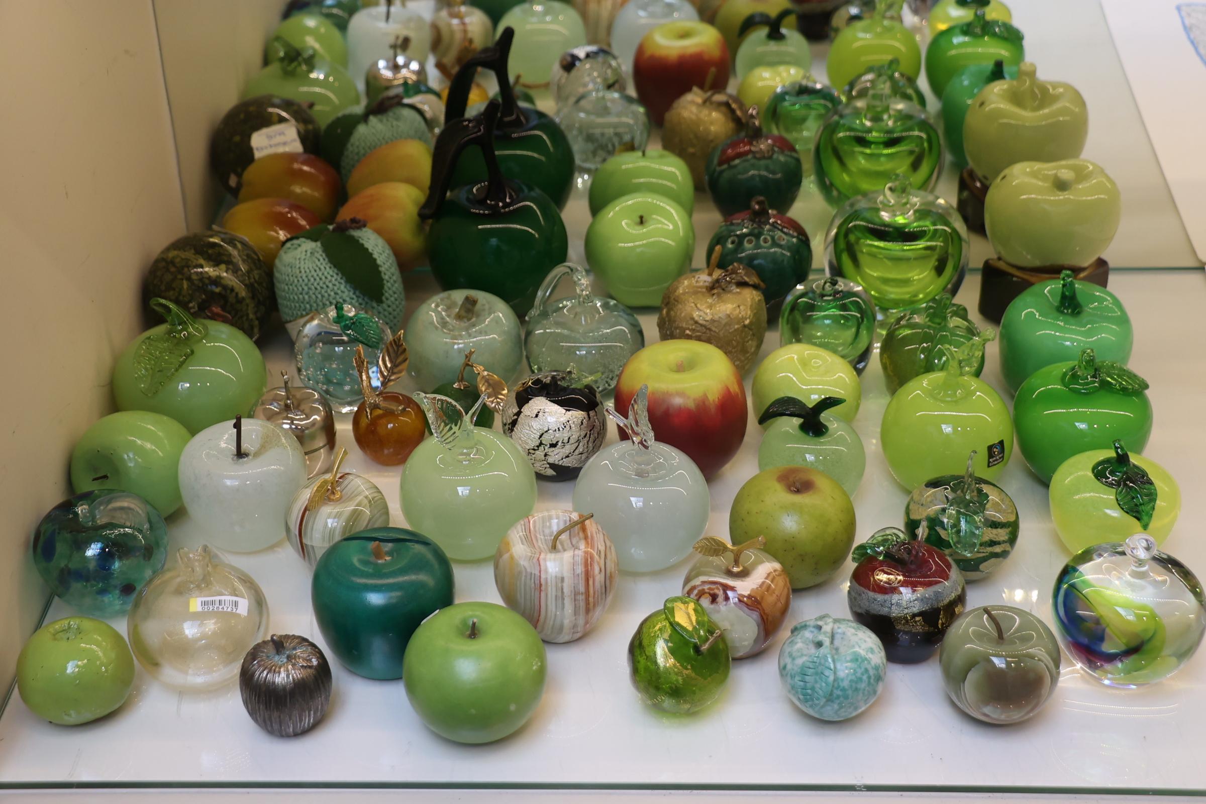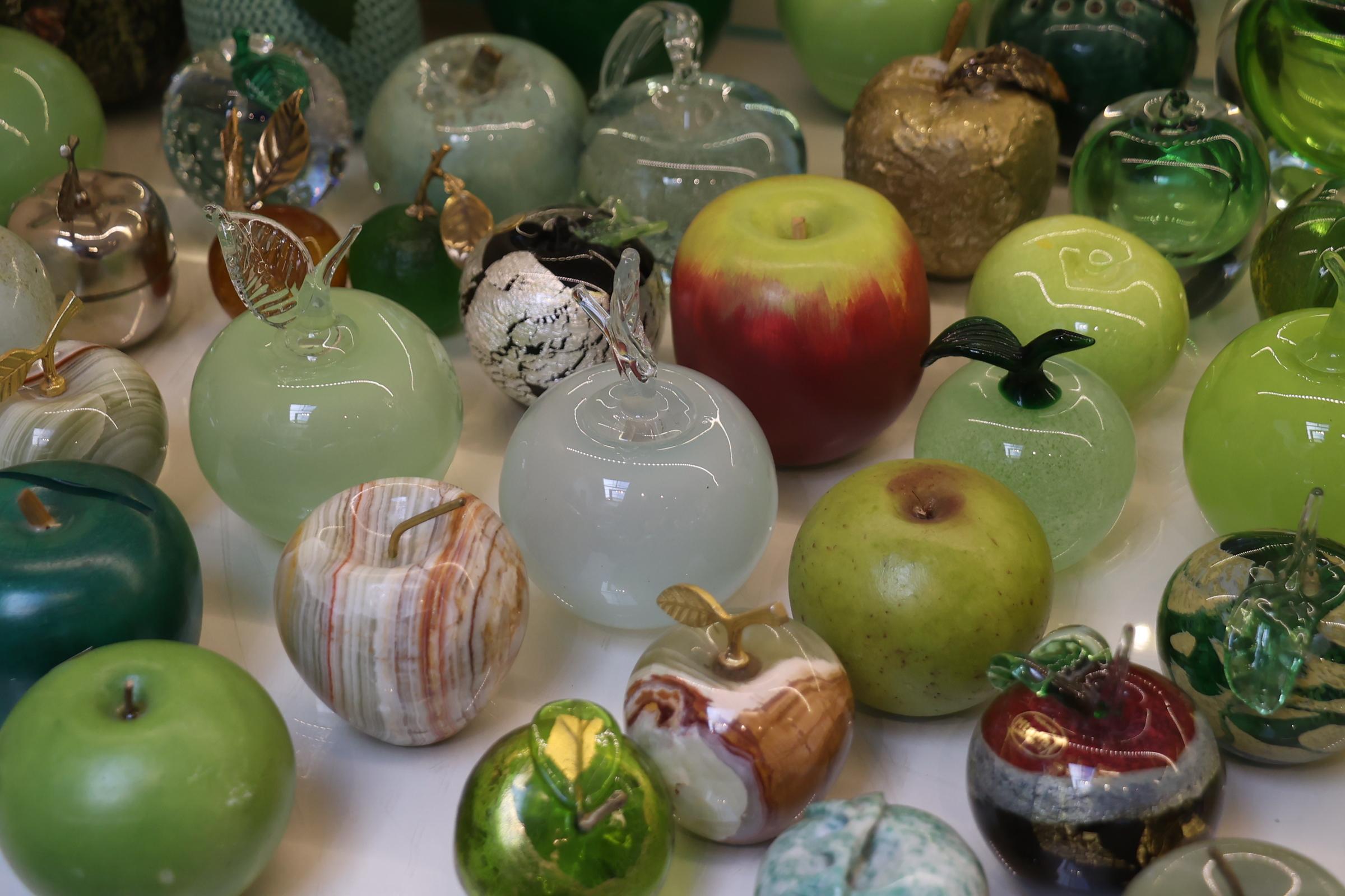 Koop met diverse materialen gecreëerde appelsculpturen, etc.