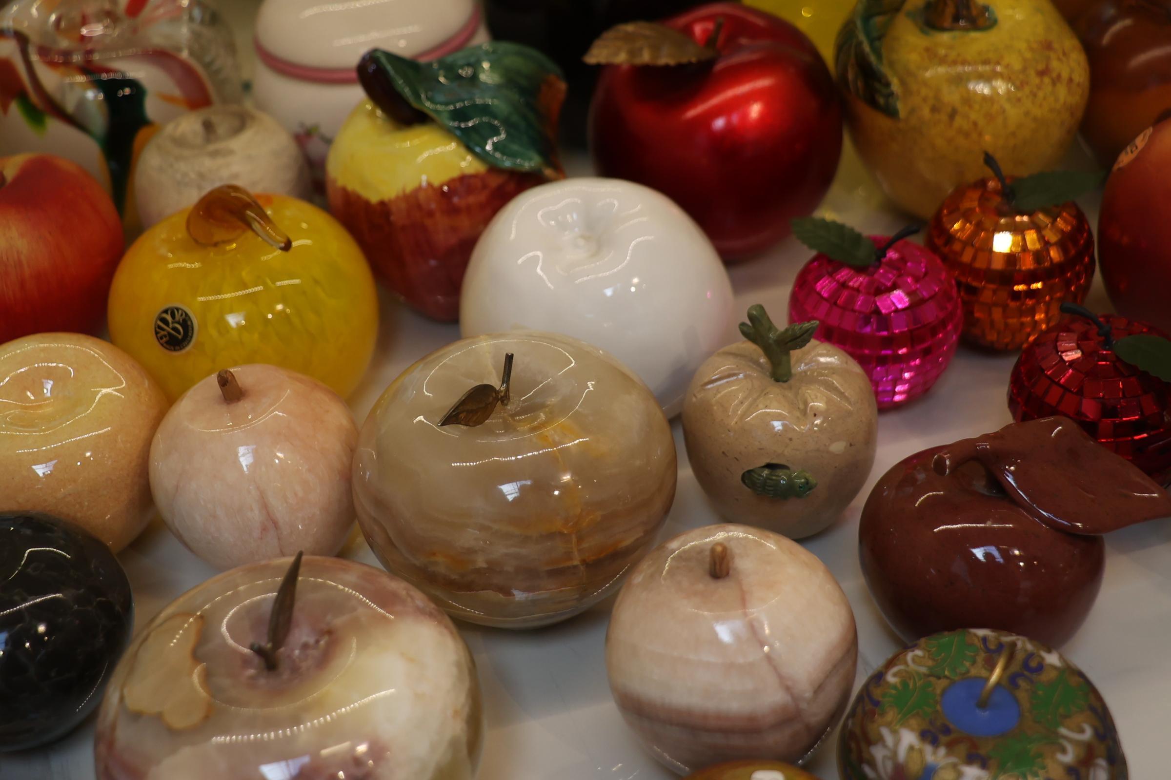 Koop met diverse materialen gecreëerde appelsculpturen, etc.