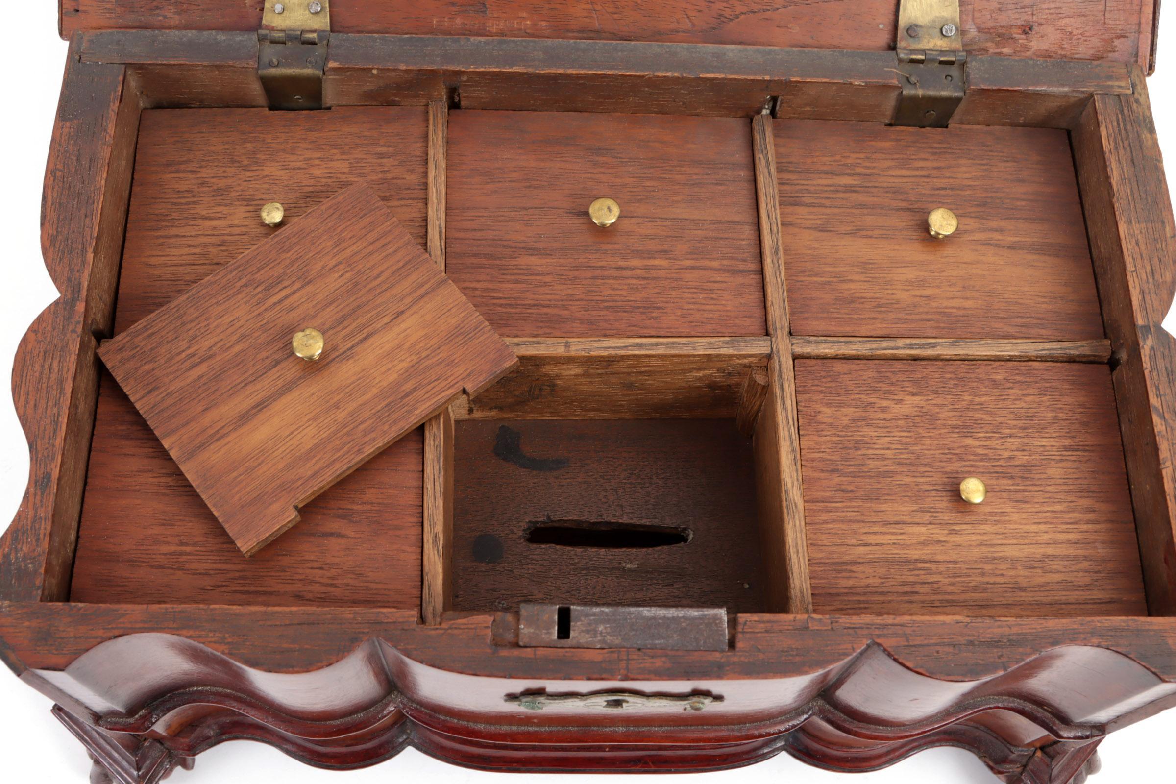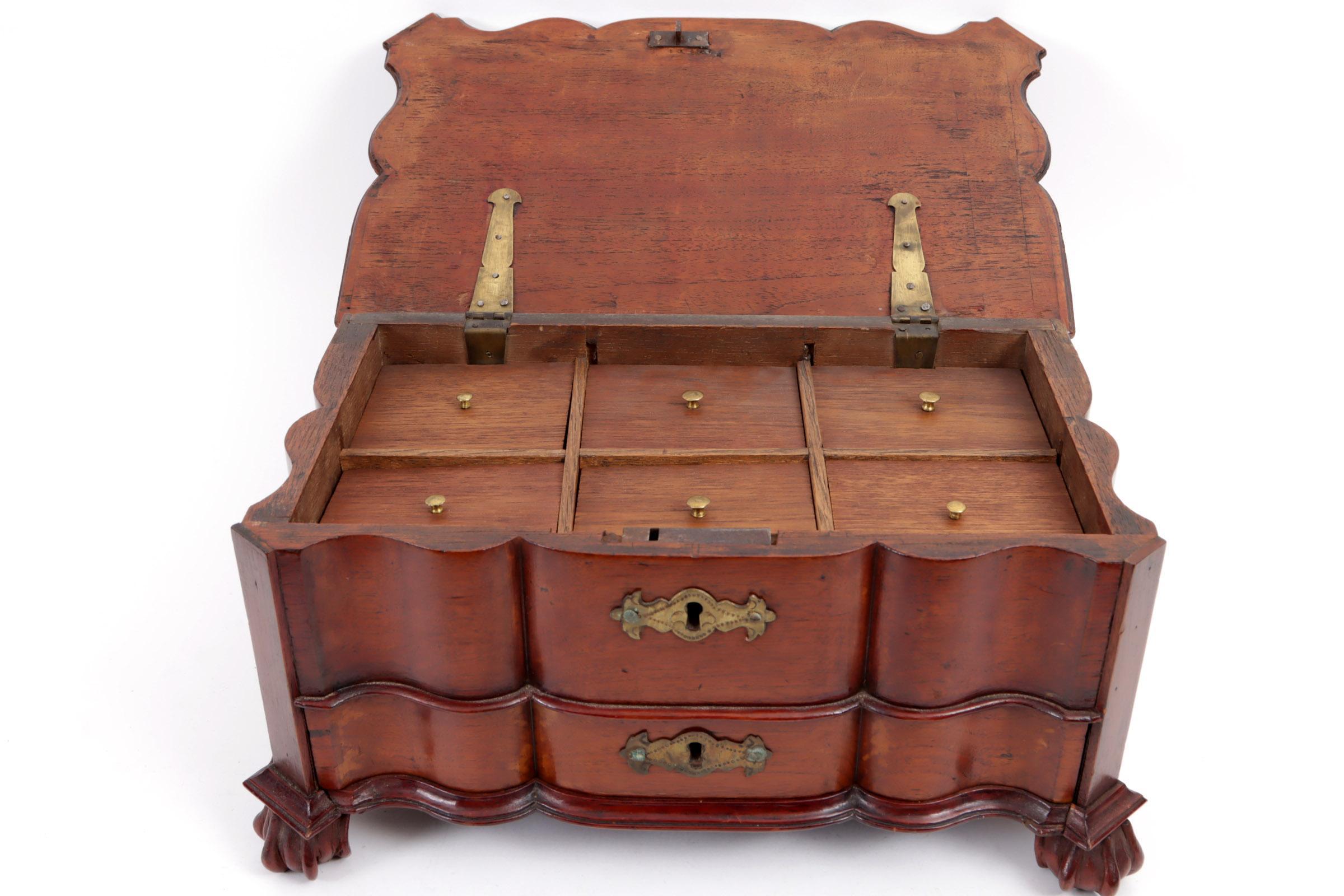 Antieke mahoniehouten bijouteriekist op klauwpoten, h.19 x b.38 x 23 cm.