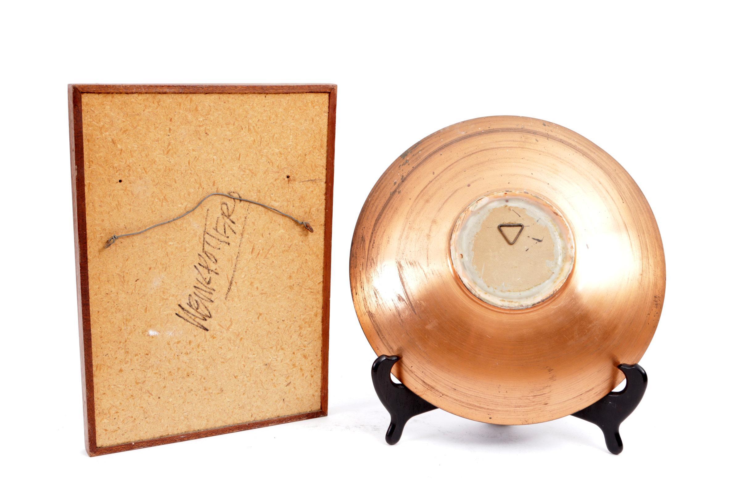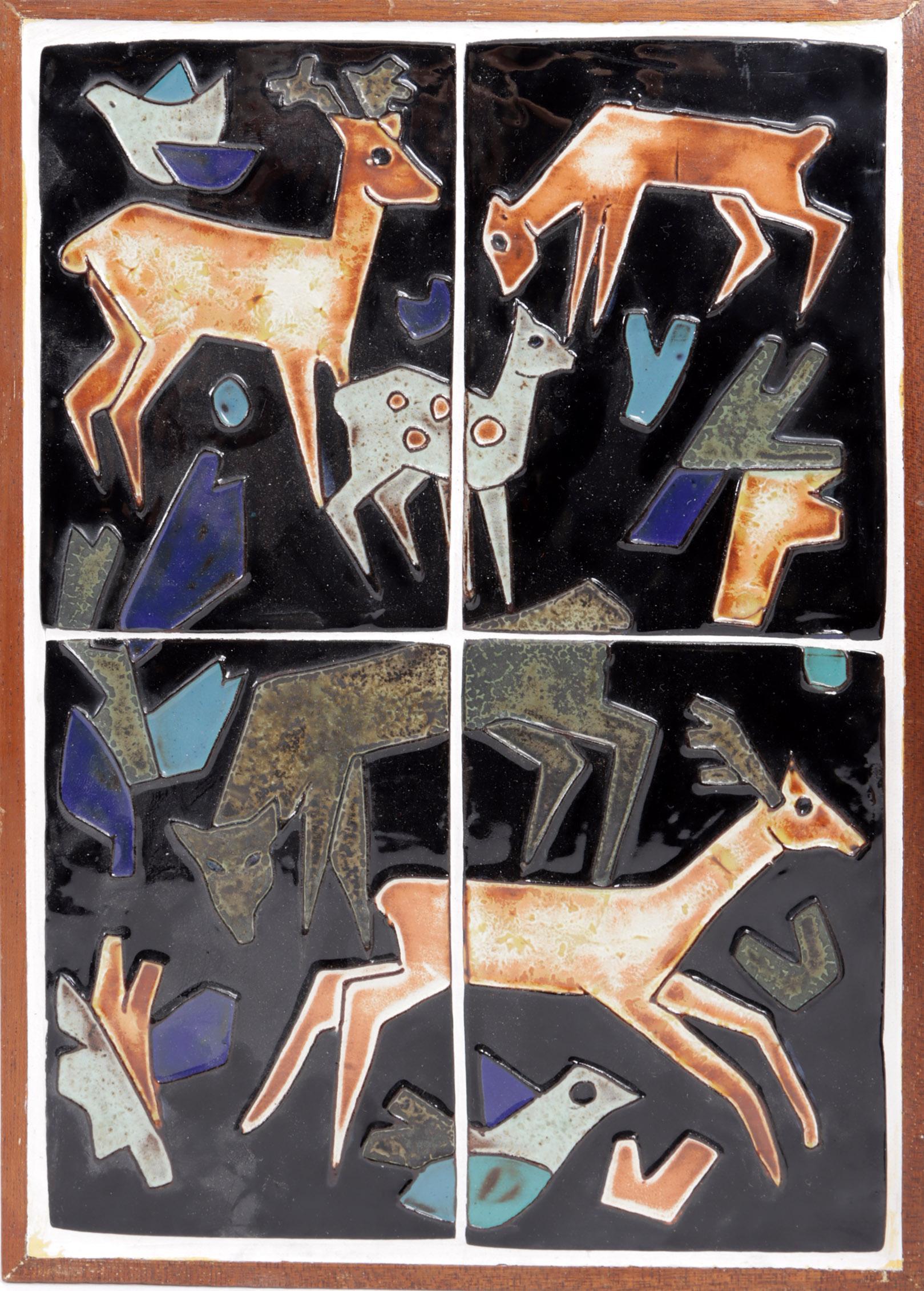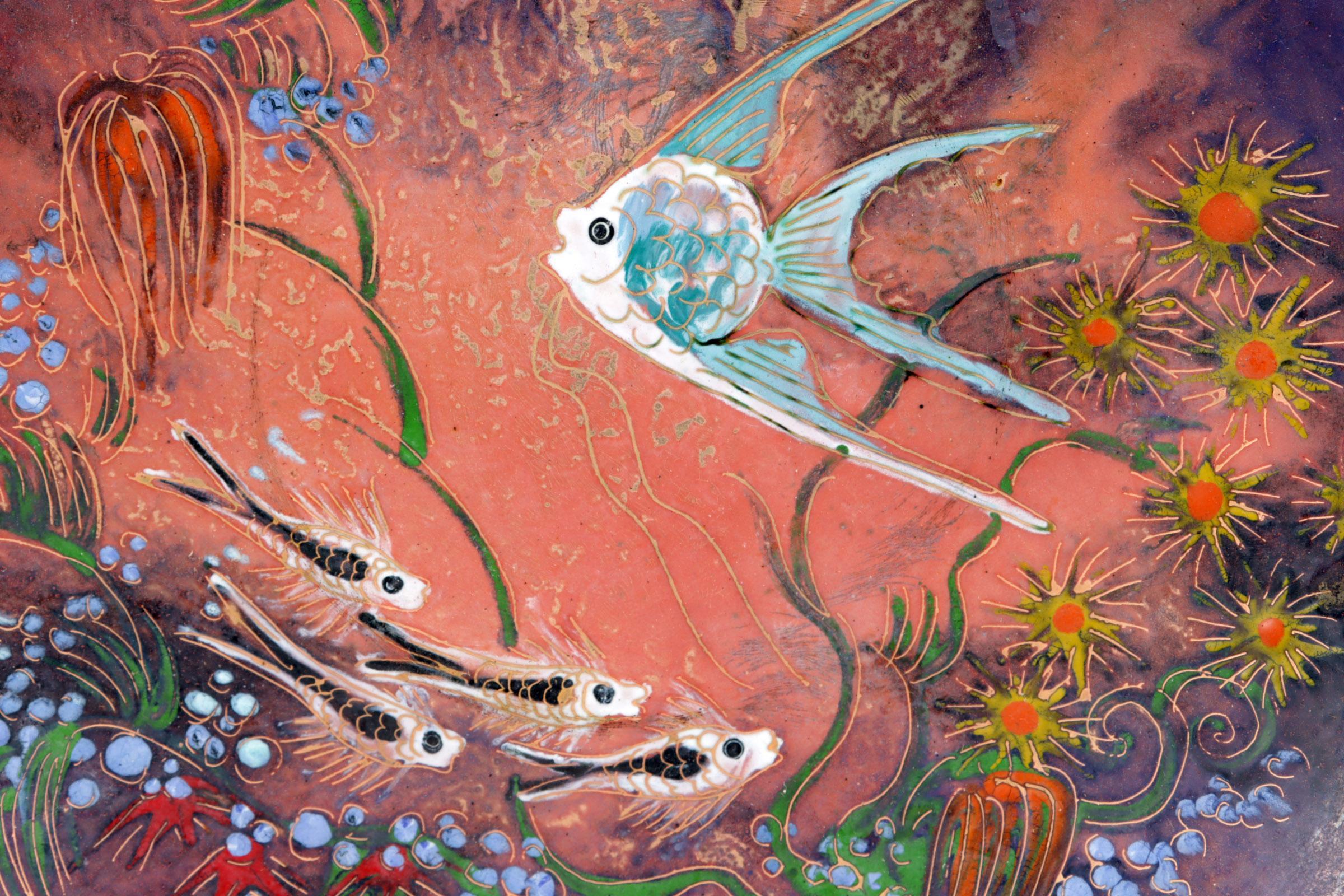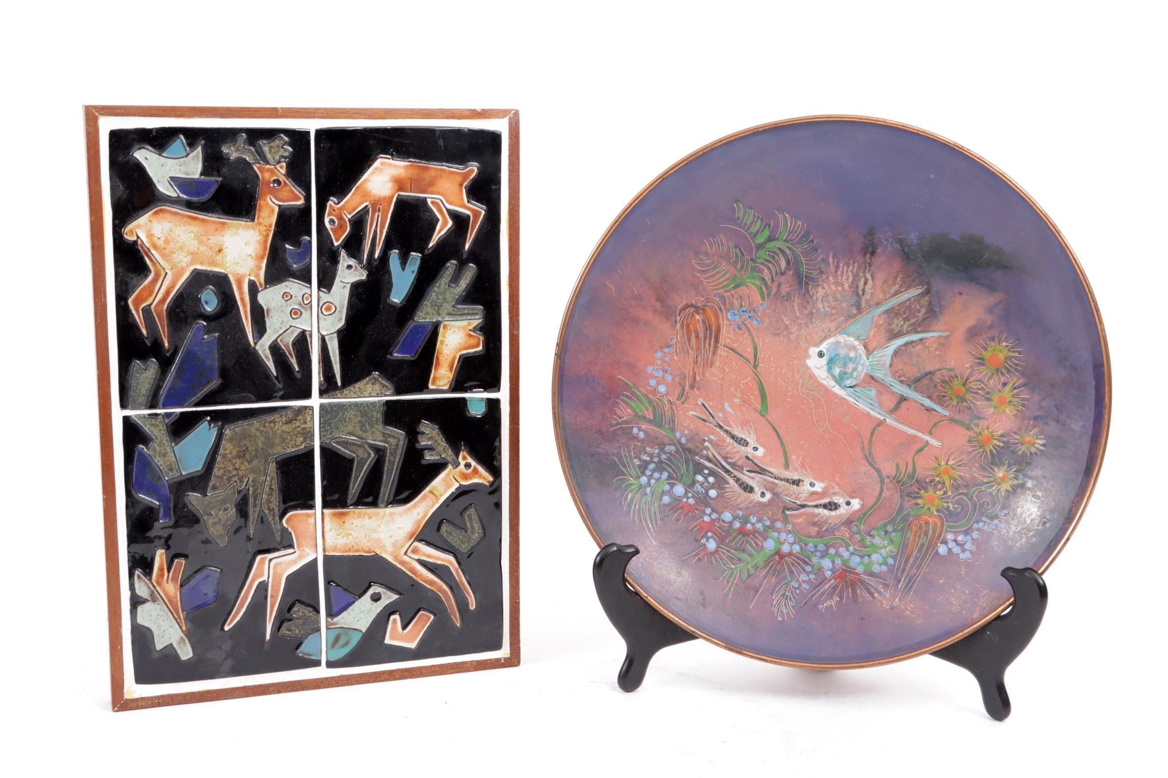 Vintage 4-delig tegeltableau en een met vissen gedecoreerde geëmailleerde schaal