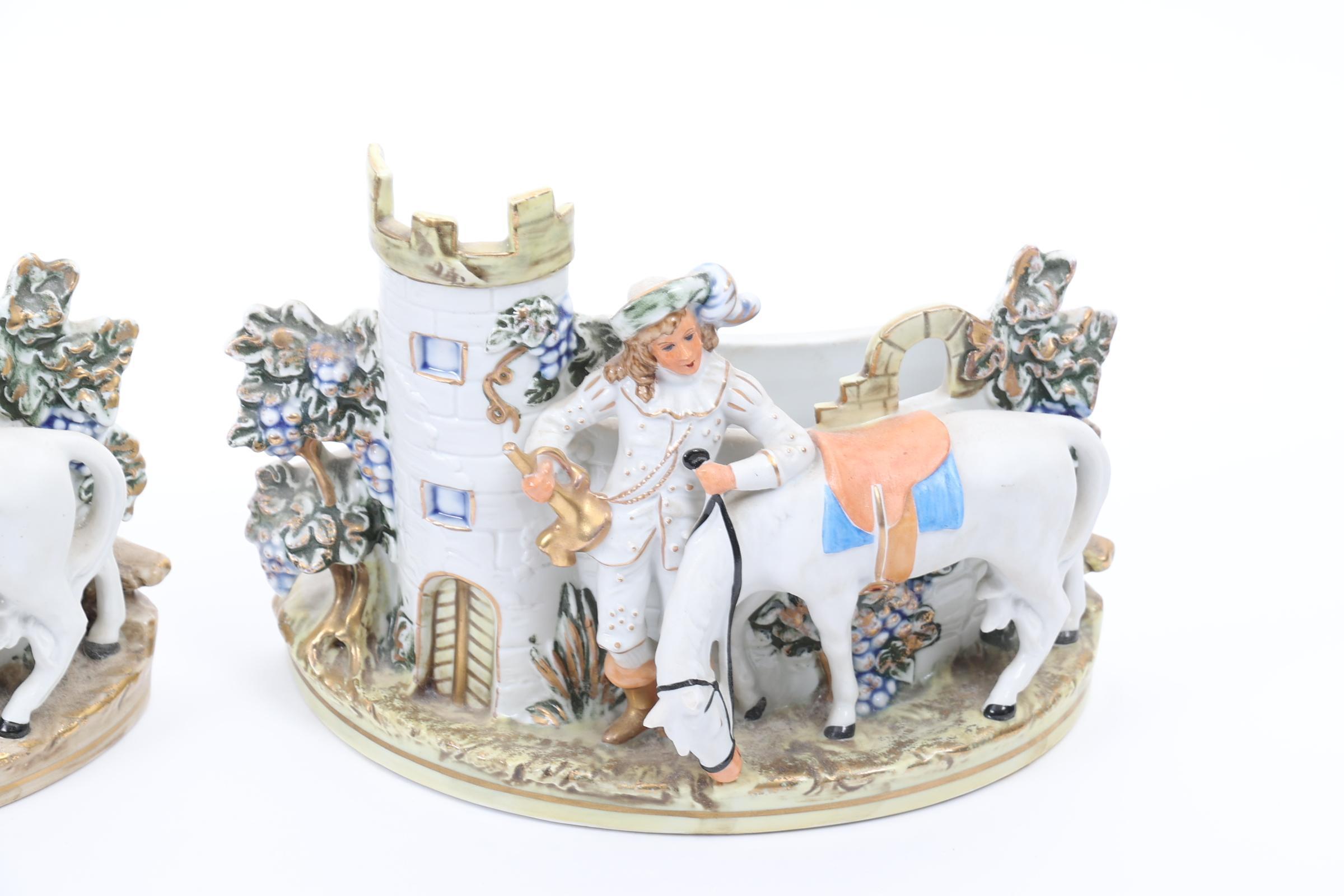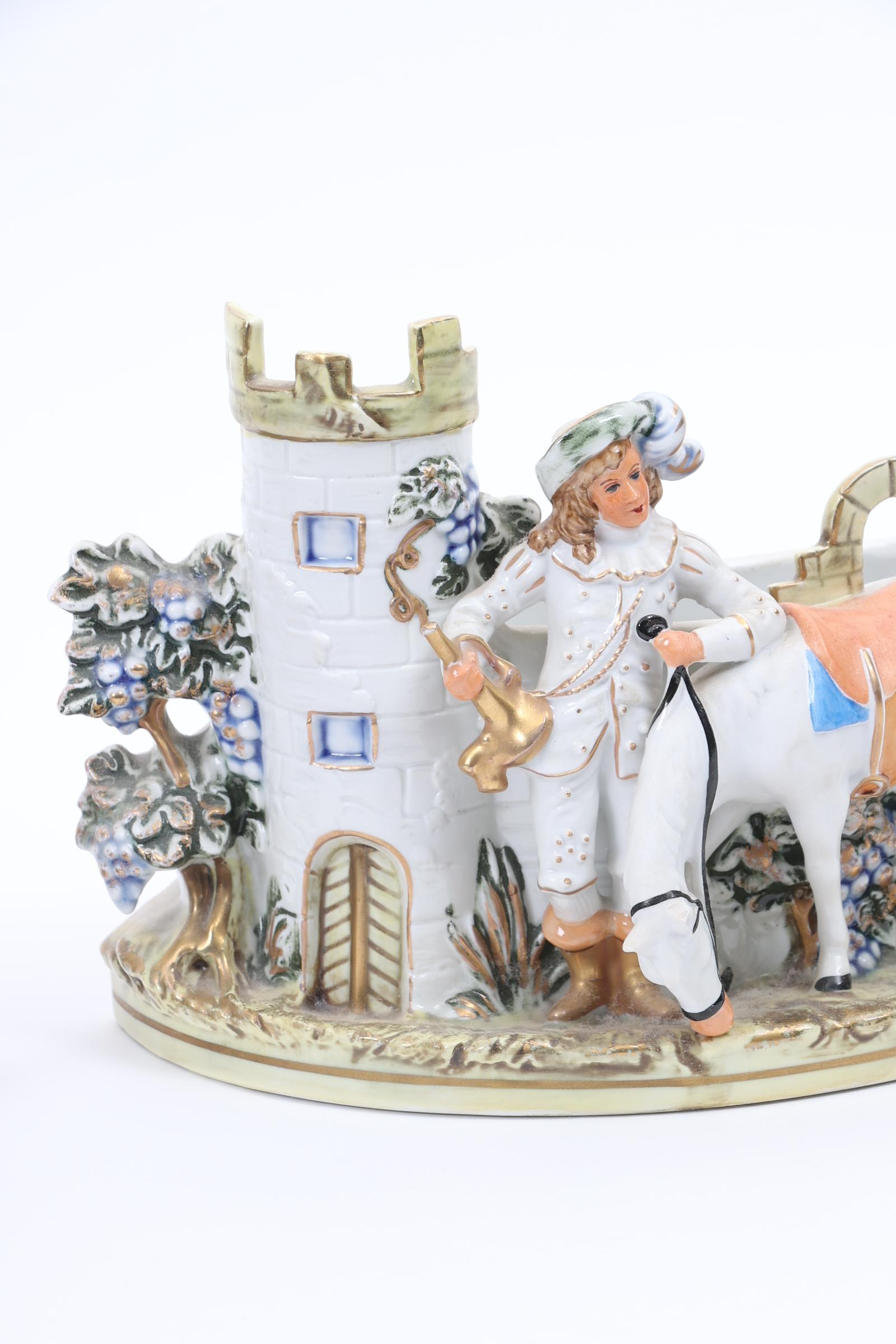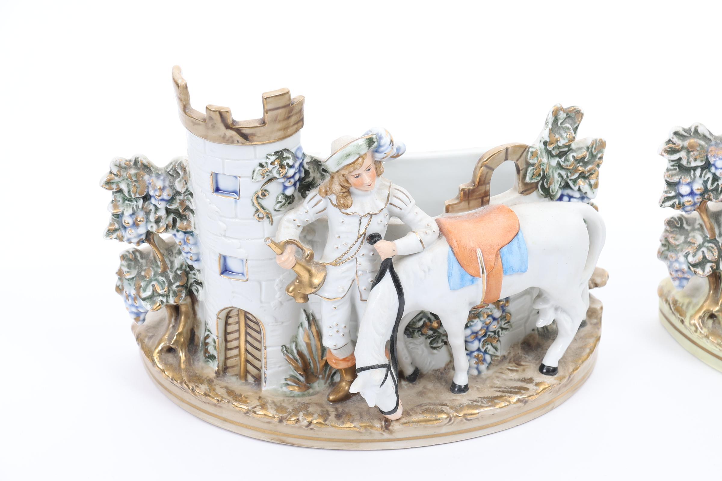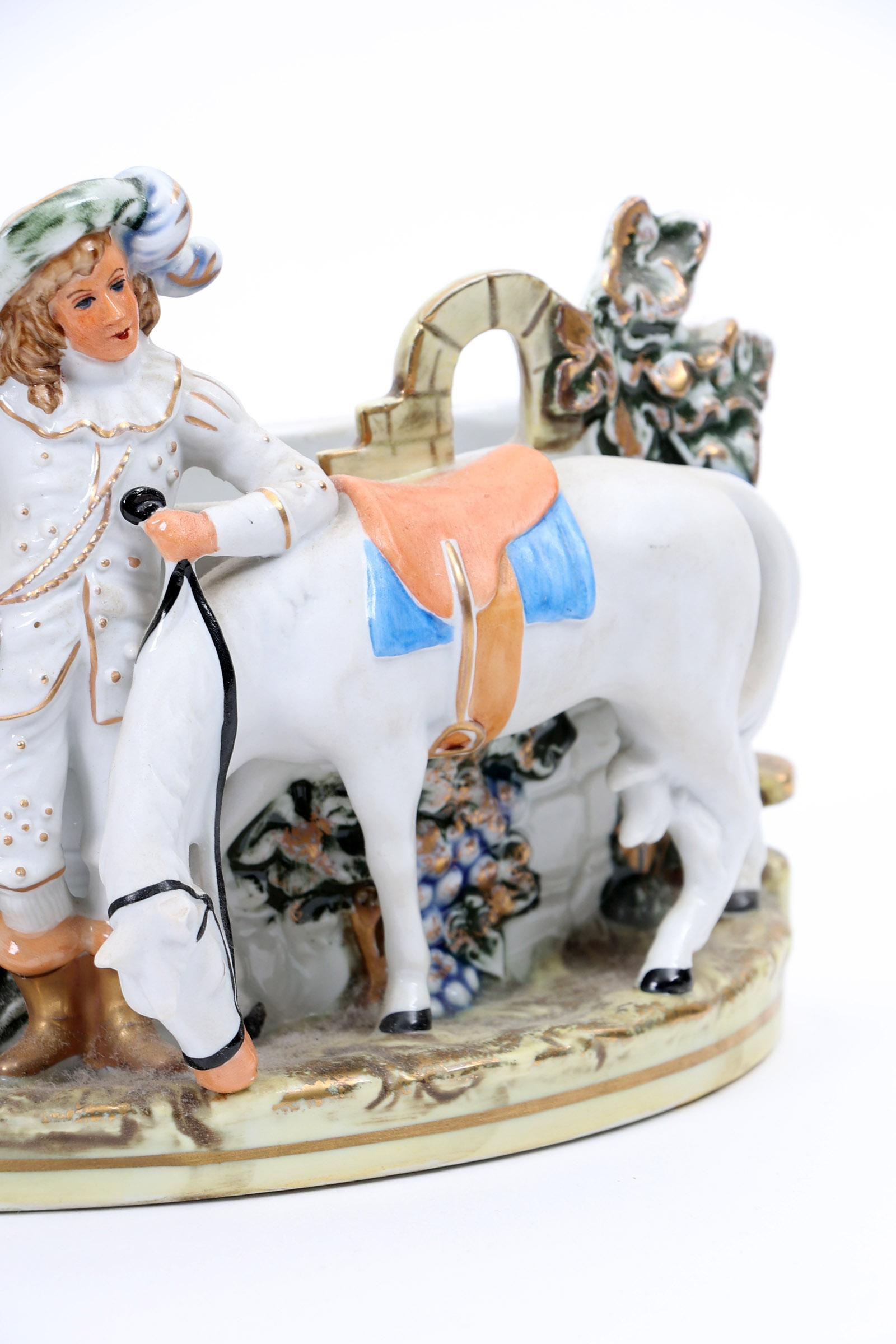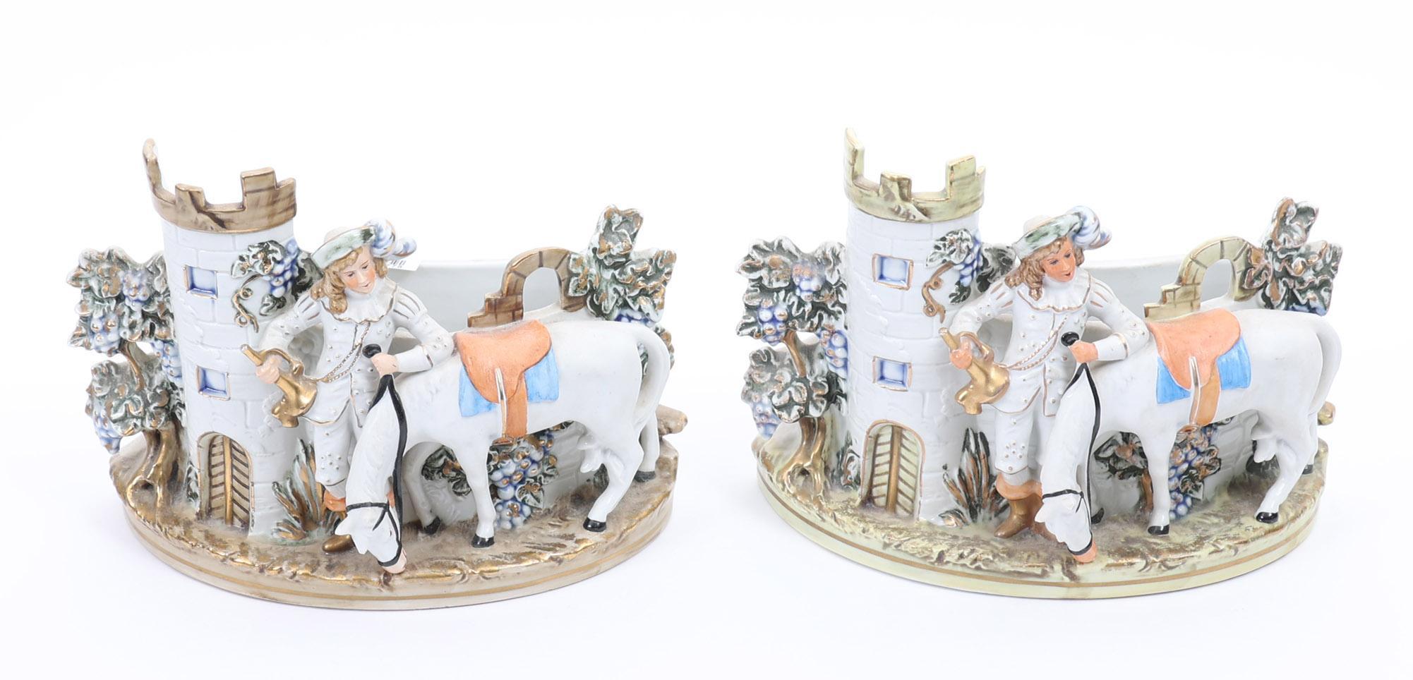 2 Met ruiter te paard gedecoreerde porseleinen bloemenbakjes met ruiter te paard