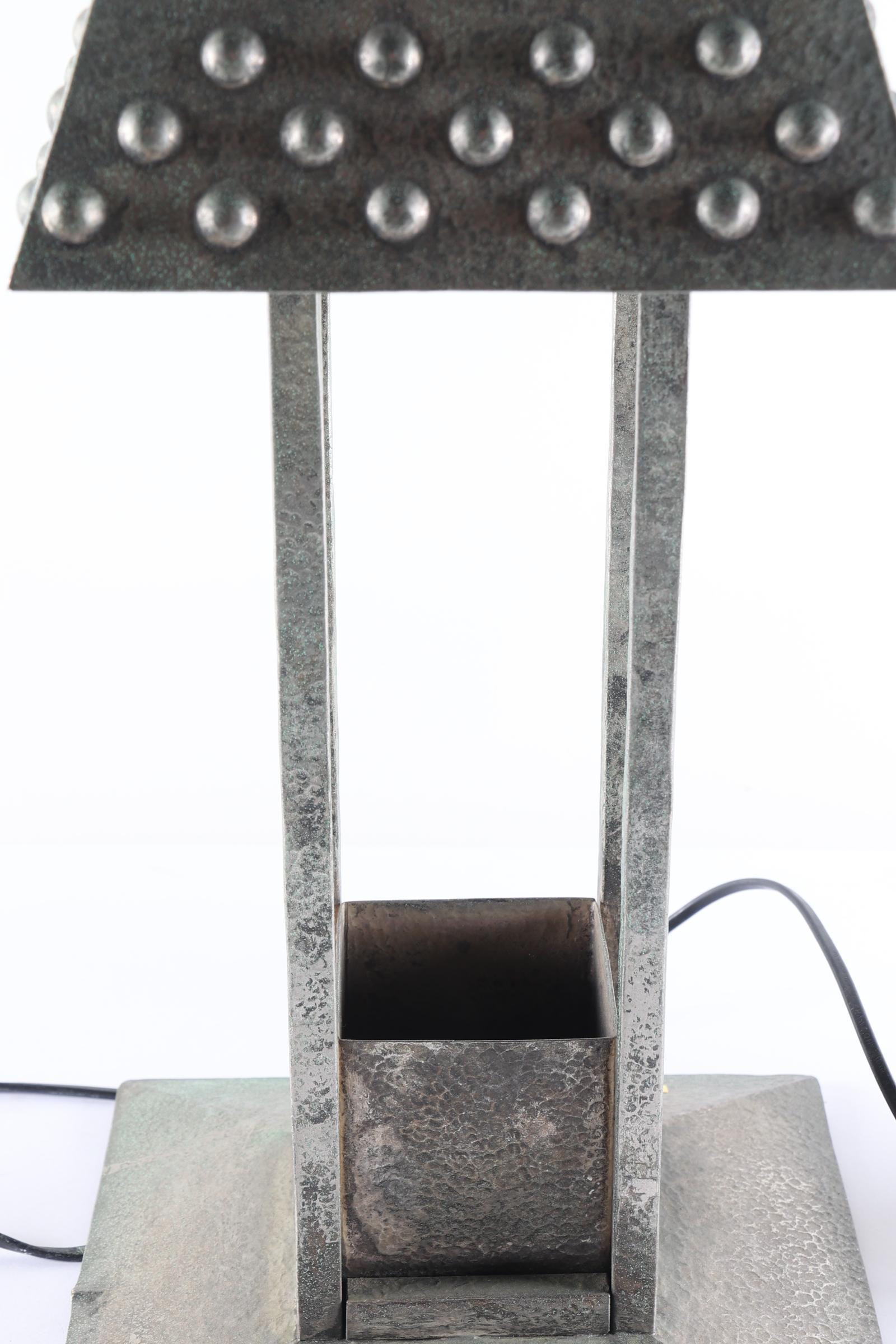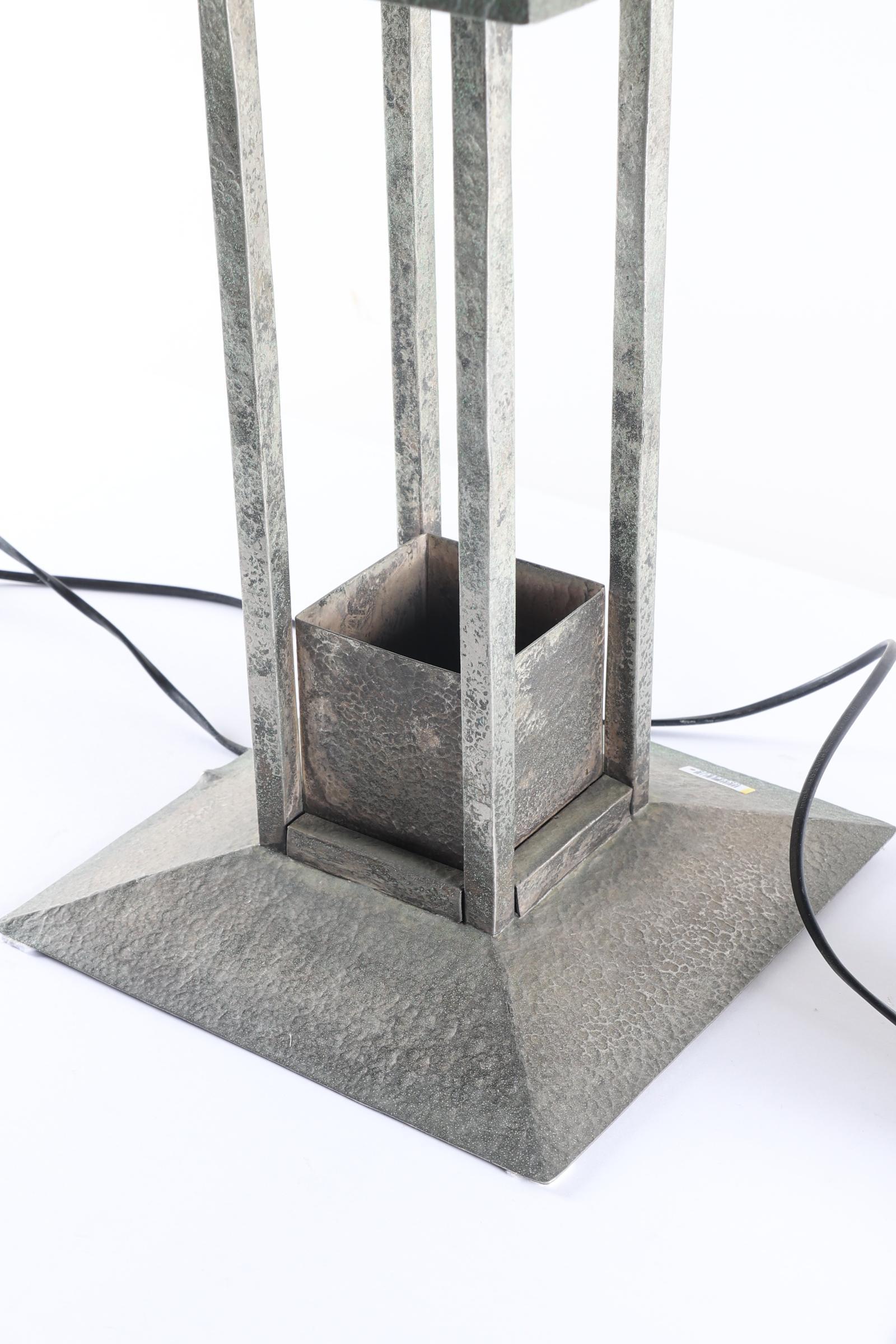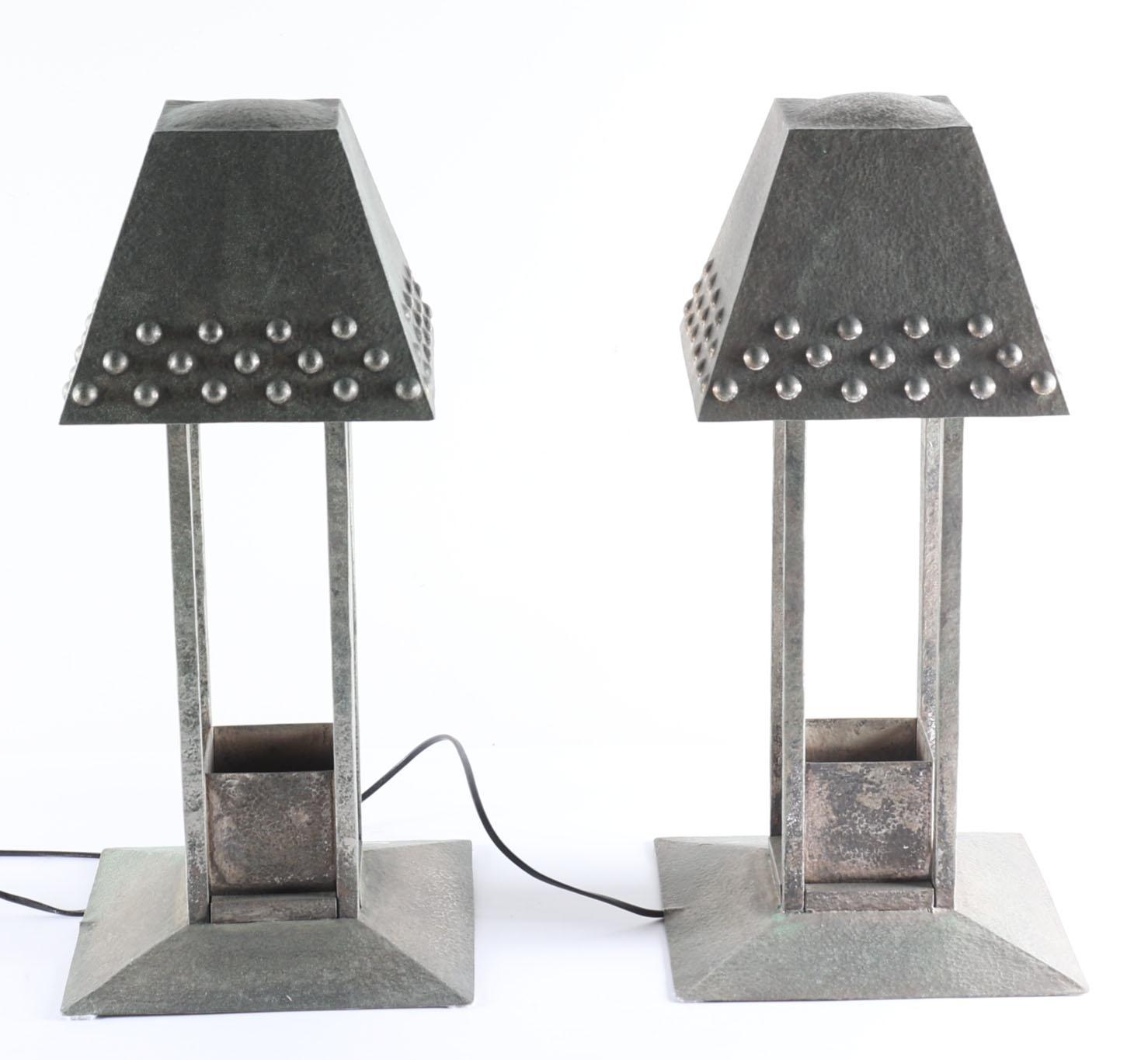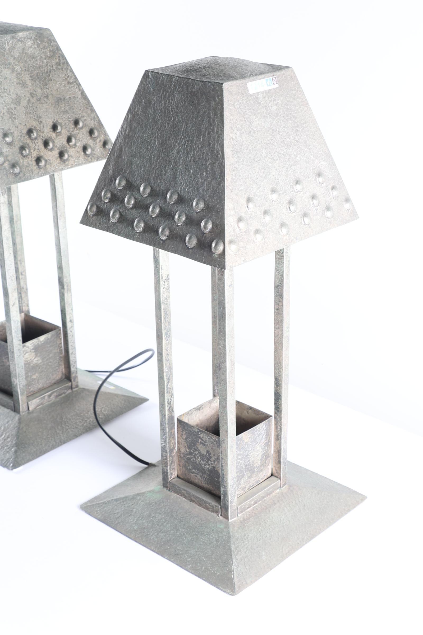 Een paar lampen, heruitgave ontwerp Josef Hoffmann, 20e eeuw Vierkant model, gehamerd metaal, de taps toelopende kappen met drie rijen knoppen. Tussen de vier leuningen een reservoir. Op een bolle voet. Gekoppelde elektrische bedrading. H. 56 cm