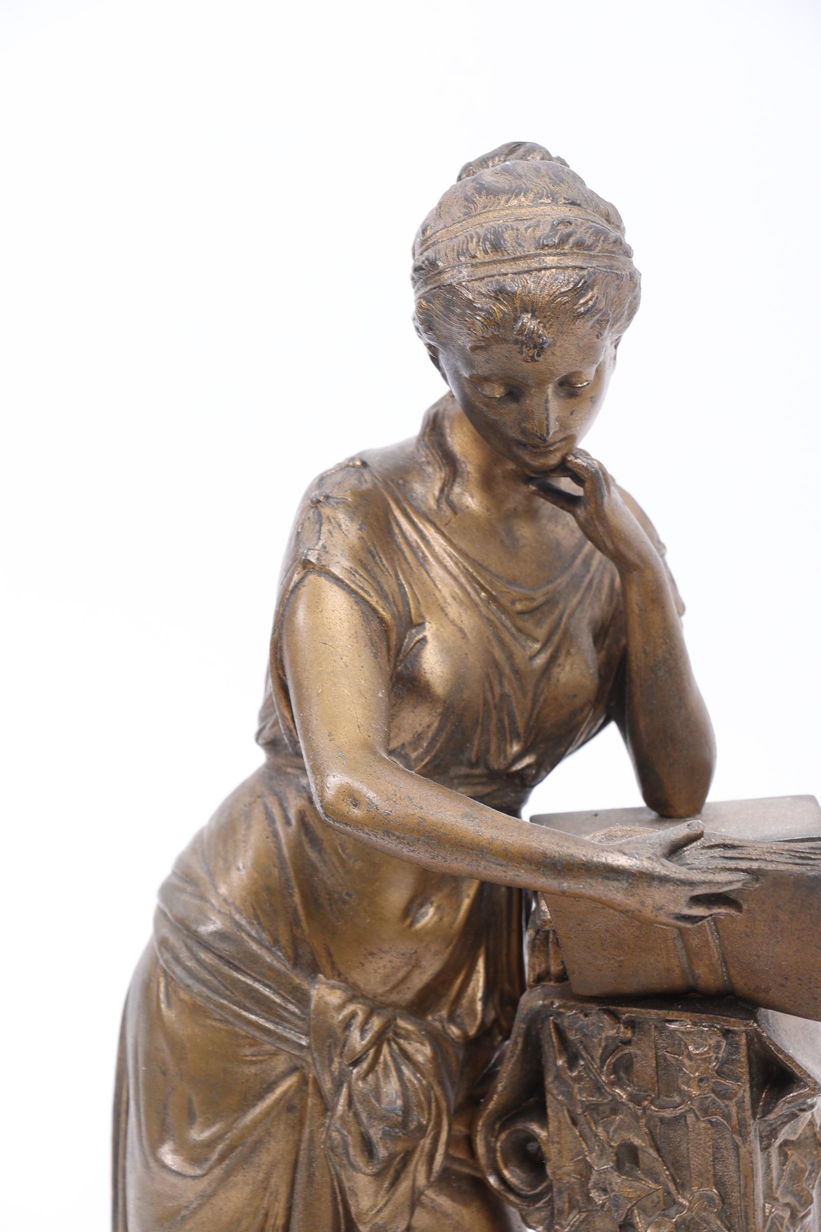 Bronskleurig legering beeld van een vrouw bij zuil, h.34 cm.
