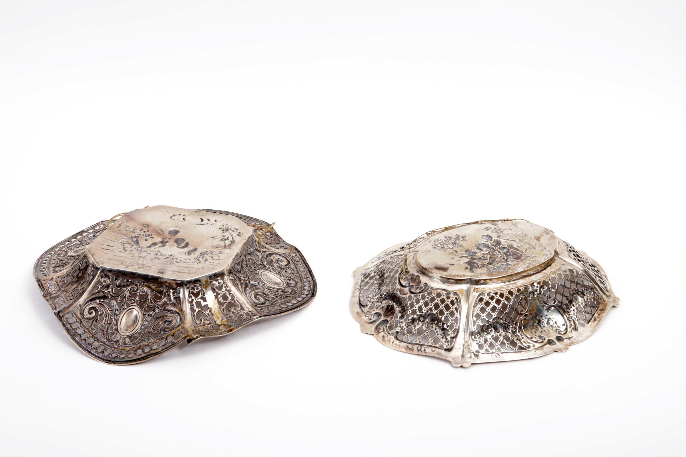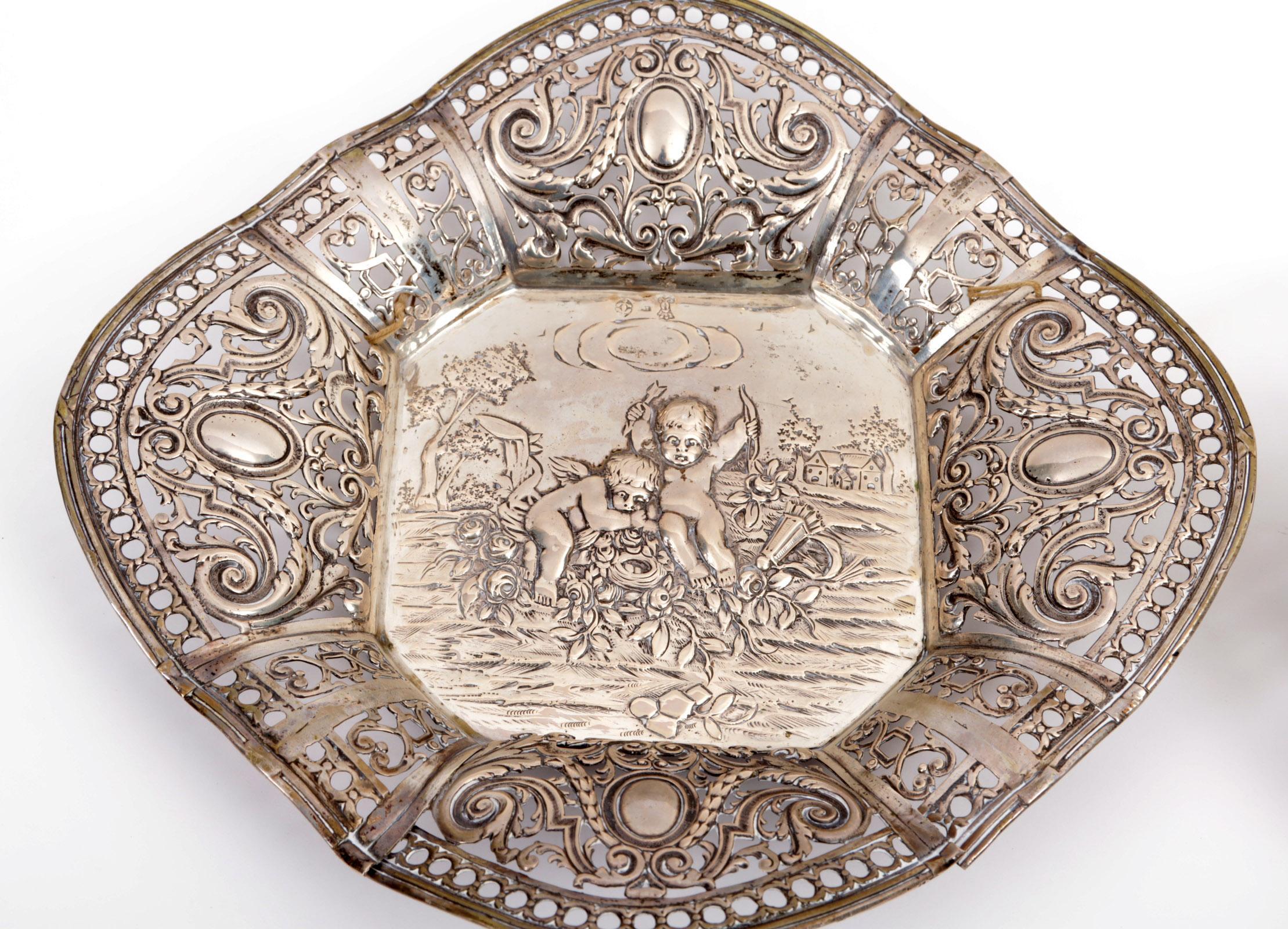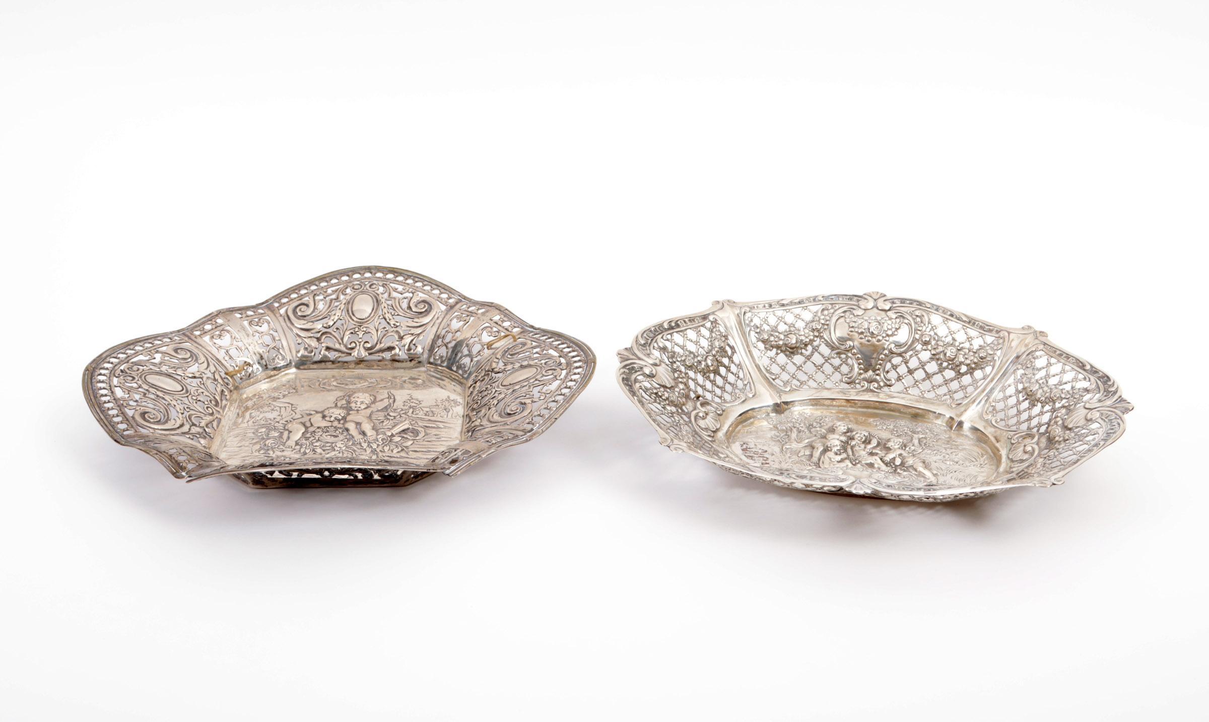 2 Opengewerkte zilverkleurige schalen met engelen decoraties, (1 schaal defect aan rand) 641 gram