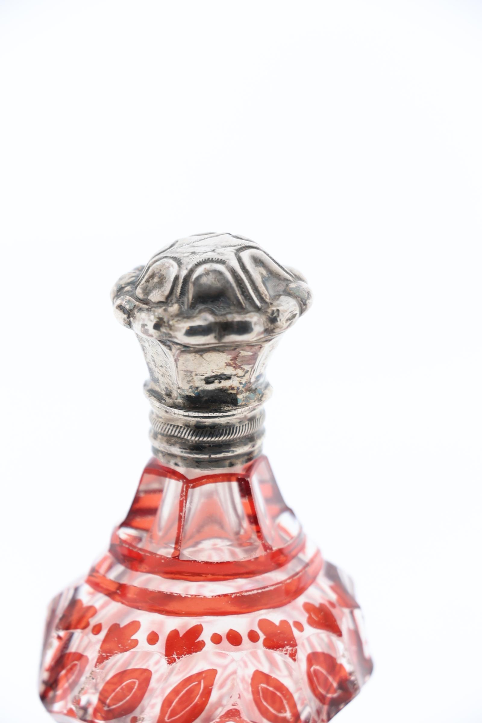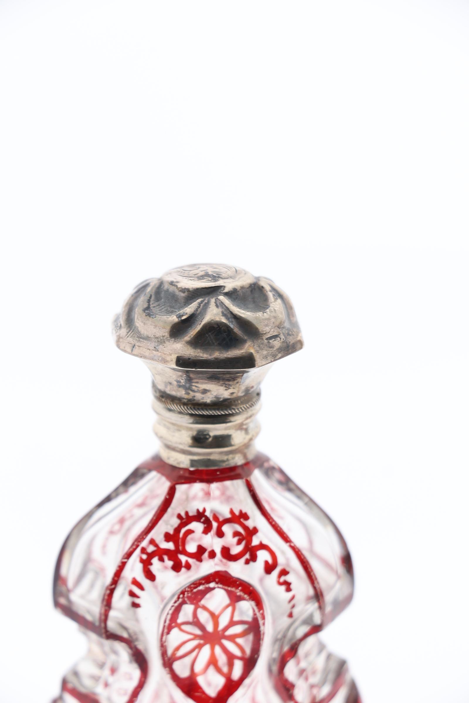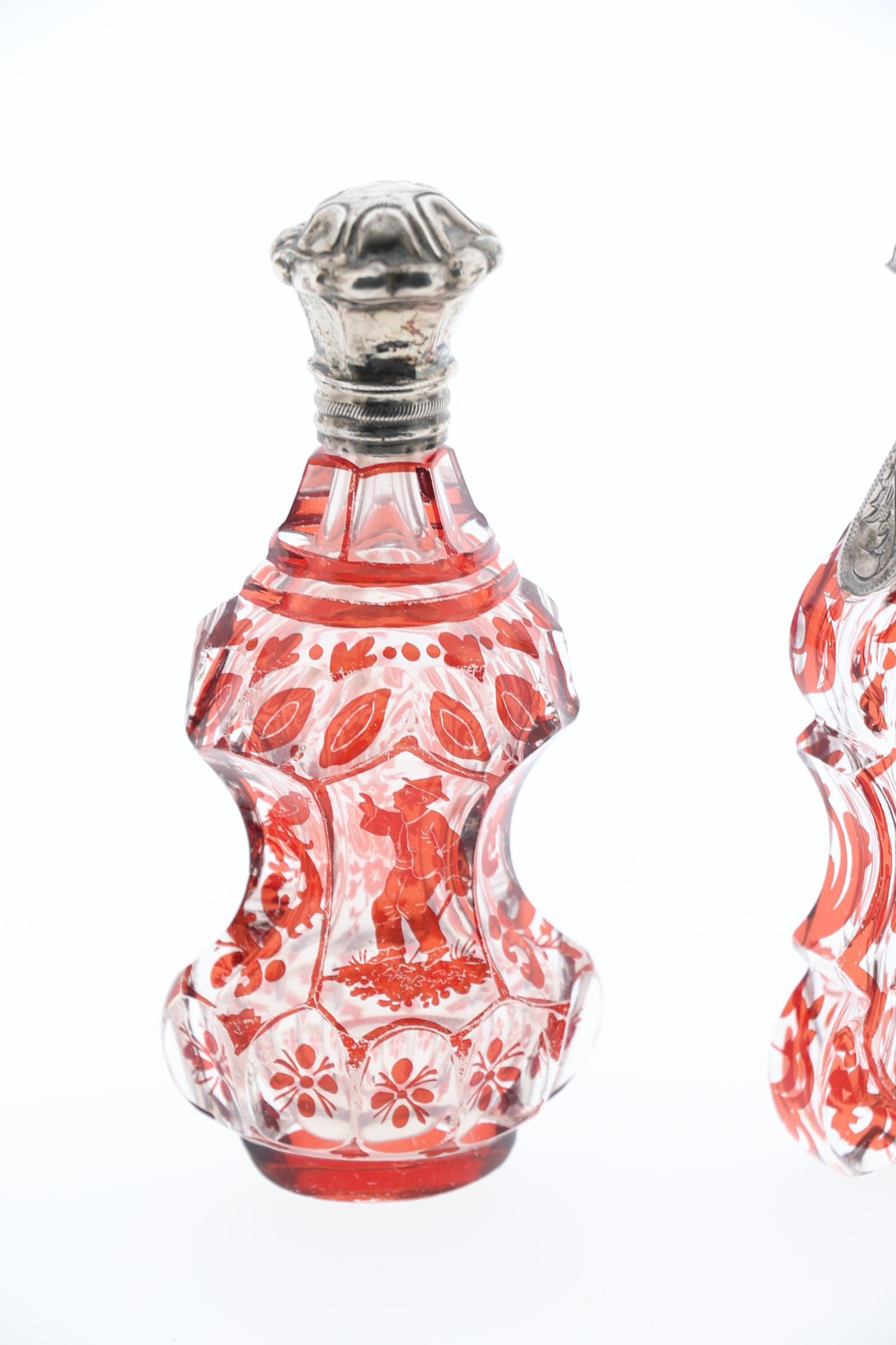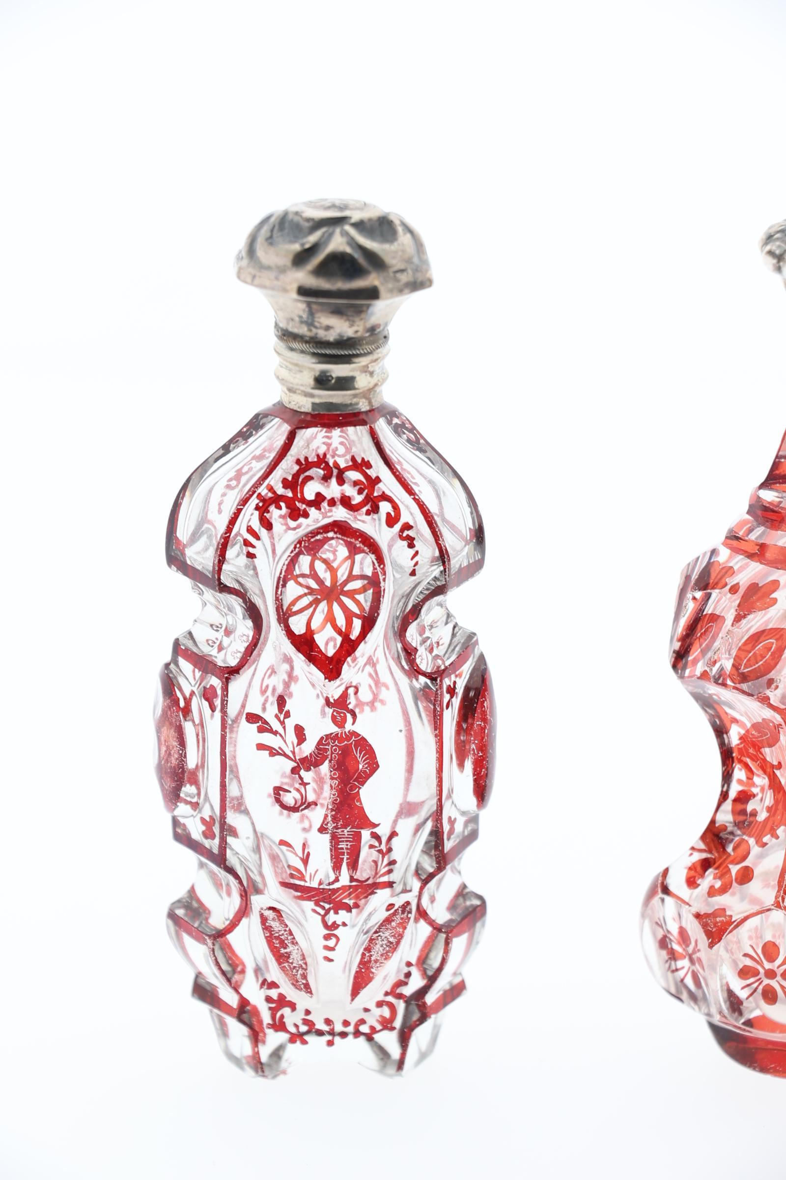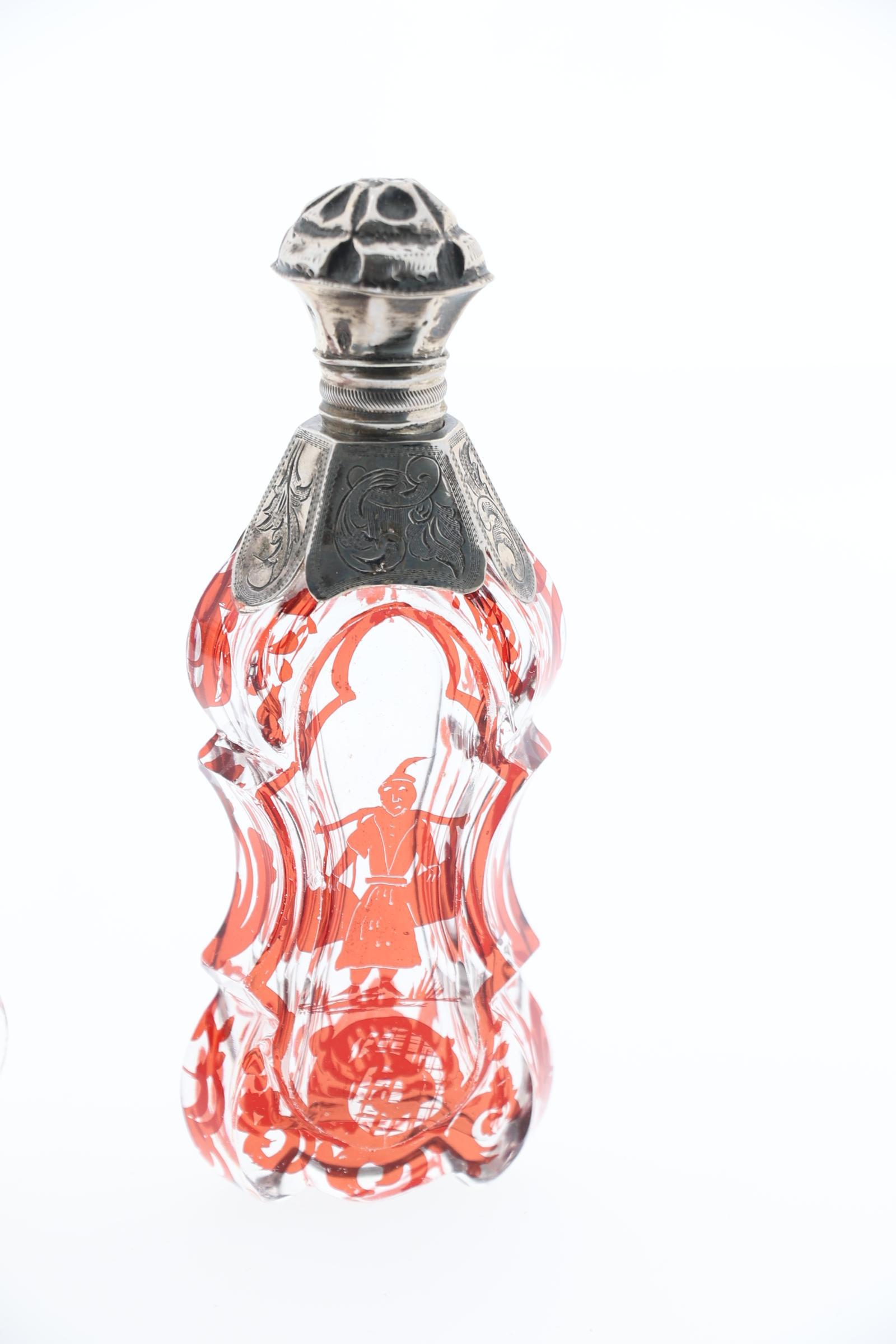 3 Antieke Boheems kristallen odeurflacons met afbeeldingen van personen en bloemen met zilveren doppen, ca.h.12 cm., 19e eeuw