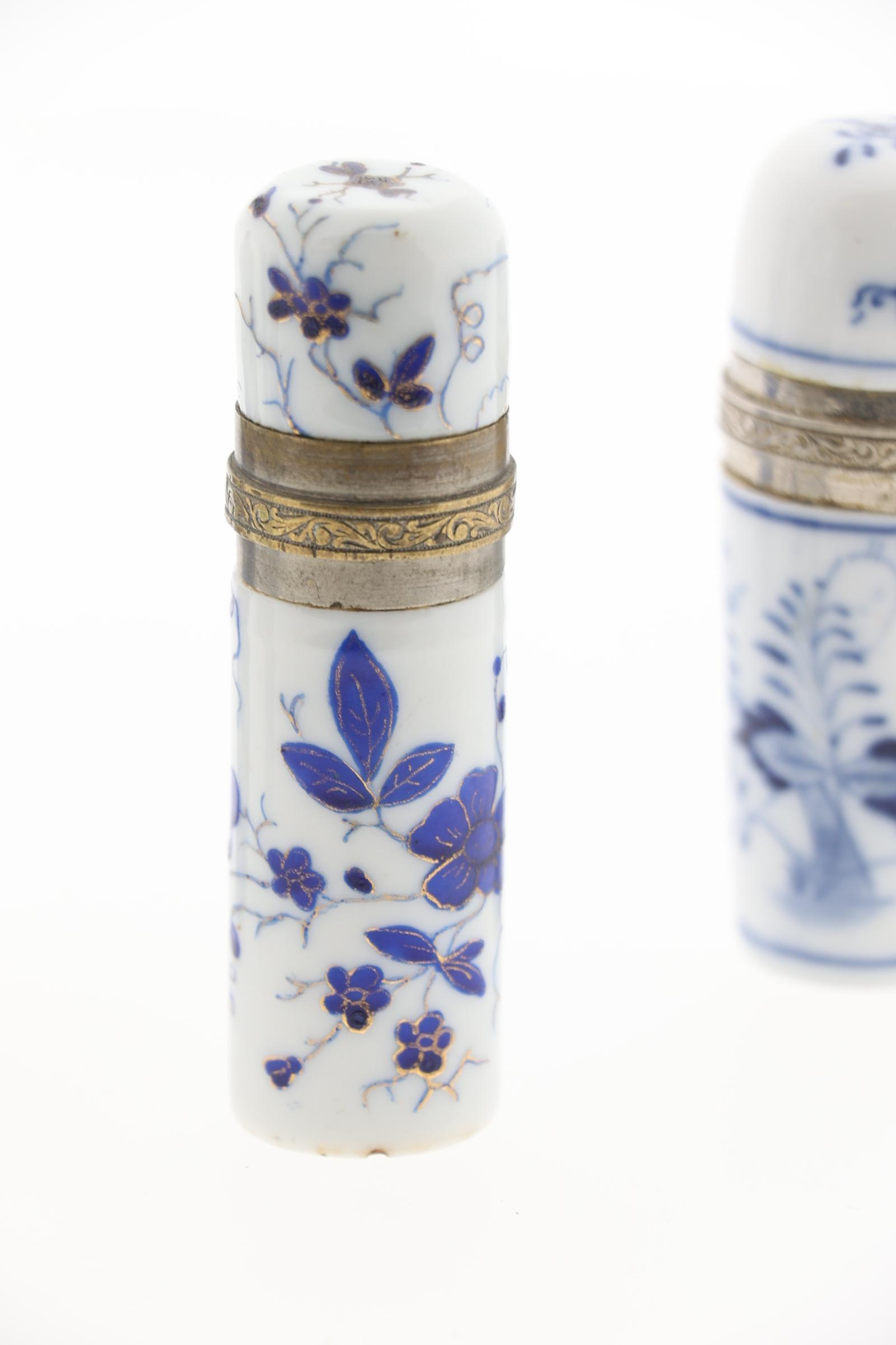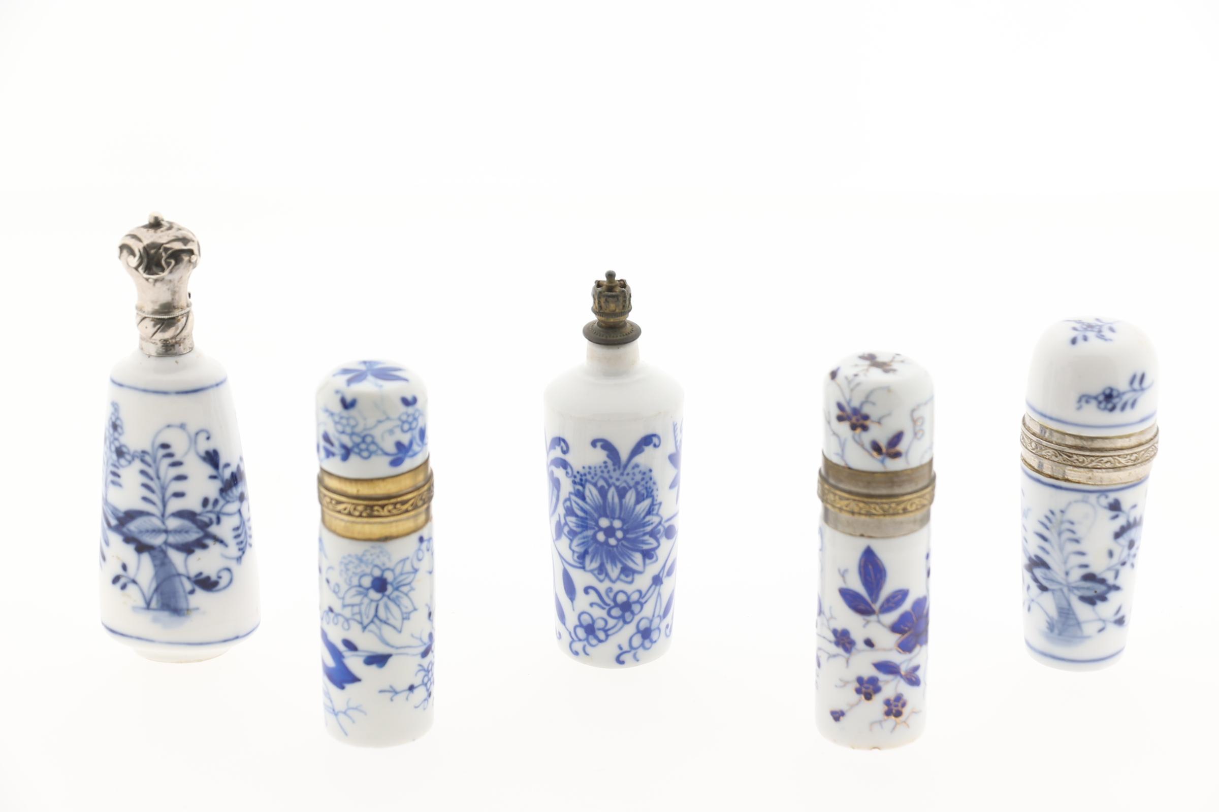 5 Blauw/wit gedecoreerde porseleinen odeurflacons met zilverkleurige beslag en doppen, 19e eeuw, h.10 , 9, en 8 cm.