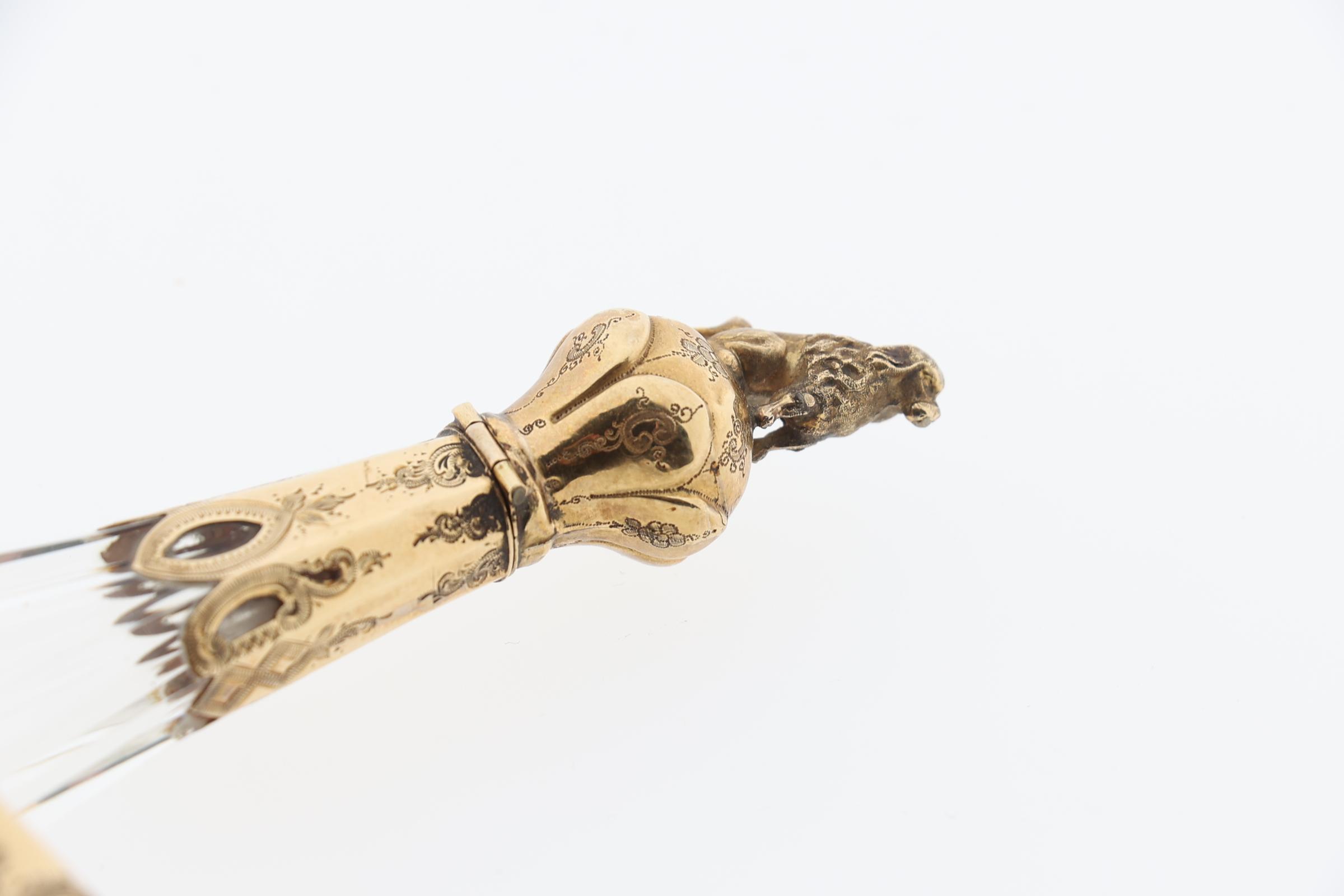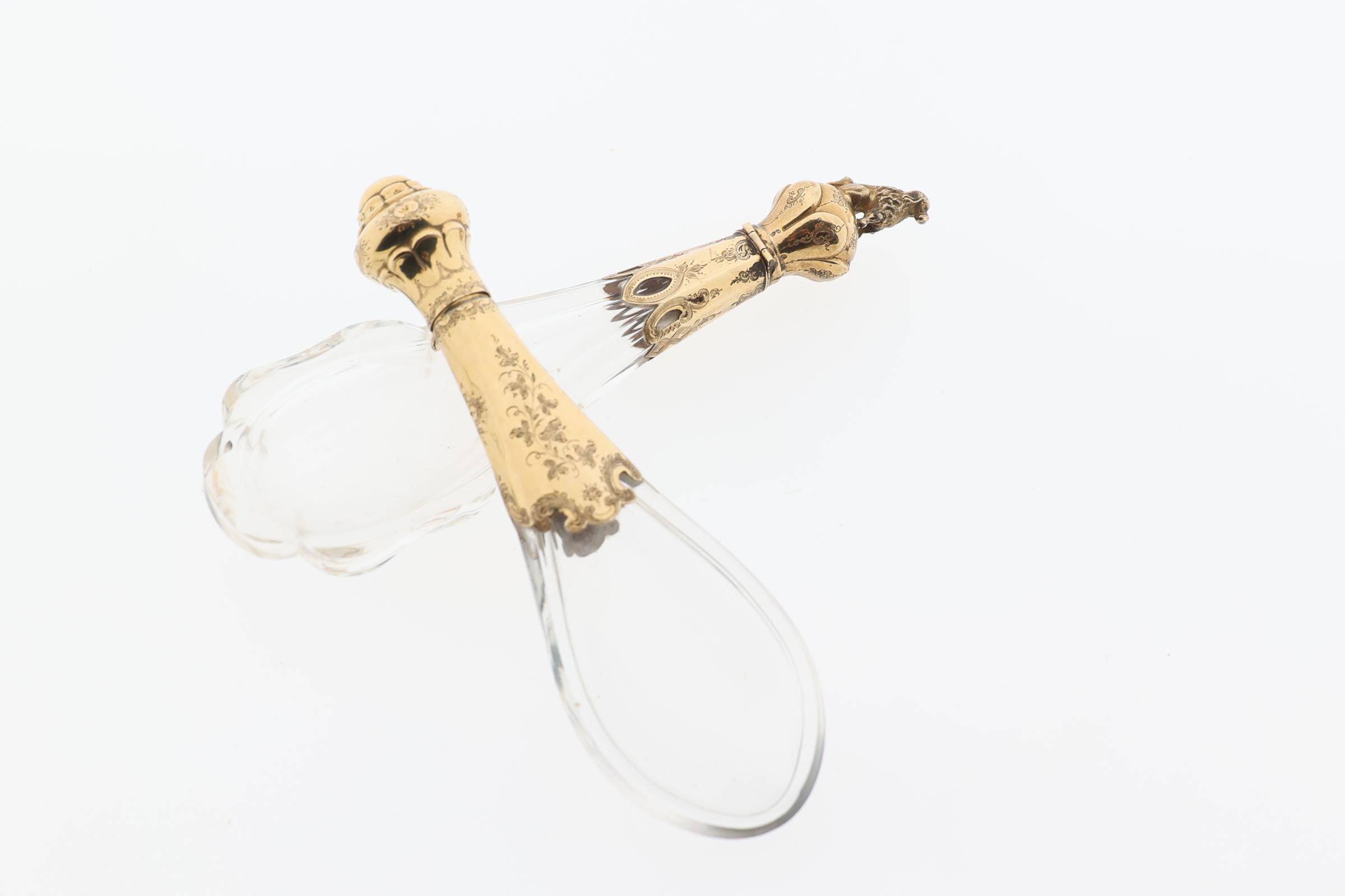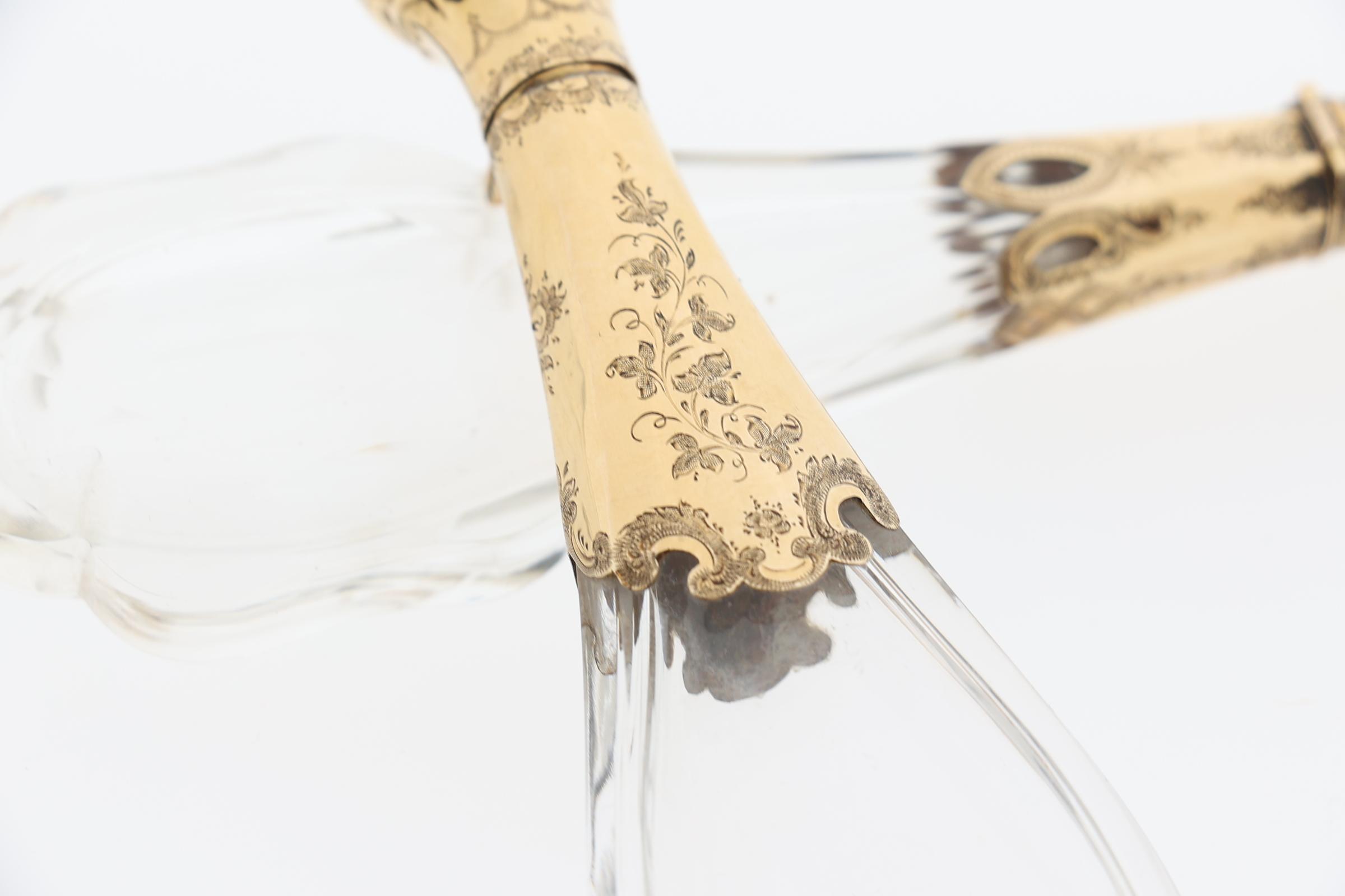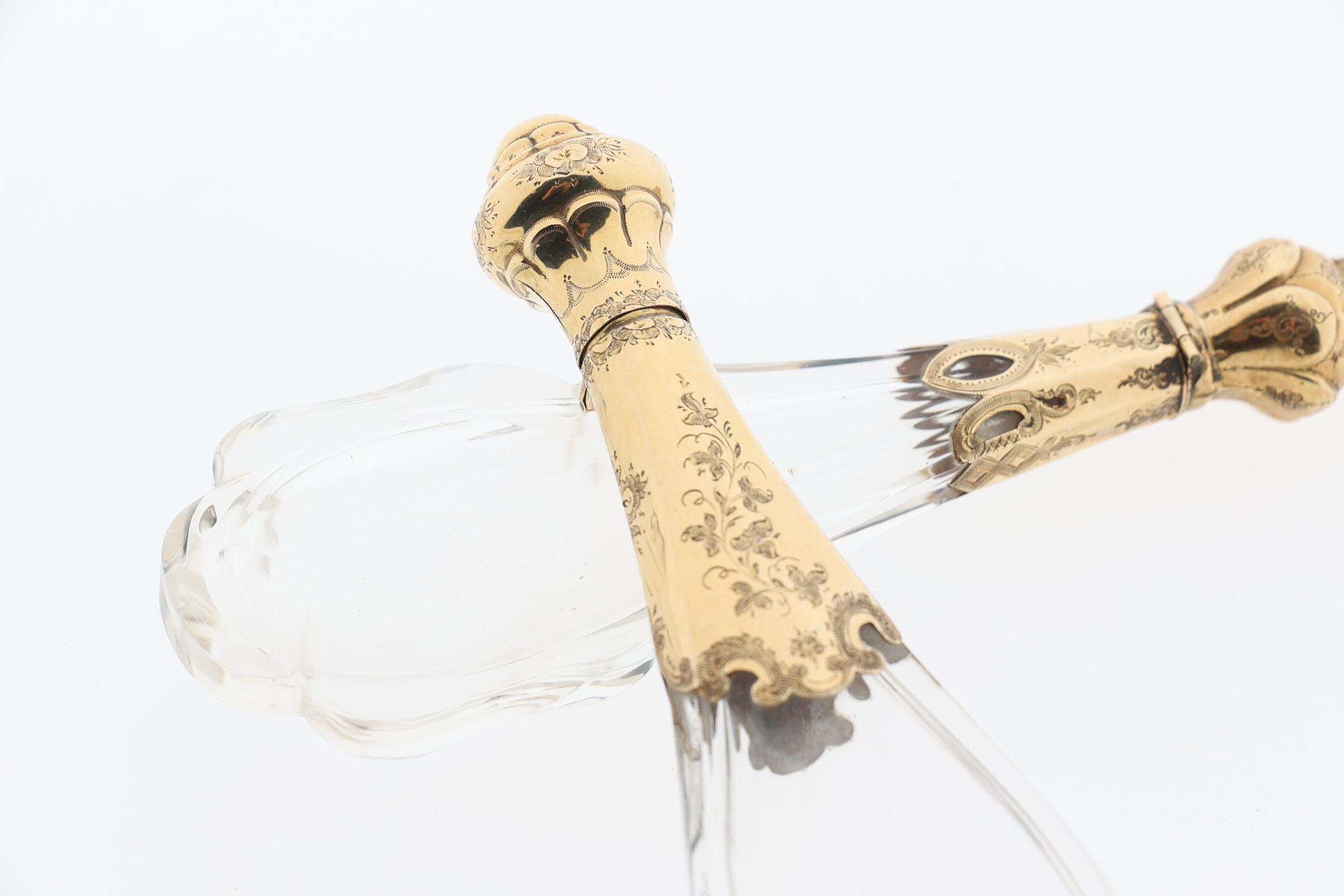2 Kristallen met gouden platte odeurflacons, 19e eeuw, h.14 en 12 cm.