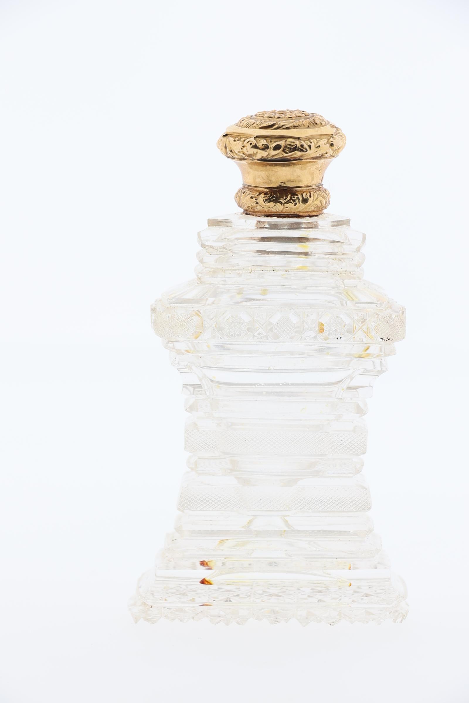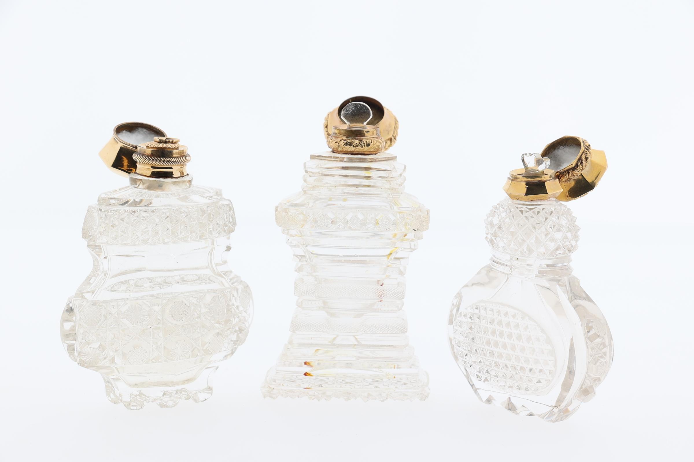 Koop van 3 bewerkte kristallen met gouden odeurflacons, 19e eeuw, h.9 cm.