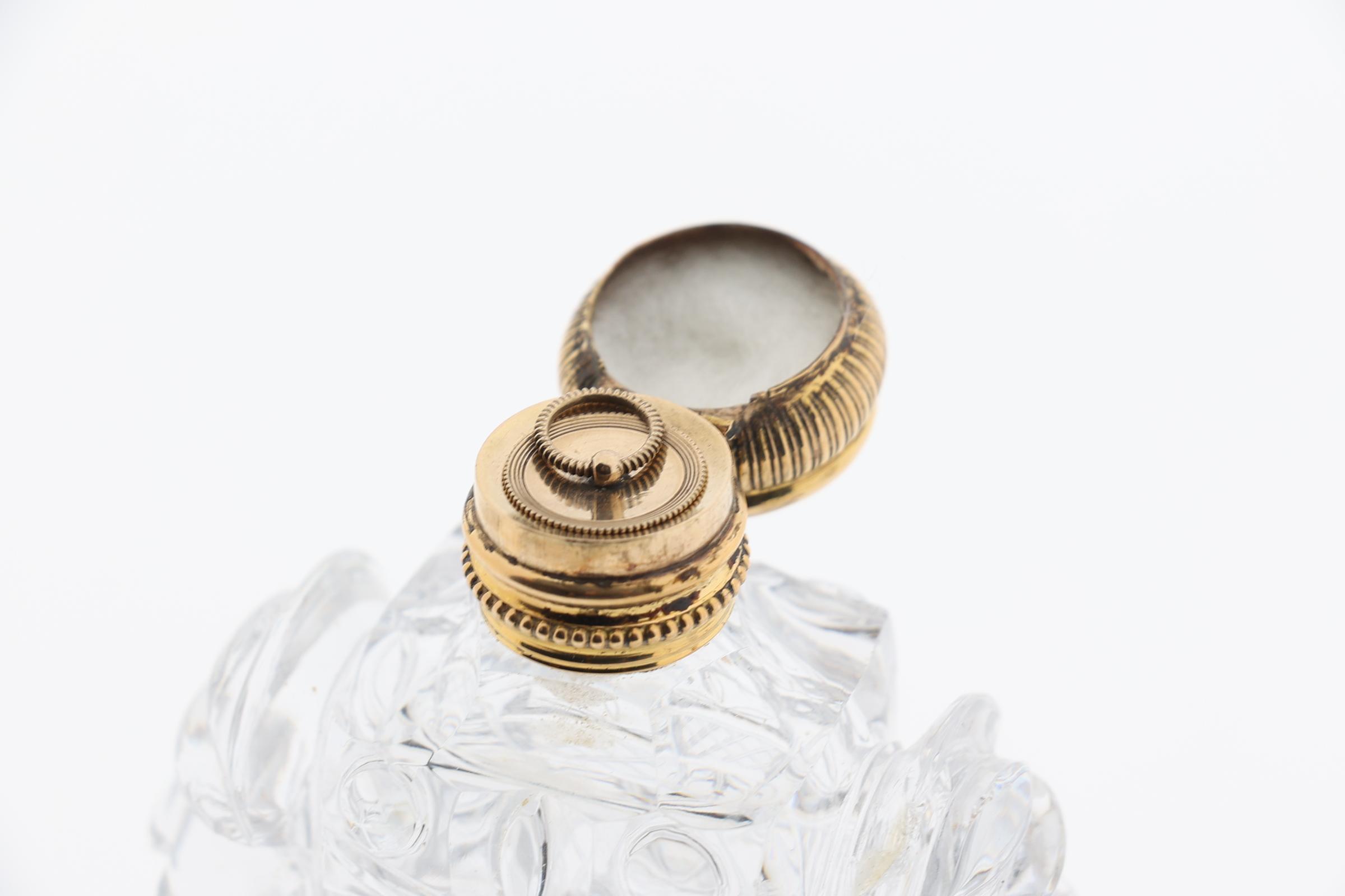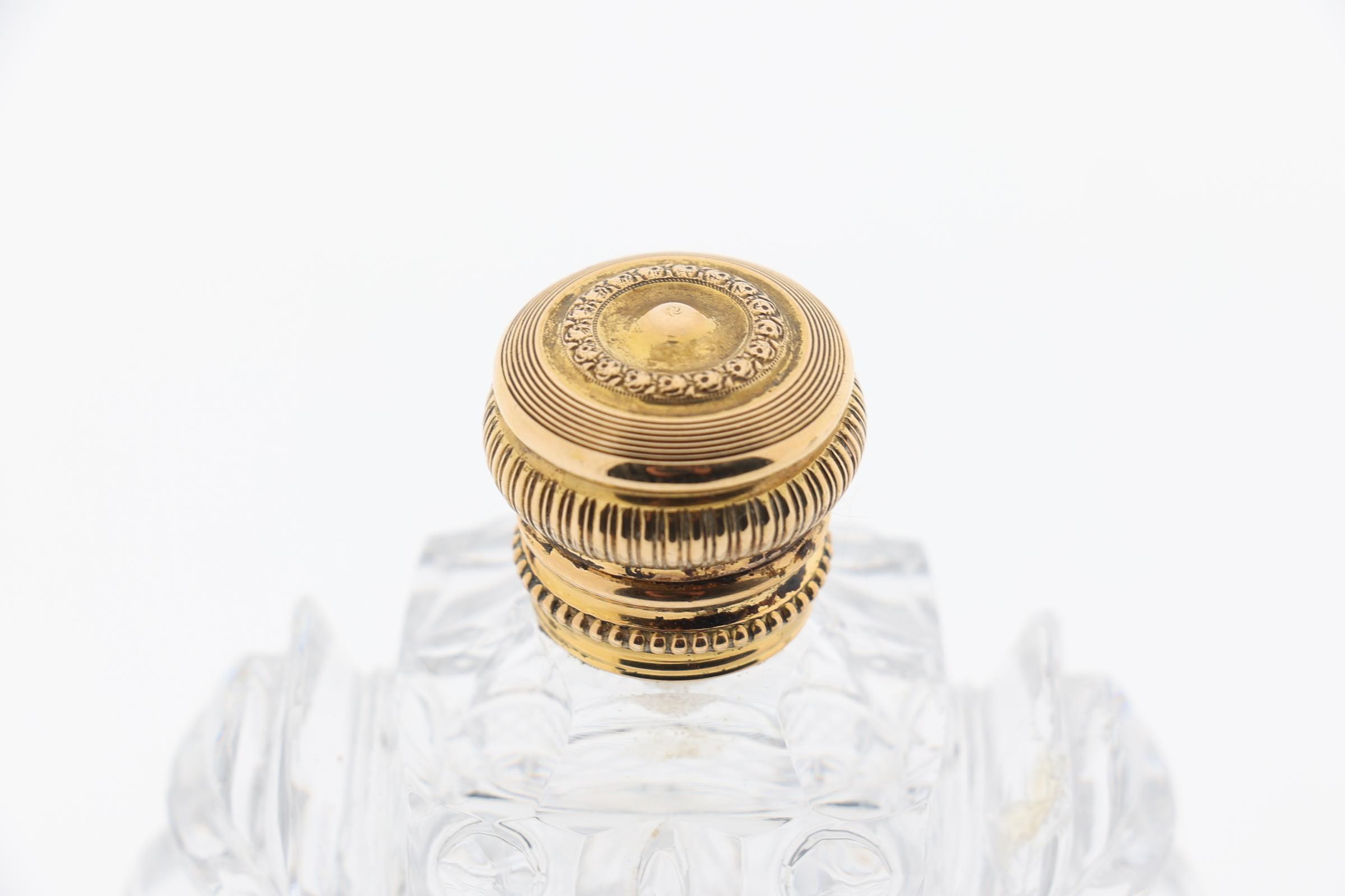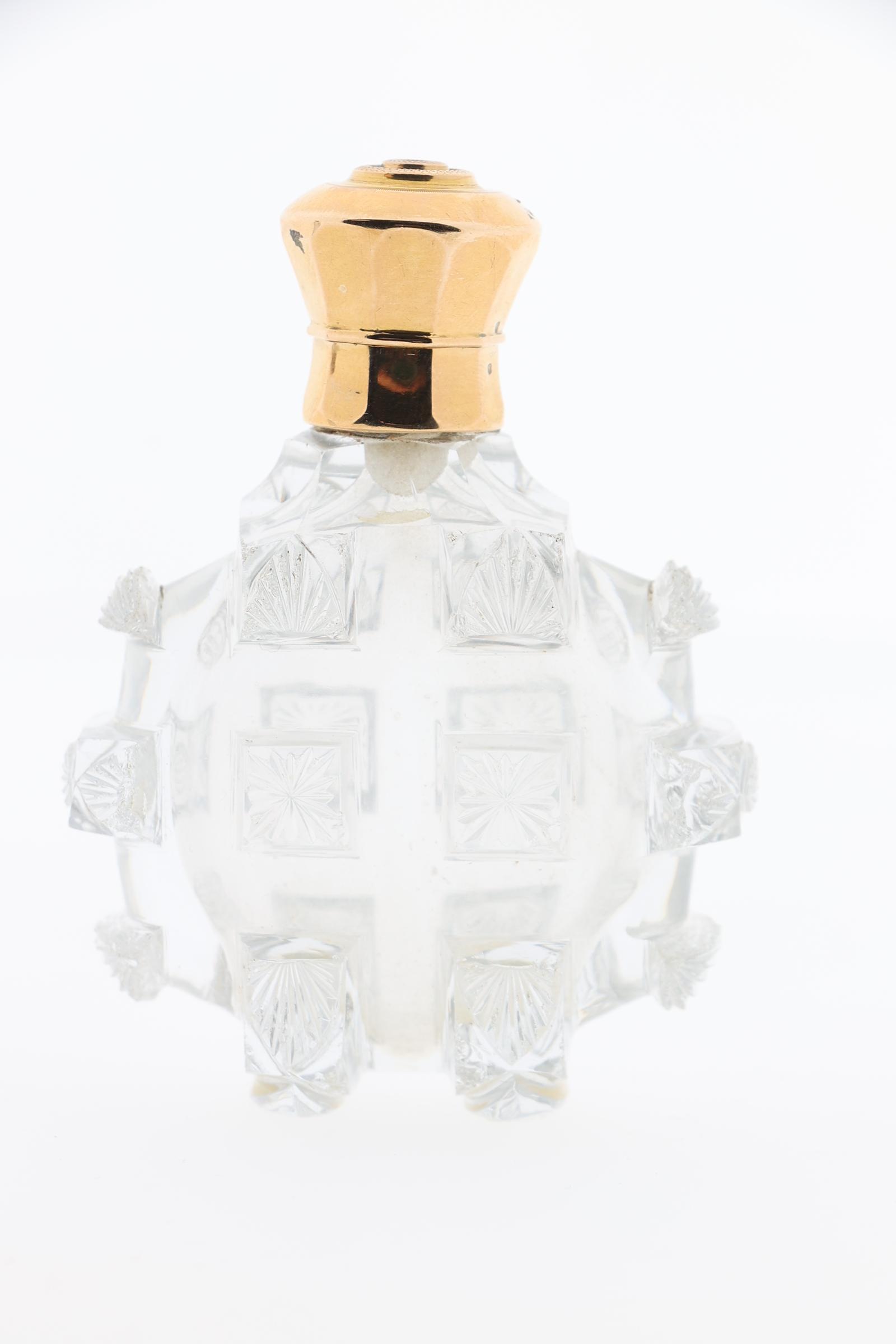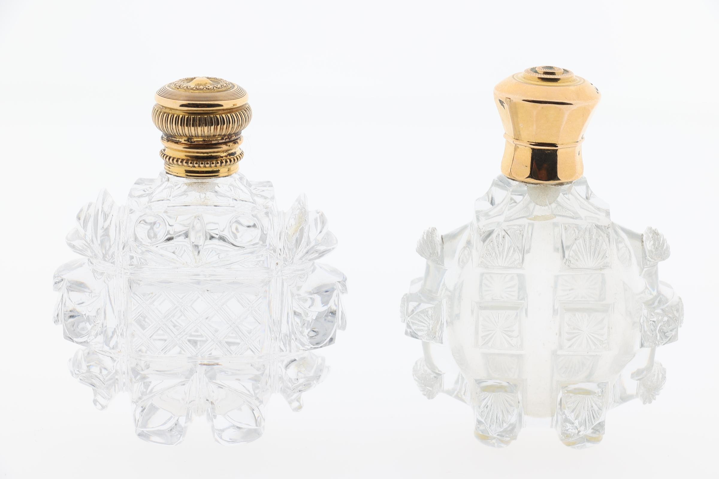 2 Gegraveerde kristallen odeurflacons met gouden dop, 19e eeuw, h.8,5 cm.