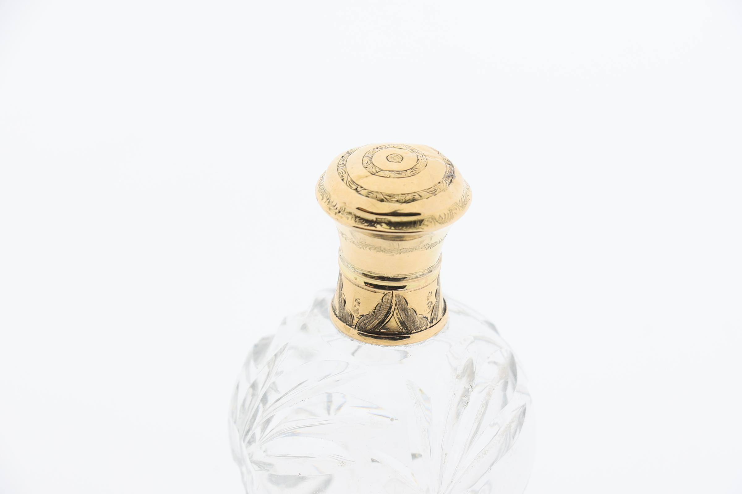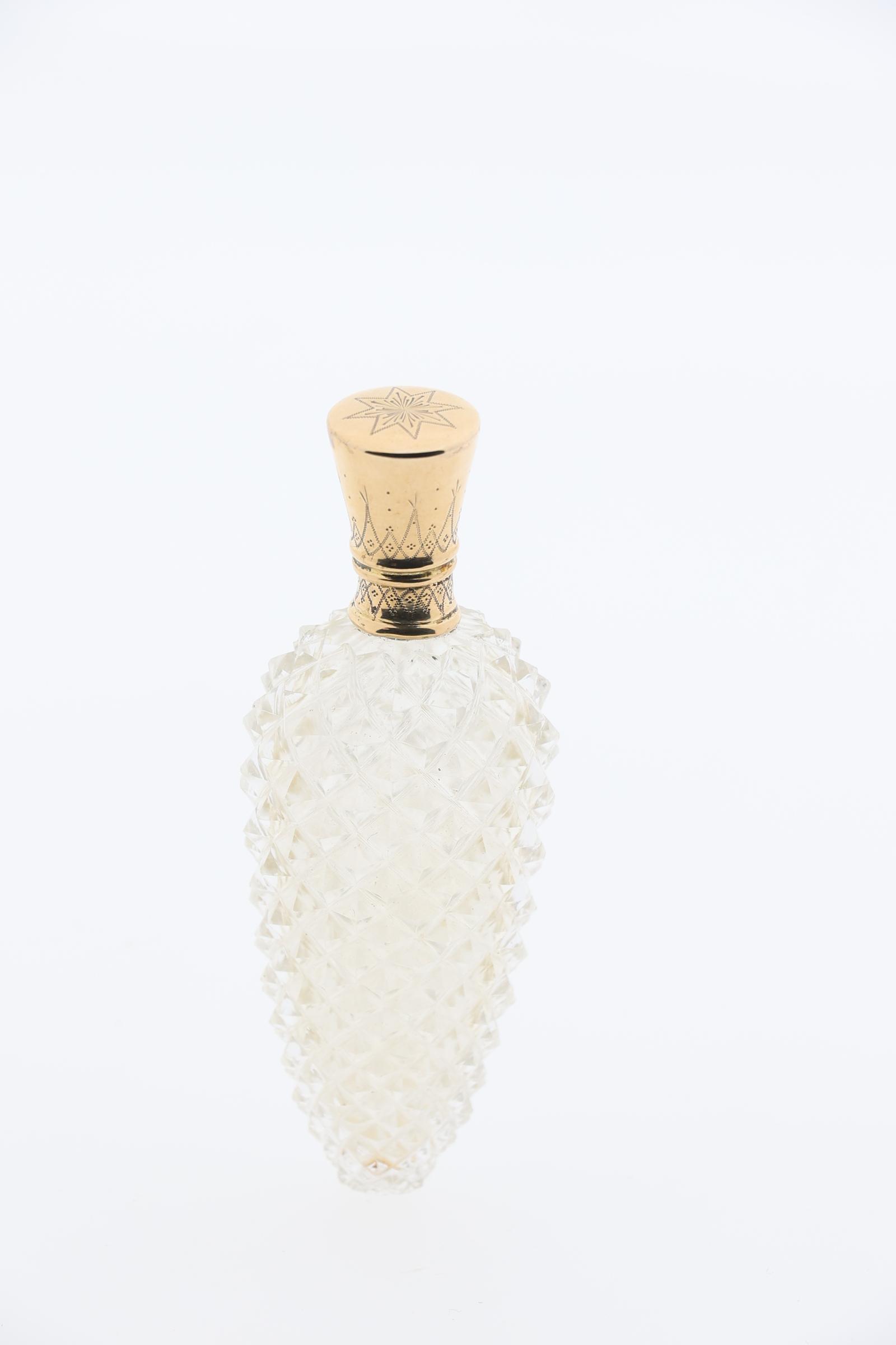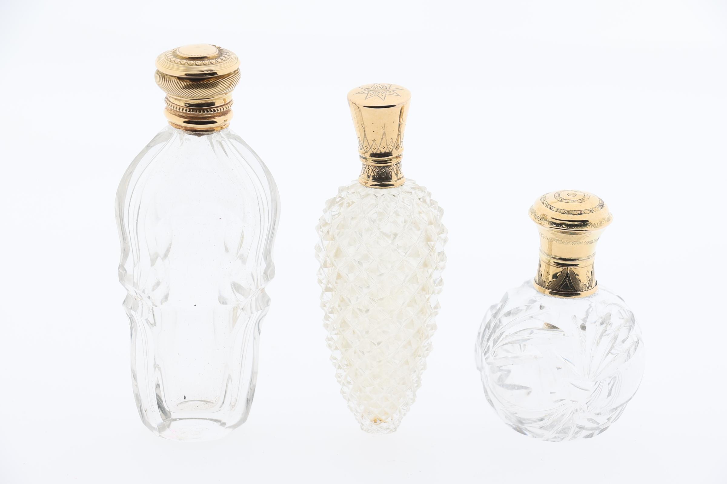 3 Kristallen met gouden odeurflacons met gouden dop, 19e eeuw, h.11, 10 en 7 cm.