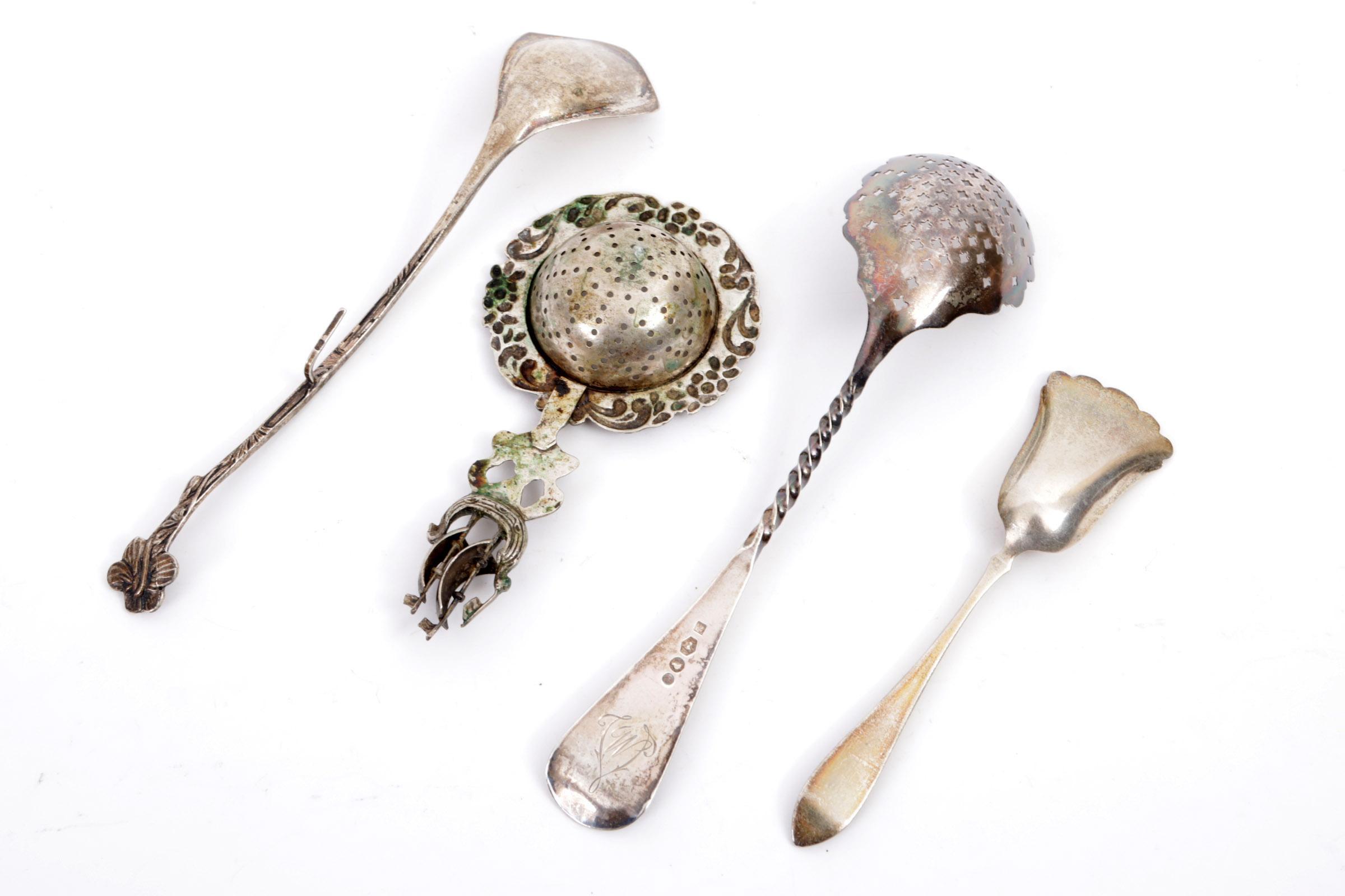 Koopje van 2e gehalte zilveren suikerschep, poederstrooier, theezeef en een roomlepel, 105 gram