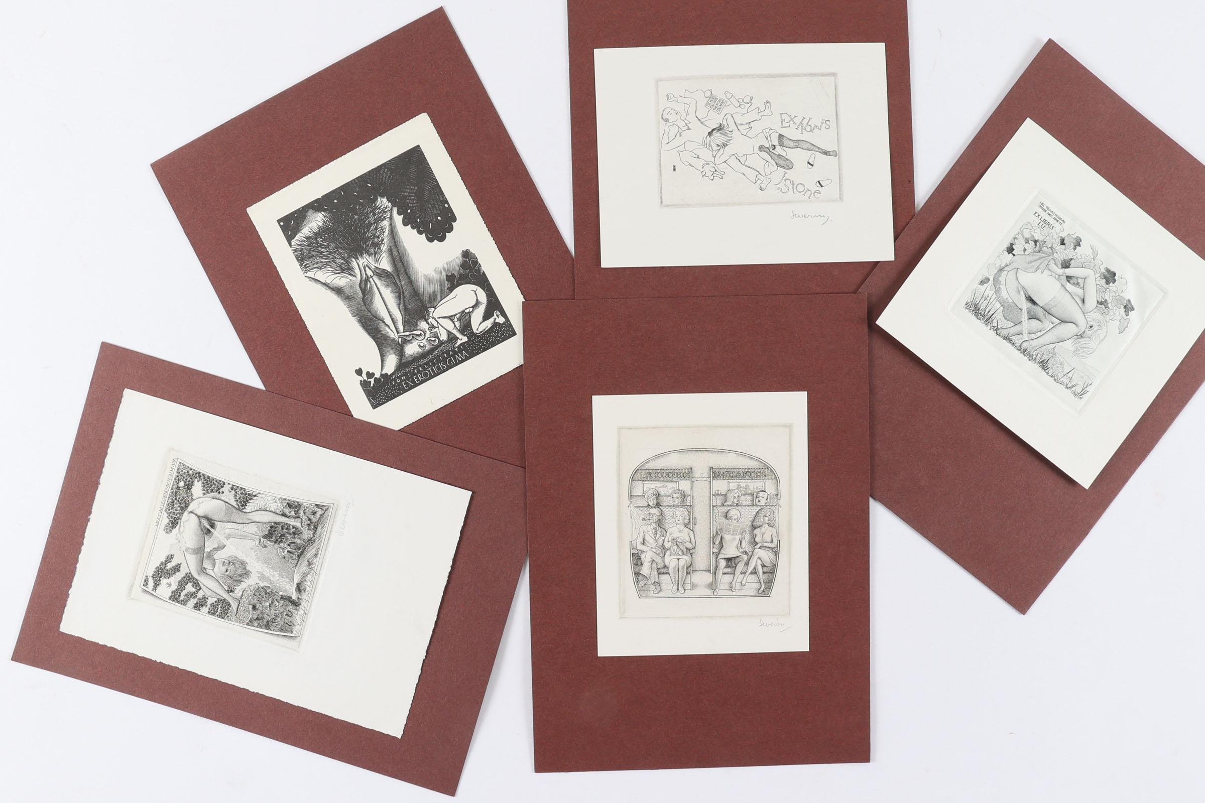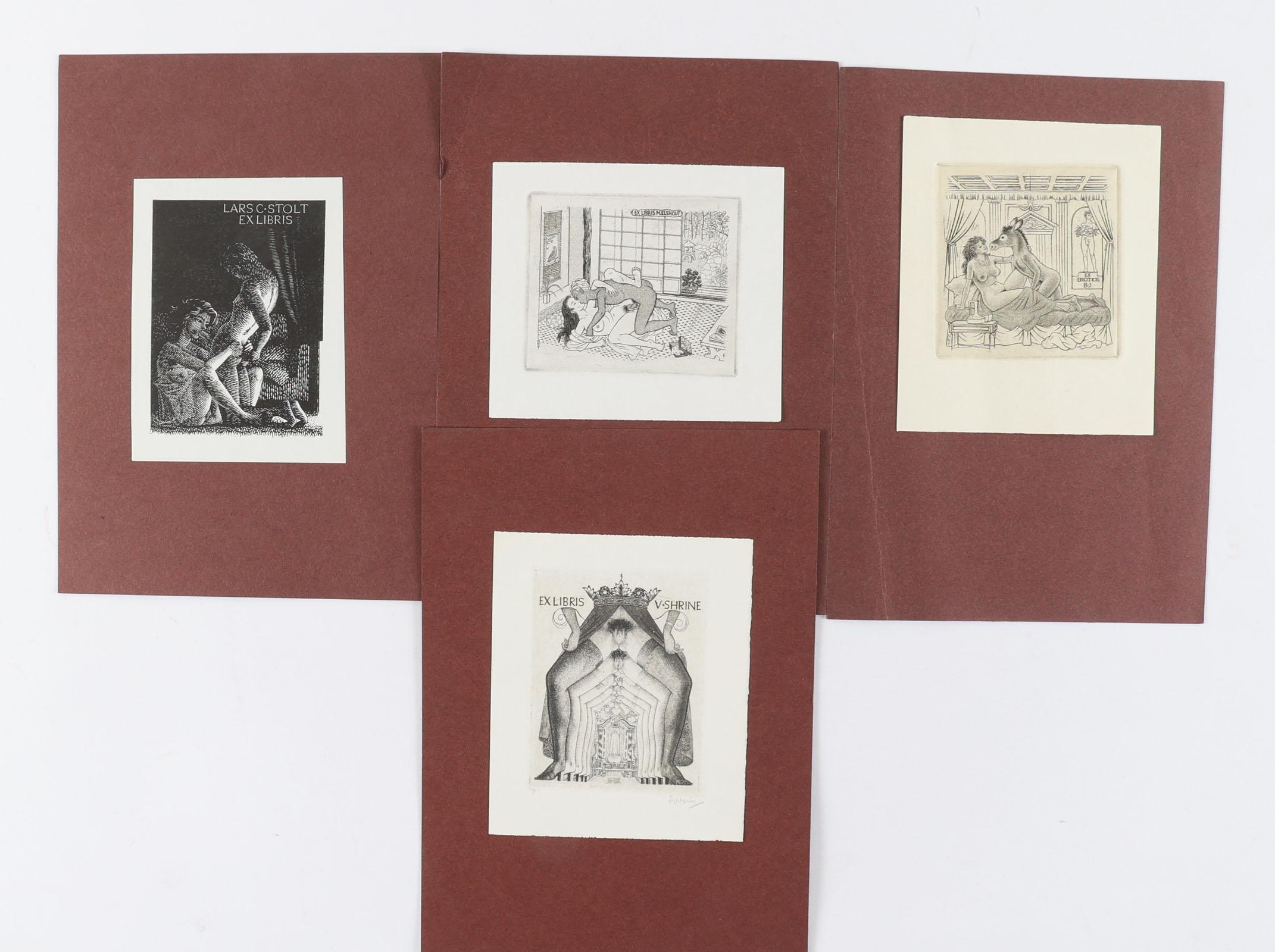Severin, M., 12 exlibris, erotisch, (7 x C2, 2 x L, 3 x X2), 4 x gesigneerd, opgeplakt. Voor Elshout, B.J., Shrine, Stone, I.V., Shaftel, Smith, Stolt, Gima, J.B.H..