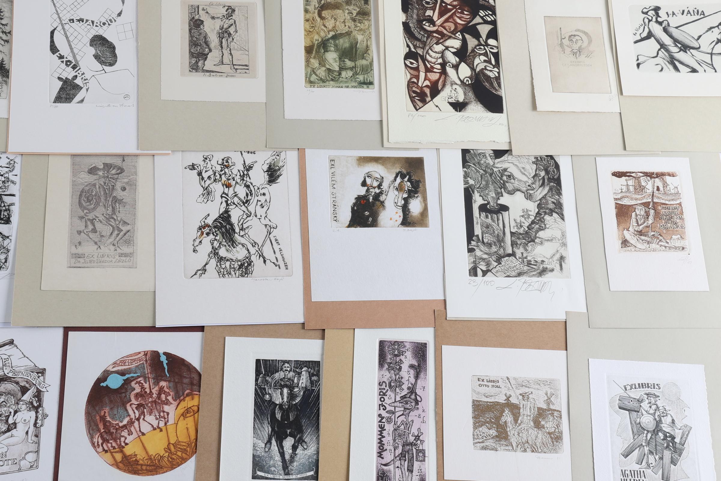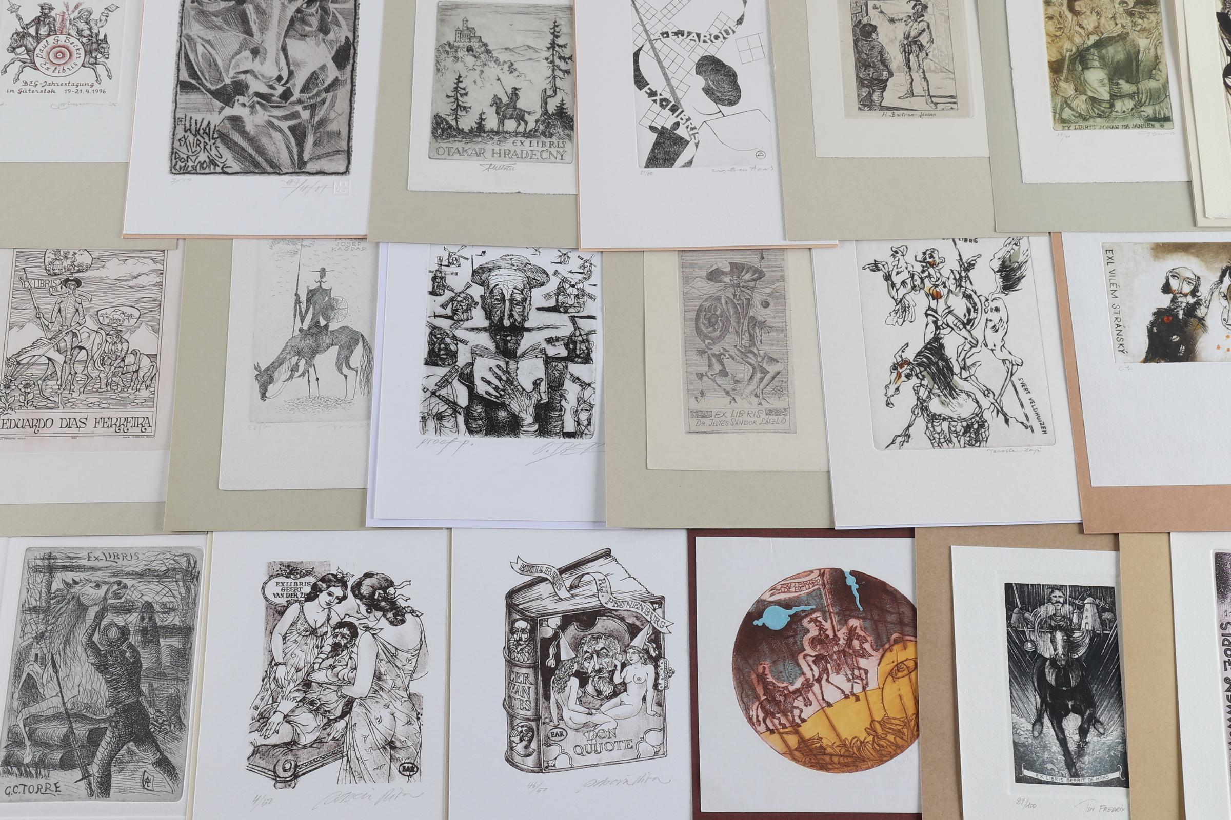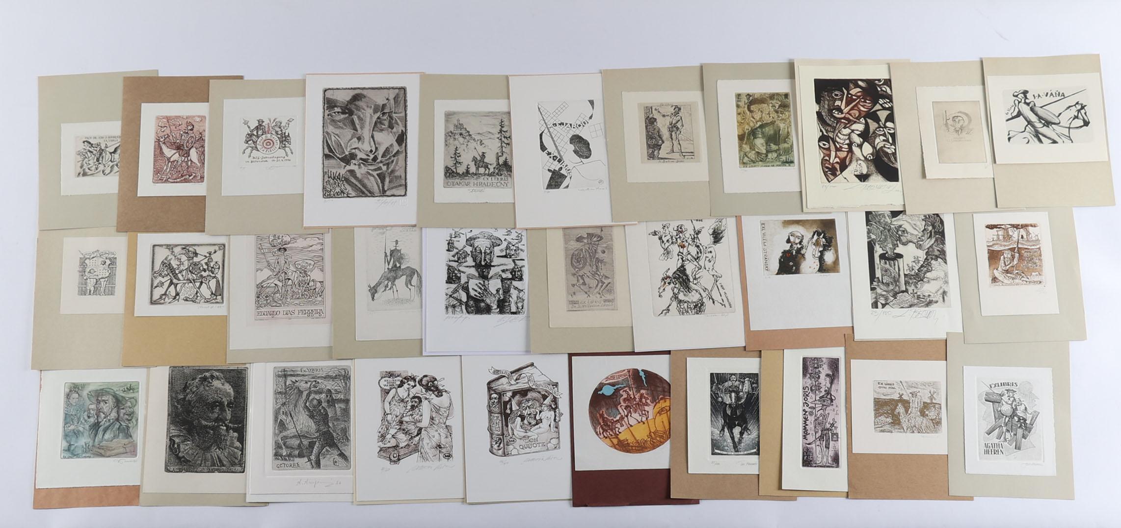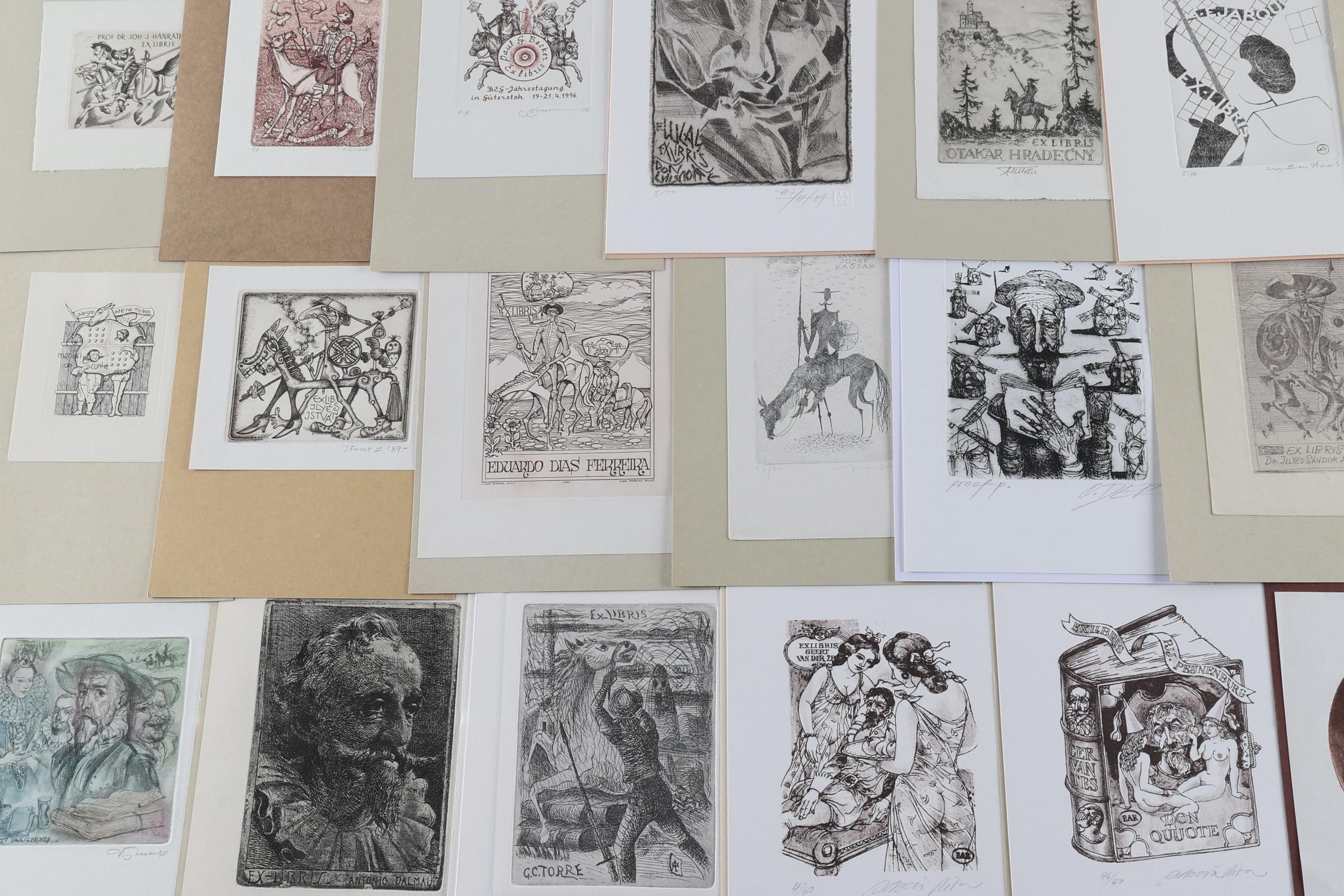 collectie van plm. 30 exlibris, thema: Don Quichote, Diepdrukken / litho, opgeplakt, plm. 20 x gesigneerd. Werk van o.a. Andriessen, Battermann, Bekker, Bednarek, Boetel, Casalino, Chernetsova, Dajc, Cinybulk, Deak, Dergachov, Paes Ferreira, Feszt, Hlavaty.