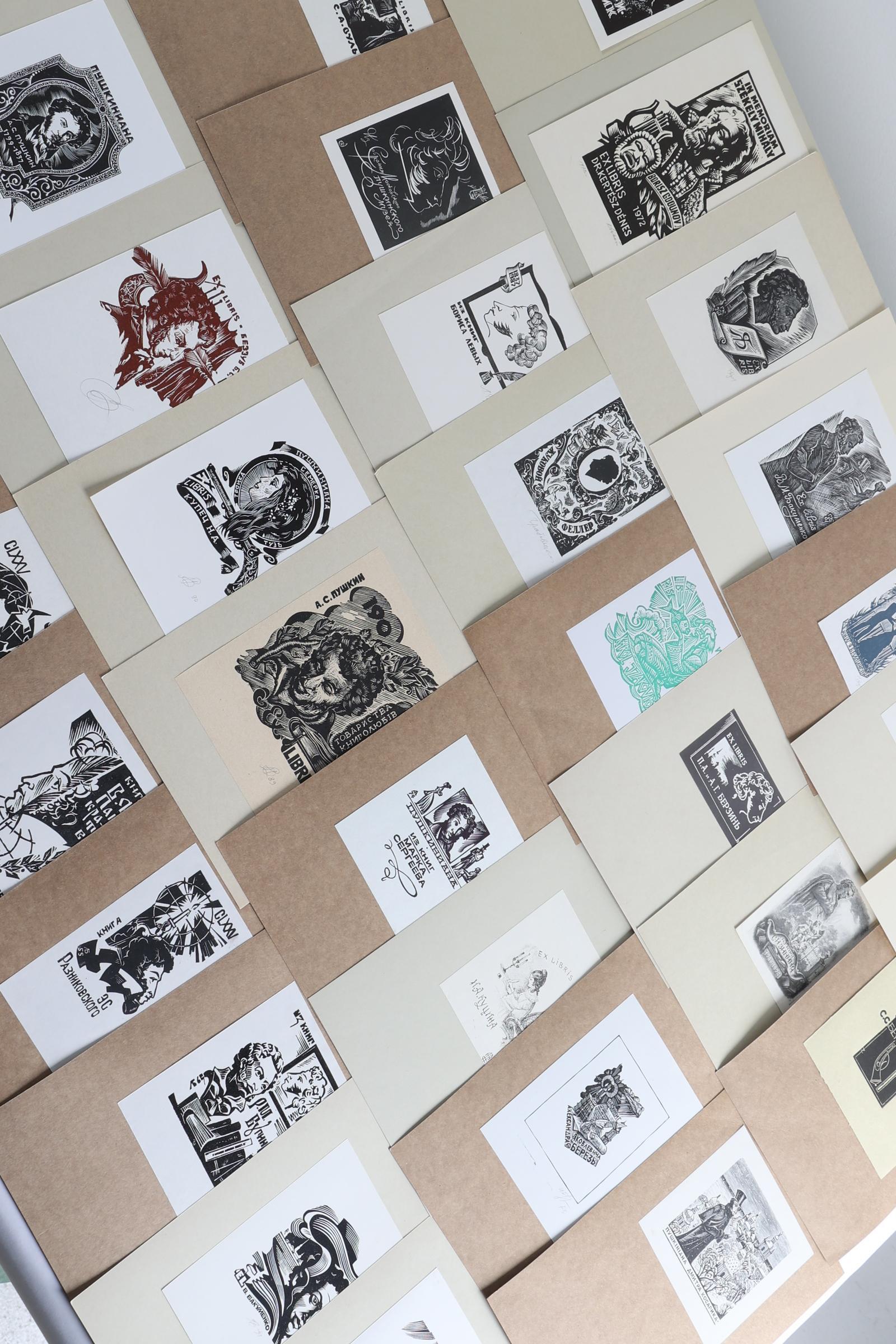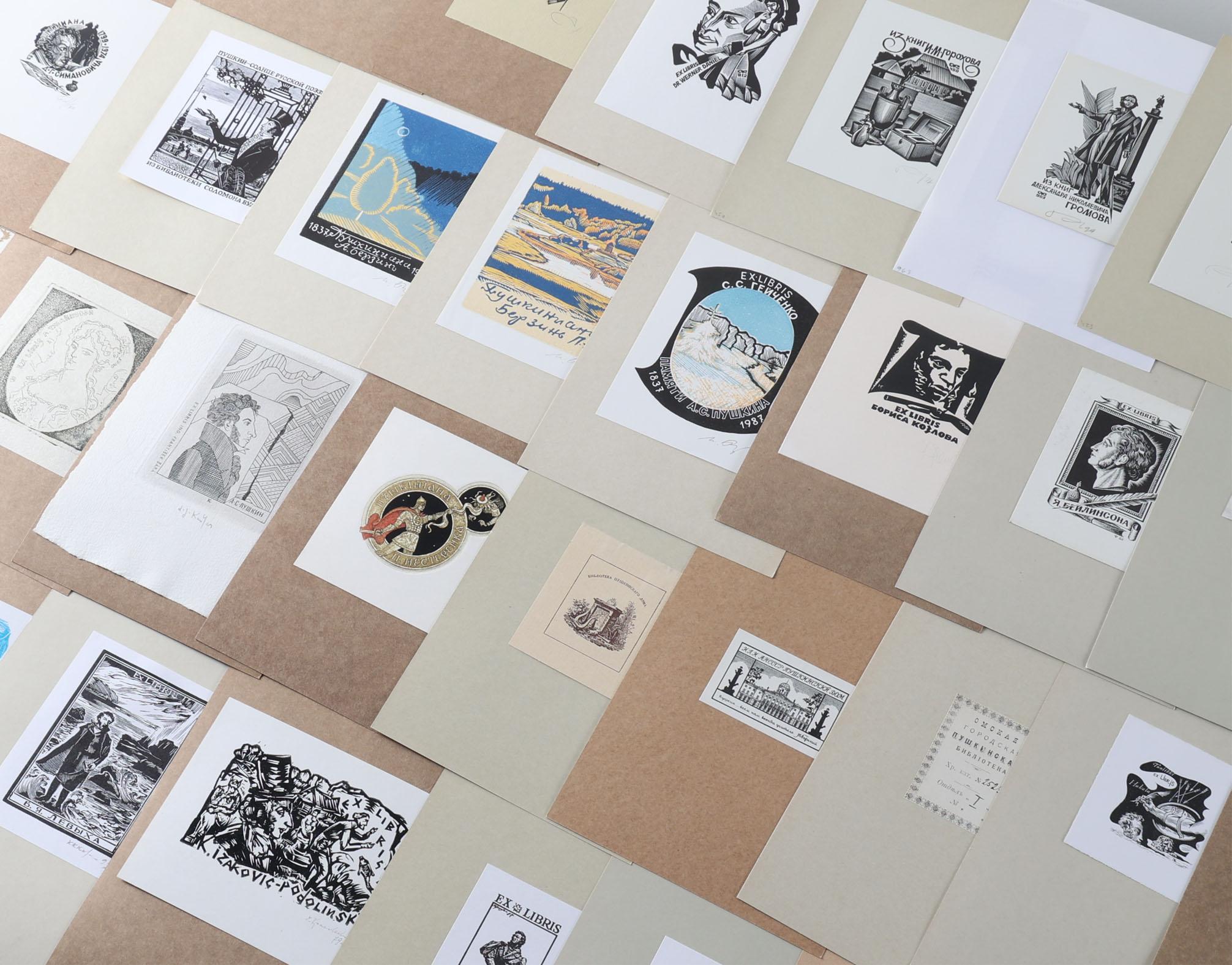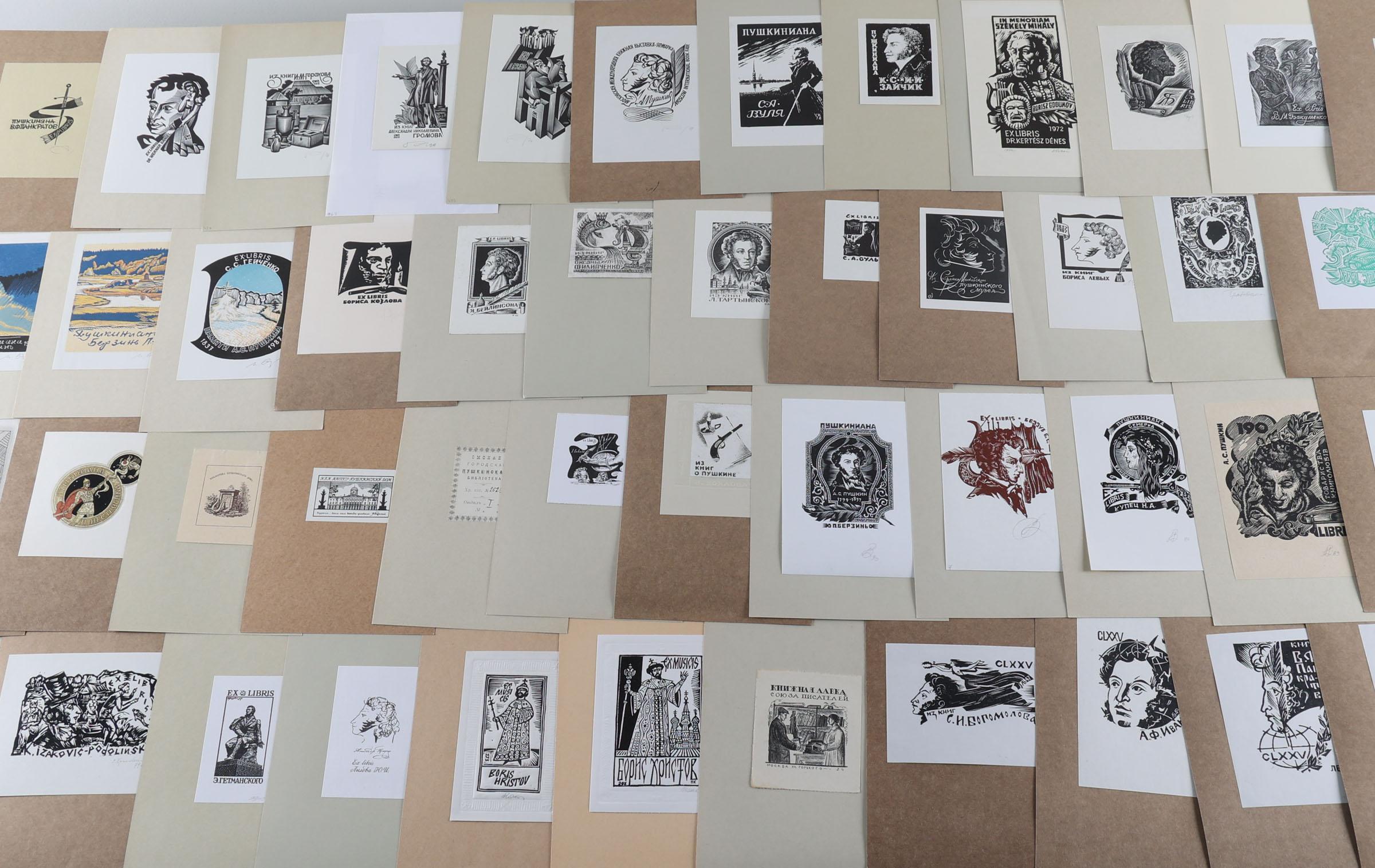 collectie van plm. 110 exlibris, thema: Pusjkin. Vooral Russische kunstenaars, letters A t/m K. Enkele diepdruk, rest hoogdruk / vlakdruk. Plm. de helft is gesigneerd. Werk van o.a. Bekker, Kaspar, Agirba, Jozwik, Kalashnikov, Kuznetzov, Lebedeo, Koslovski, Koulekov.