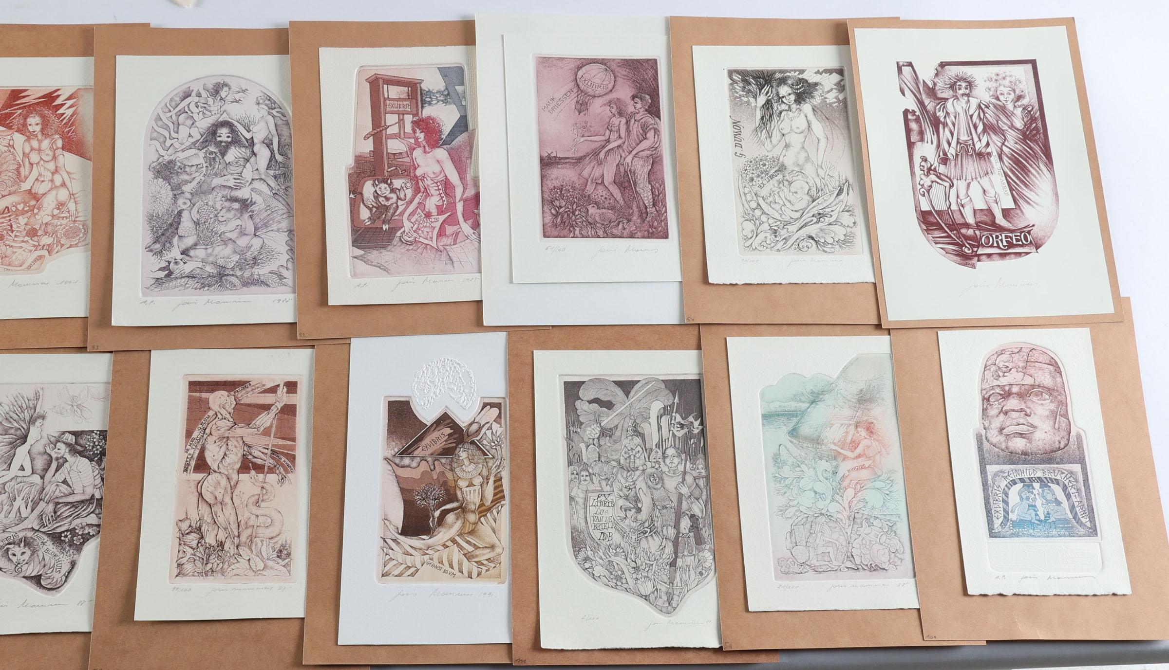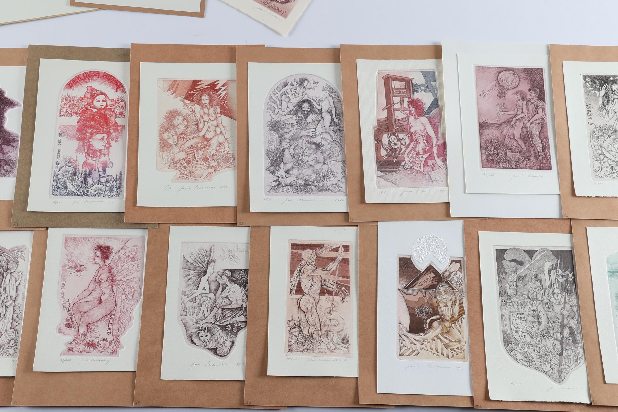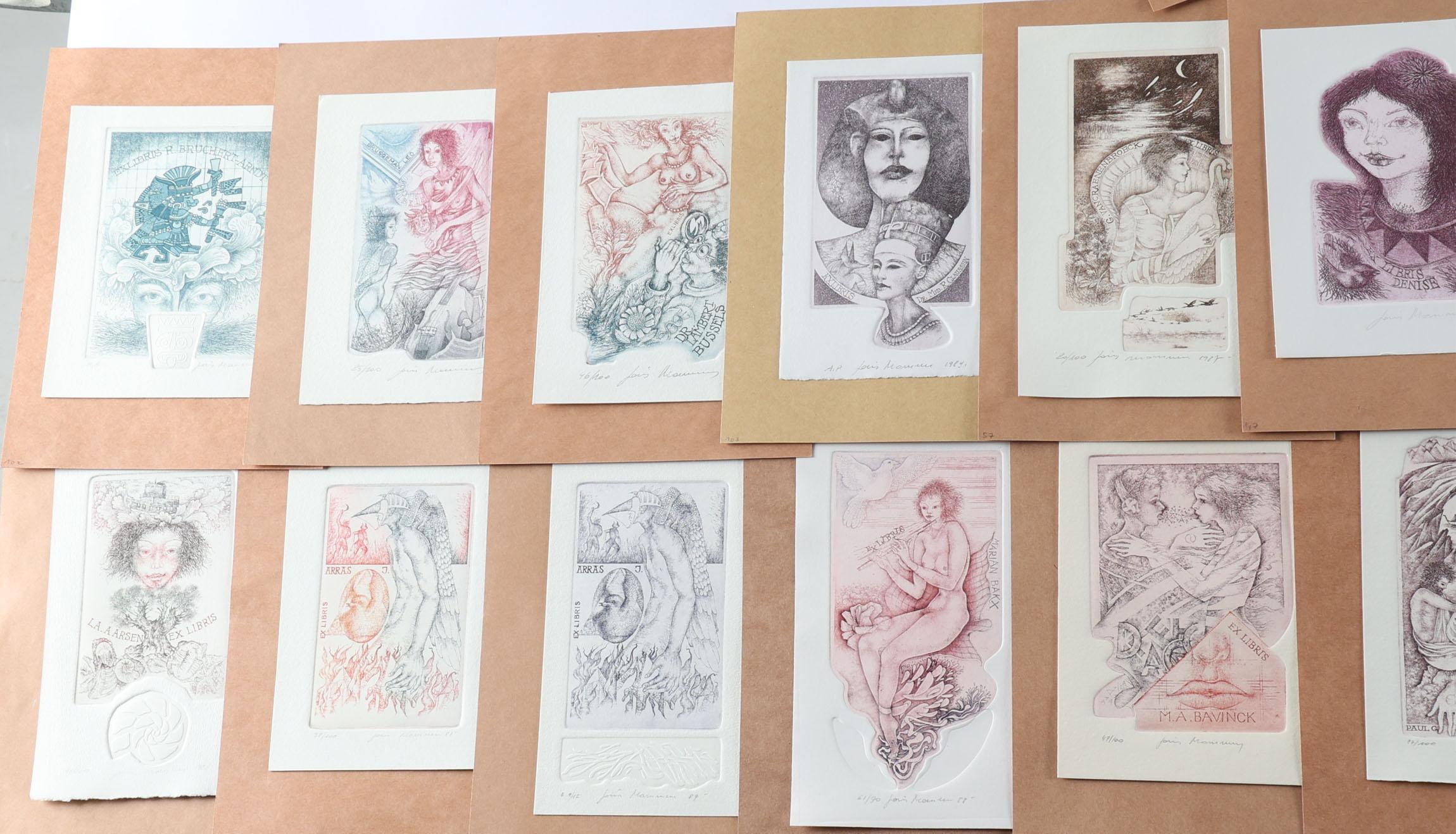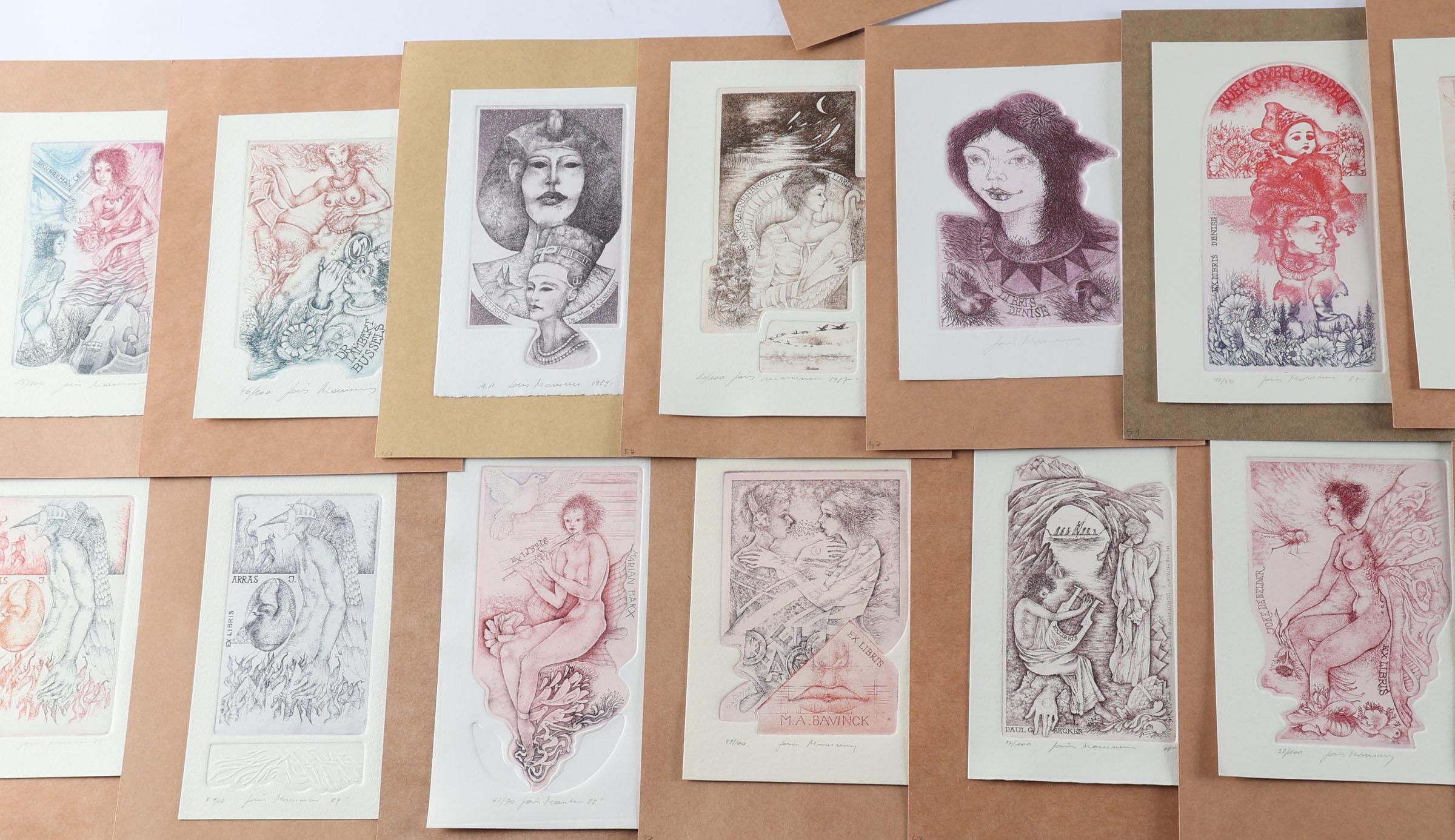Mommen, J., 30 exlibris, 26 x C3C5 (meestal meerkleuren), rest litho. Veel vrouwelijk naakt, eigenaars A t/m D. Opgeplakt.