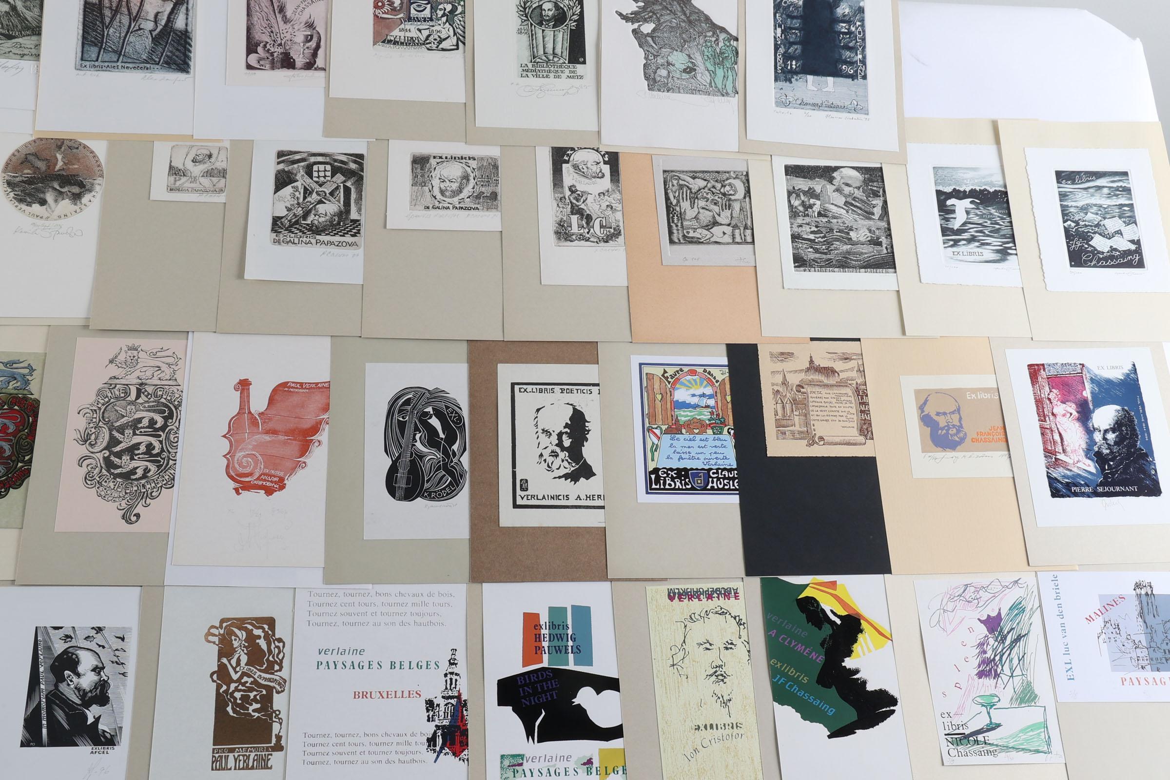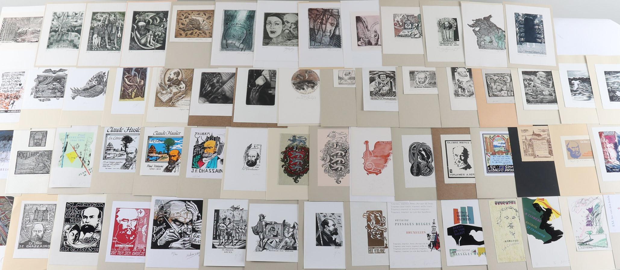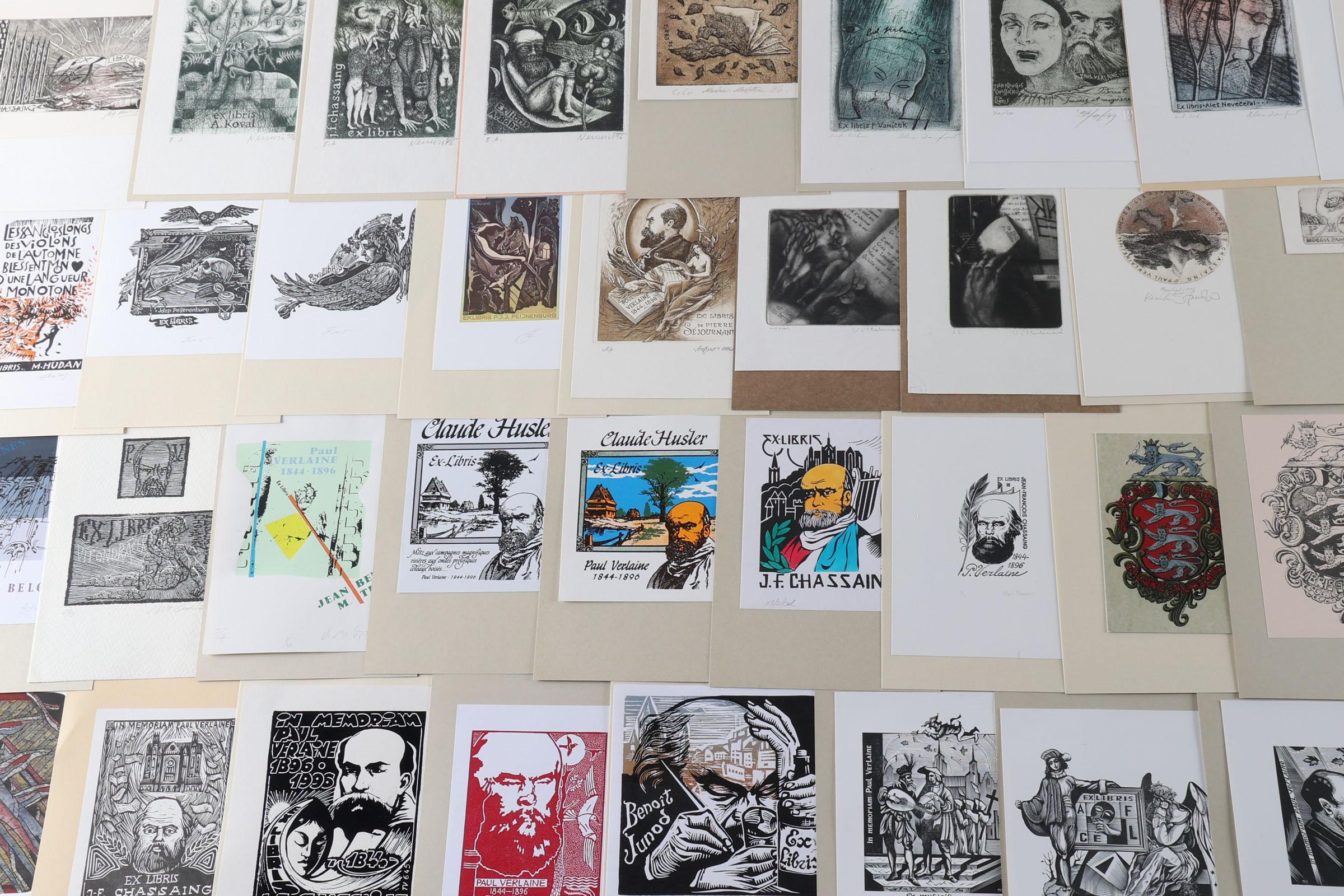 collectie van plm. 60 exlibris, thema: Paul Verlaine. Plm. 25 x diepdruk, rest hoogdruk / vlakdruk. Opgeplakt, deels gesigneerd. Werk van o.a. Casalino, Hervai, Hlavaty, Nue, Kazimova, Neuwirt, Ljuksin, Laufrova, Stanclova, Woznyj, Agirba, Ondracek, Schwarzmann