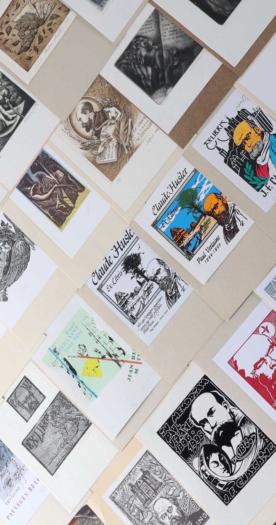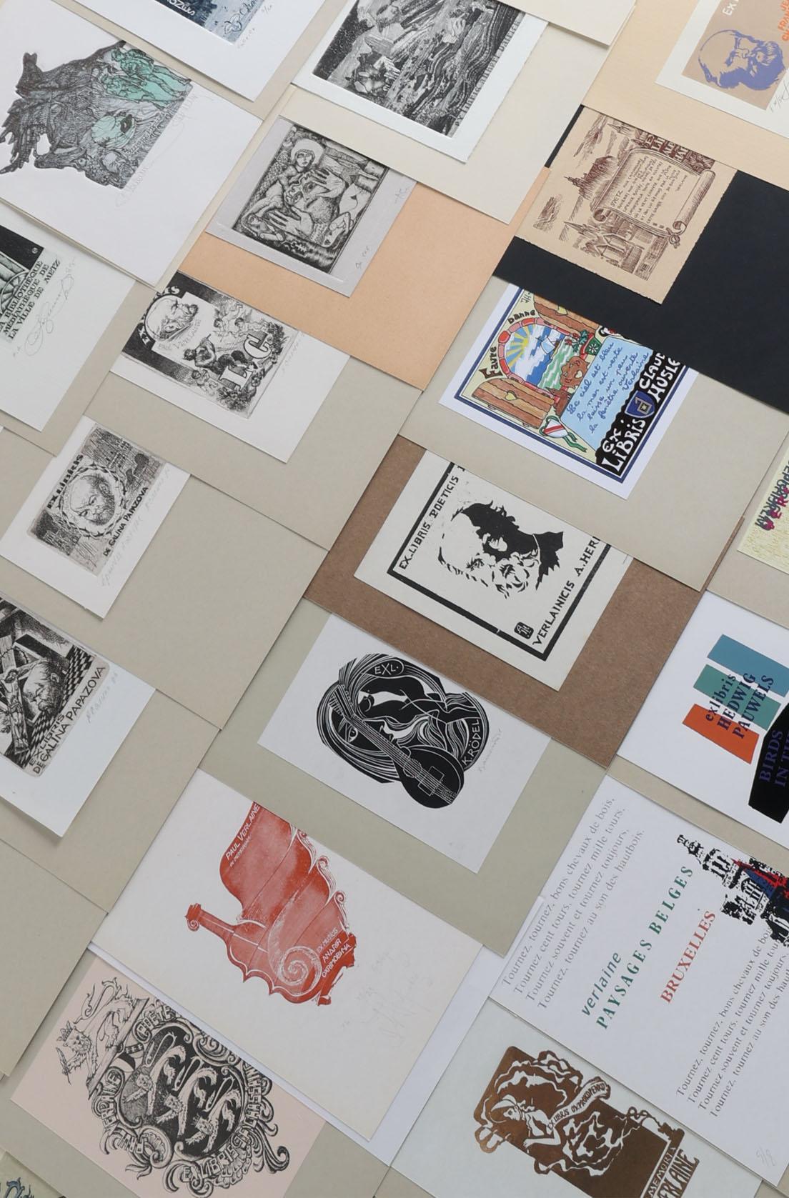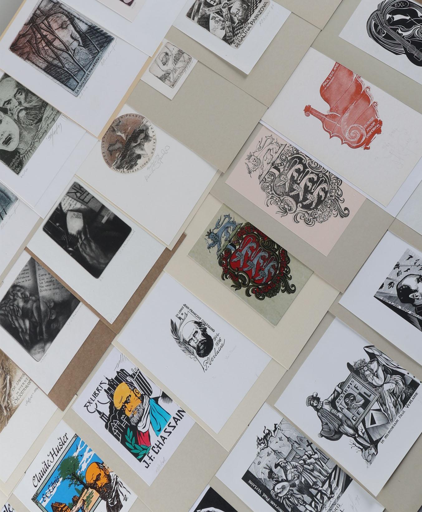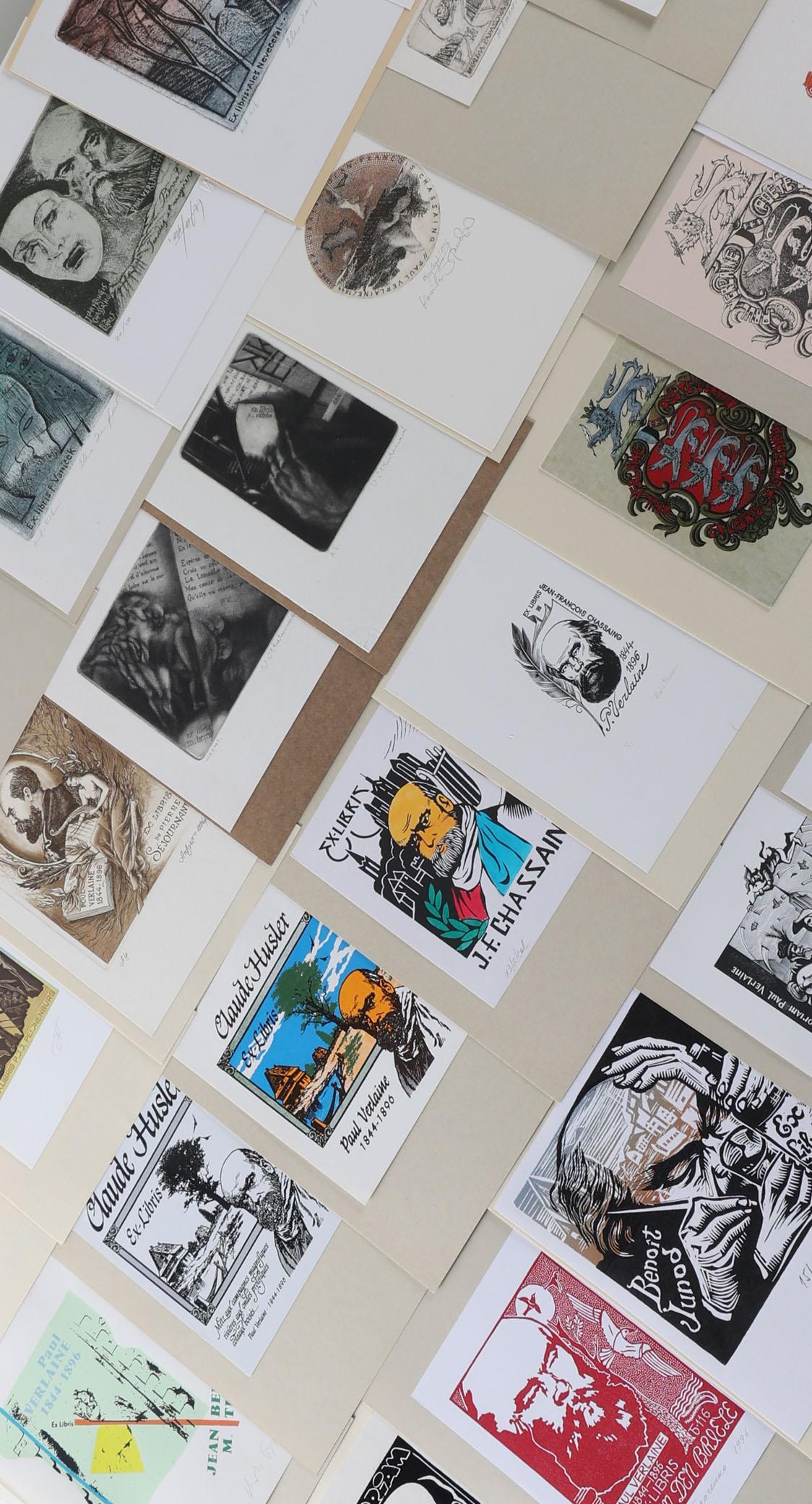 collectie van plm. 60 exlibris, thema: Paul Verlaine. Plm. 25 x diepdruk, rest hoogdruk / vlakdruk. Opgeplakt, deels gesigneerd. Werk van o.a. Casalino, Hervai, Hlavaty, Nue, Kazimova, Neuwirt, Ljuksin, Laufrova, Stanclova, Woznyj, Agirba, Ondracek, Schwarzmann