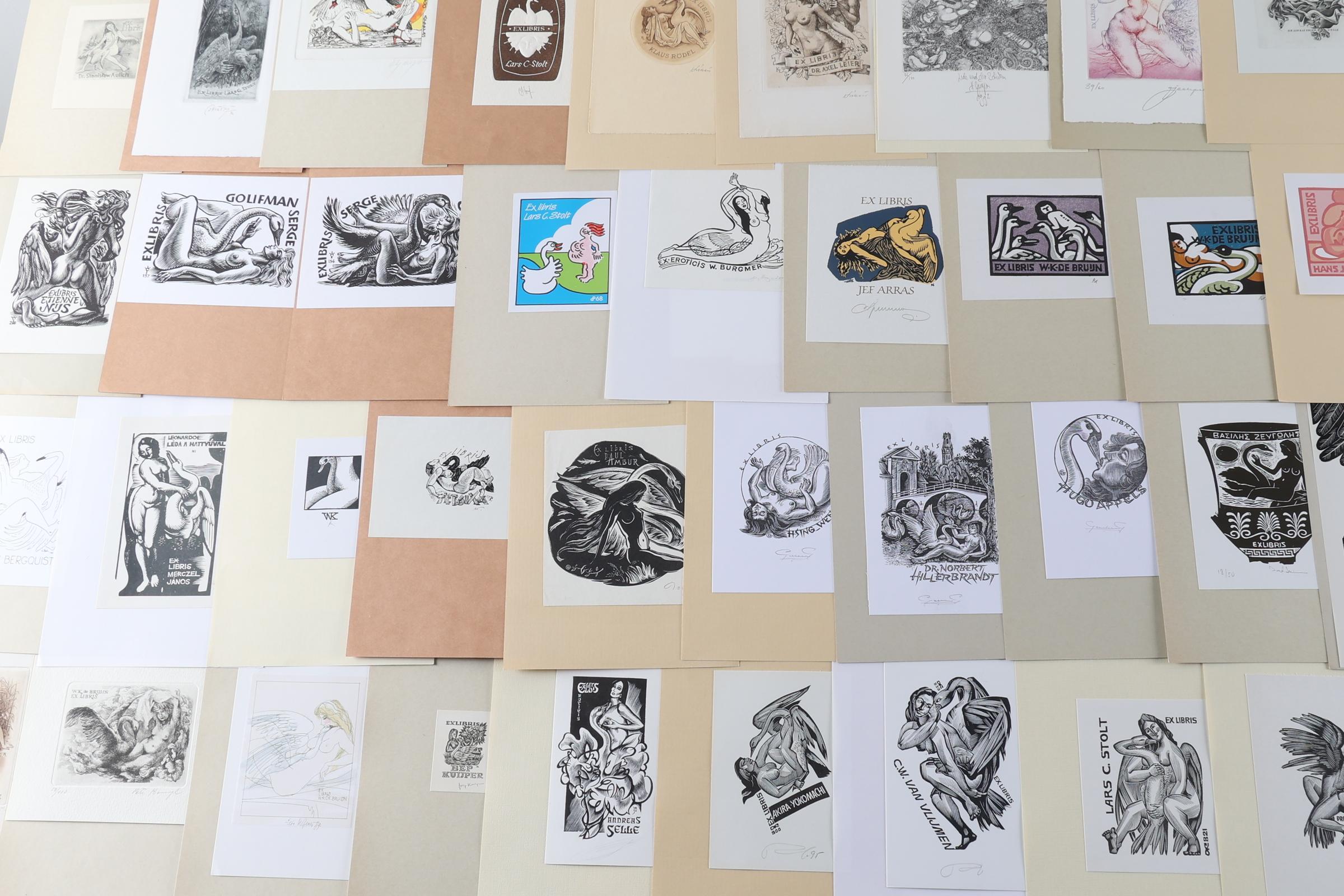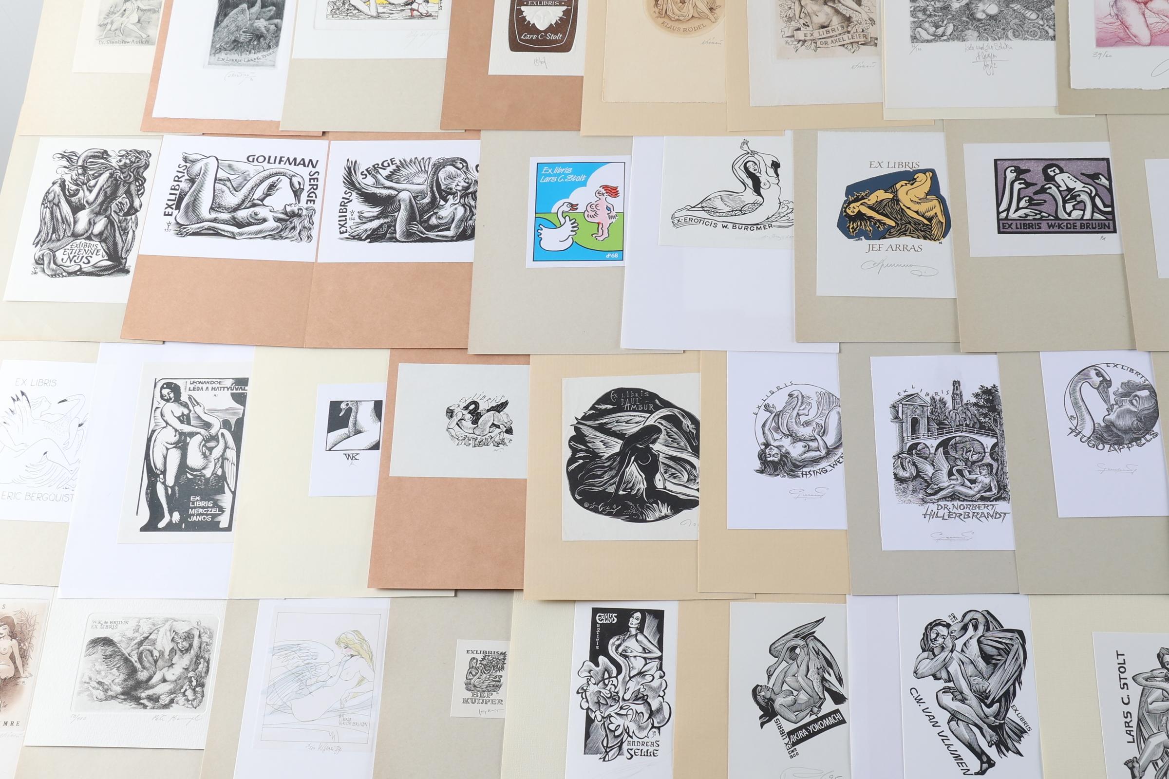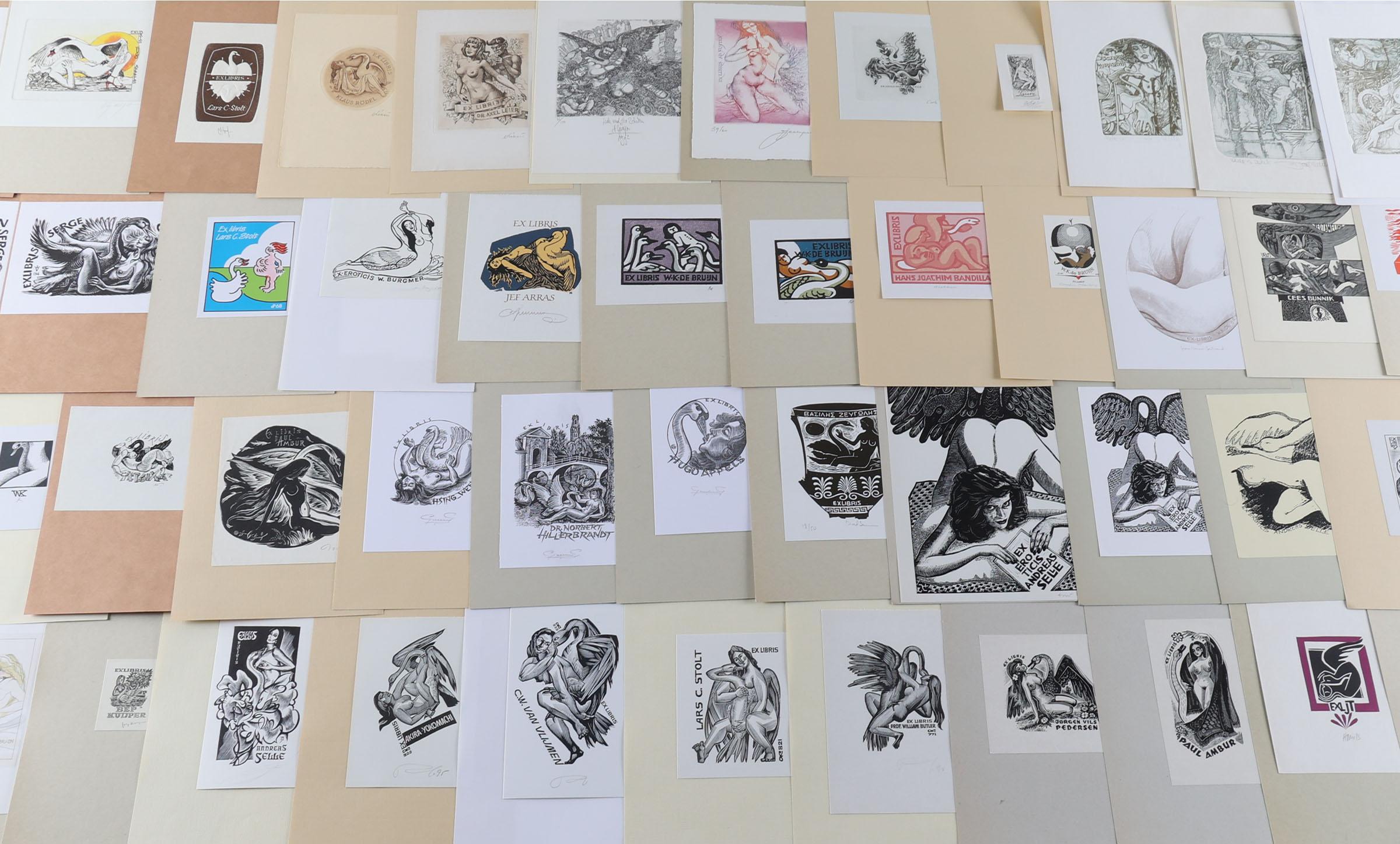 collectie van plm. 80 exlibris, thema: 'Leda en de Zwaan', gemaakt door kunstenaars A t/m K. Plm. 30 x diepdruk (vrijwel alle gesigneerd), rest hoogdruk / vlakdruk. Opgeplakt. Kunstenaars o.a. Antimonova, Bednarek, Christiaens, Colom, Van Damme, Eizans, Hampl, Hlavaty, Juergens, Kekesi, De Koster, Kratky, Cepauskas, Battermann, Bertrand, Blokhuis, Gaudaen, Benes.