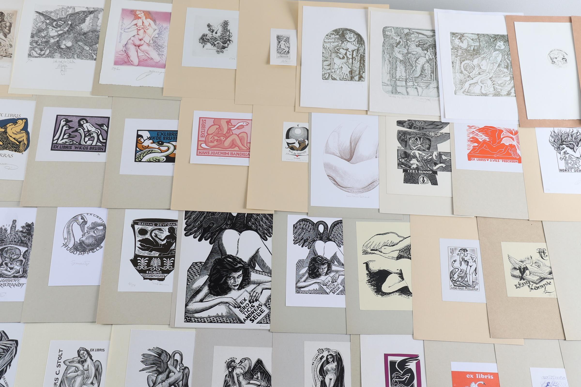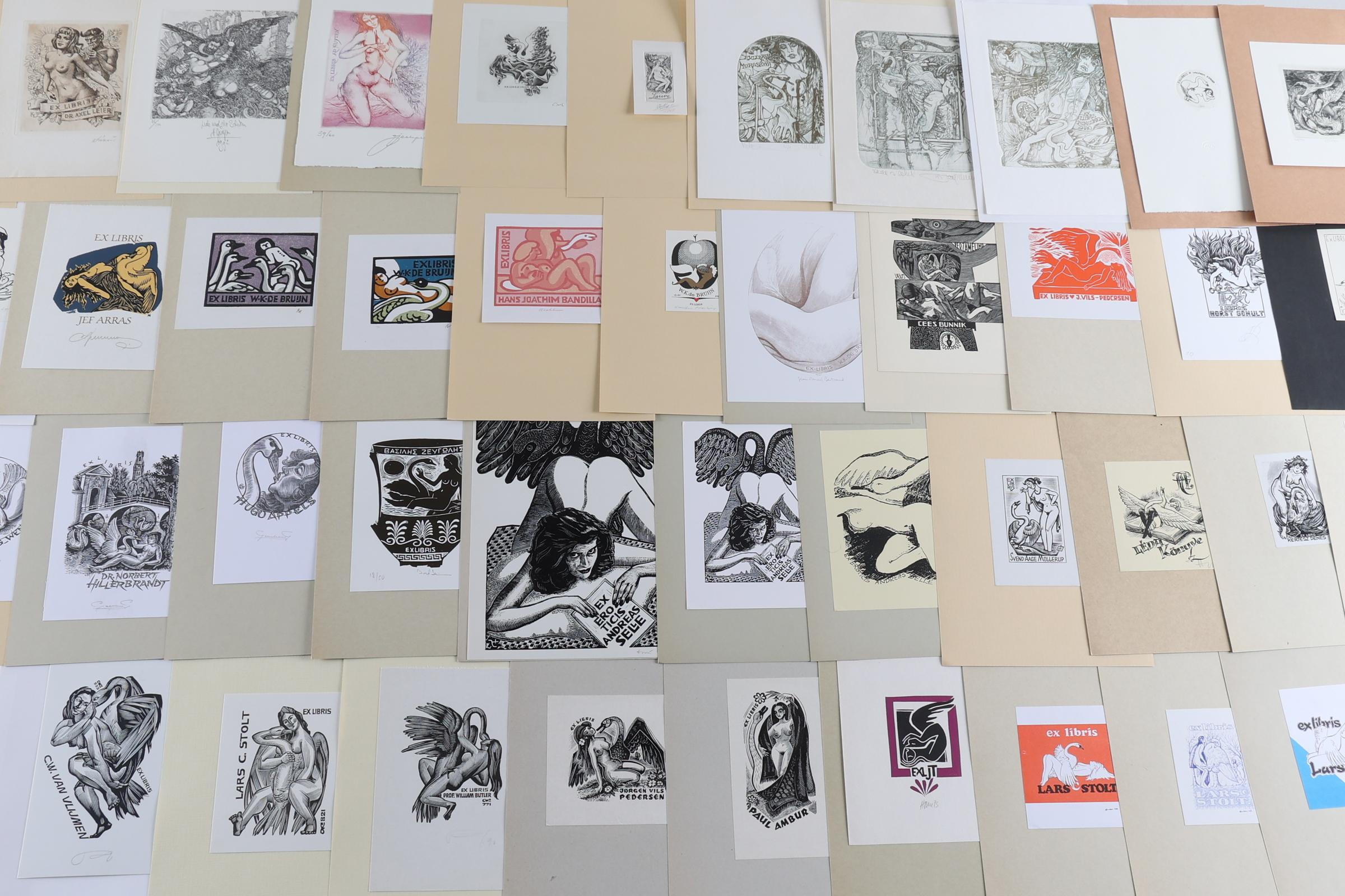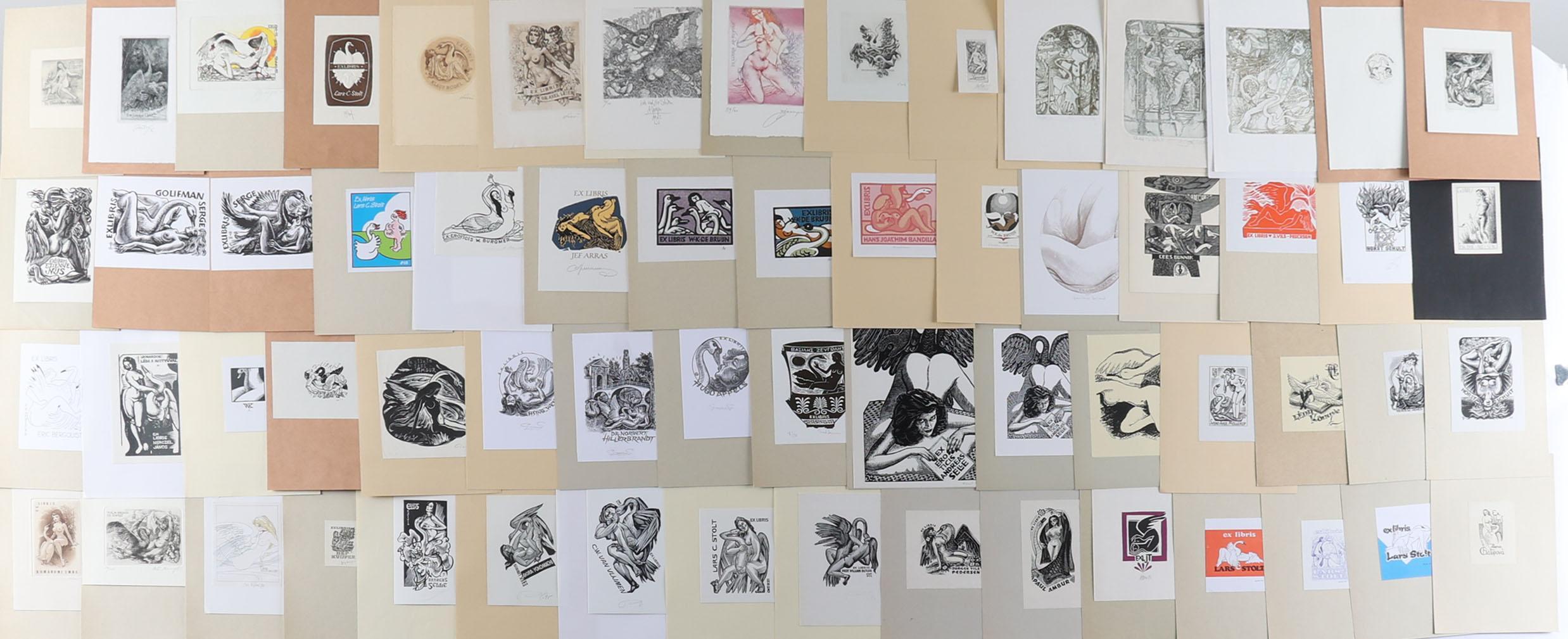 collectie van plm. 80 exlibris, thema: 'Leda en de Zwaan', gemaakt door kunstenaars A t/m K. Plm. 30 x diepdruk (vrijwel alle gesigneerd), rest hoogdruk / vlakdruk. Opgeplakt. Kunstenaars o.a. Antimonova, Bednarek, Christiaens, Colom, Van Damme, Eizans, Hampl, Hlavaty, Juergens, Kekesi, De Koster, Kratky, Cepauskas, Battermann, Bertrand, Blokhuis, Gaudaen, Benes.