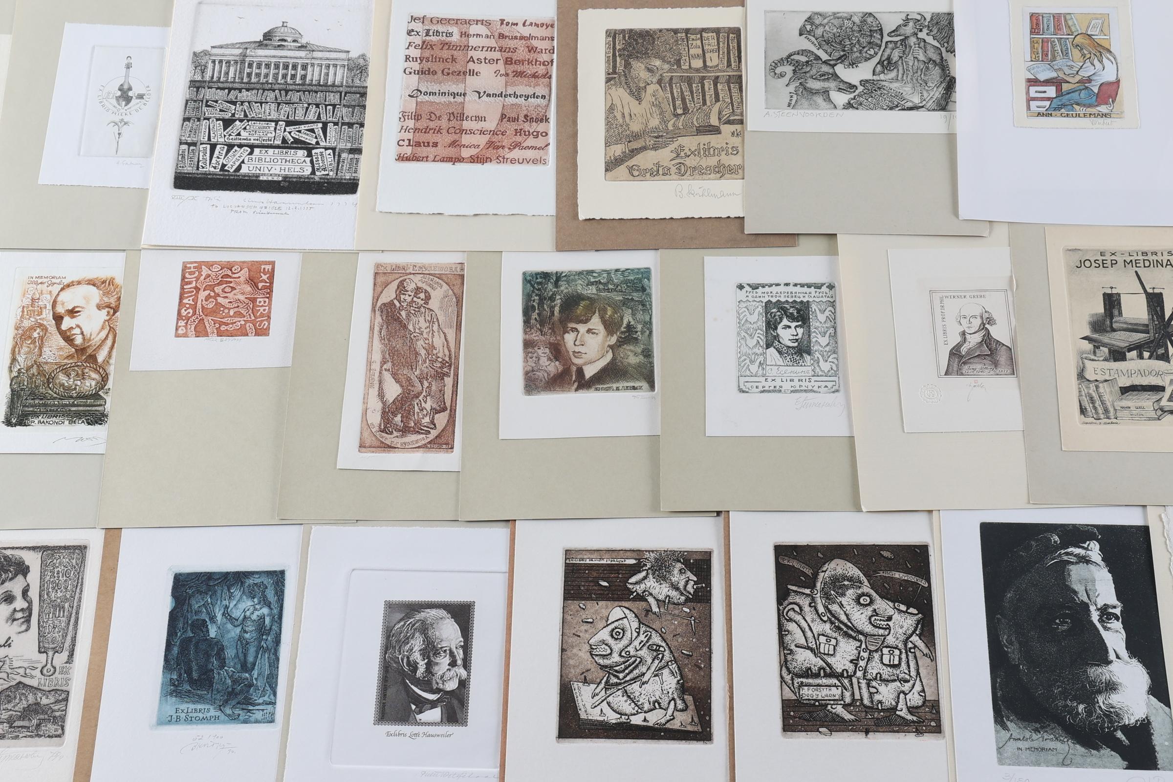 collectie van plm. 40 exlibris, diepdruk, thema: literatuur / auteurs. Opgeplakt, deels gesigneerd. werk van o.a. Bekker, Van Damme, Kirnitsky, Hlavaty, Achttienribbe, Mariman, Volkamer, Keller, Pauwels, Wetselaar, Kratky, Stauf.