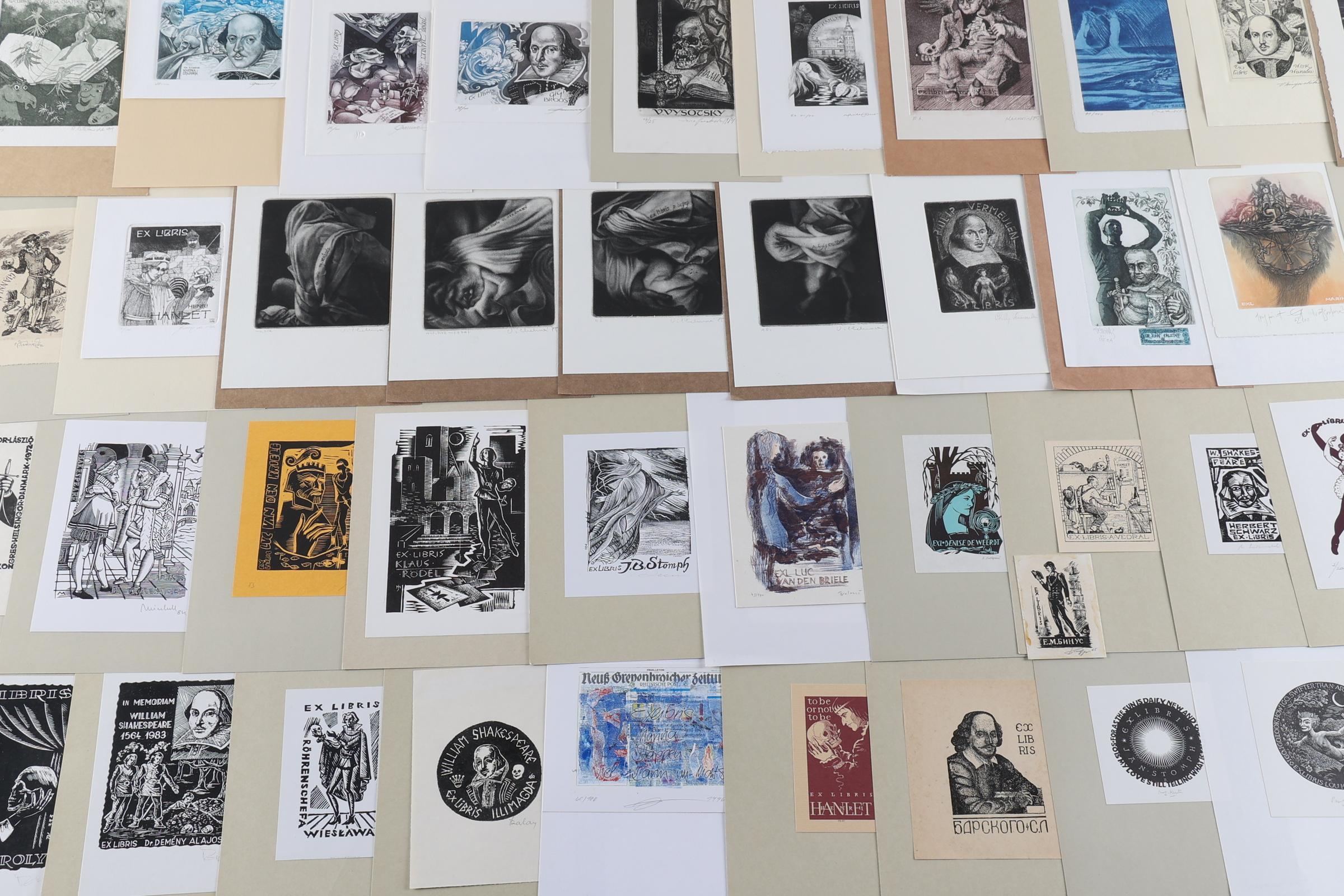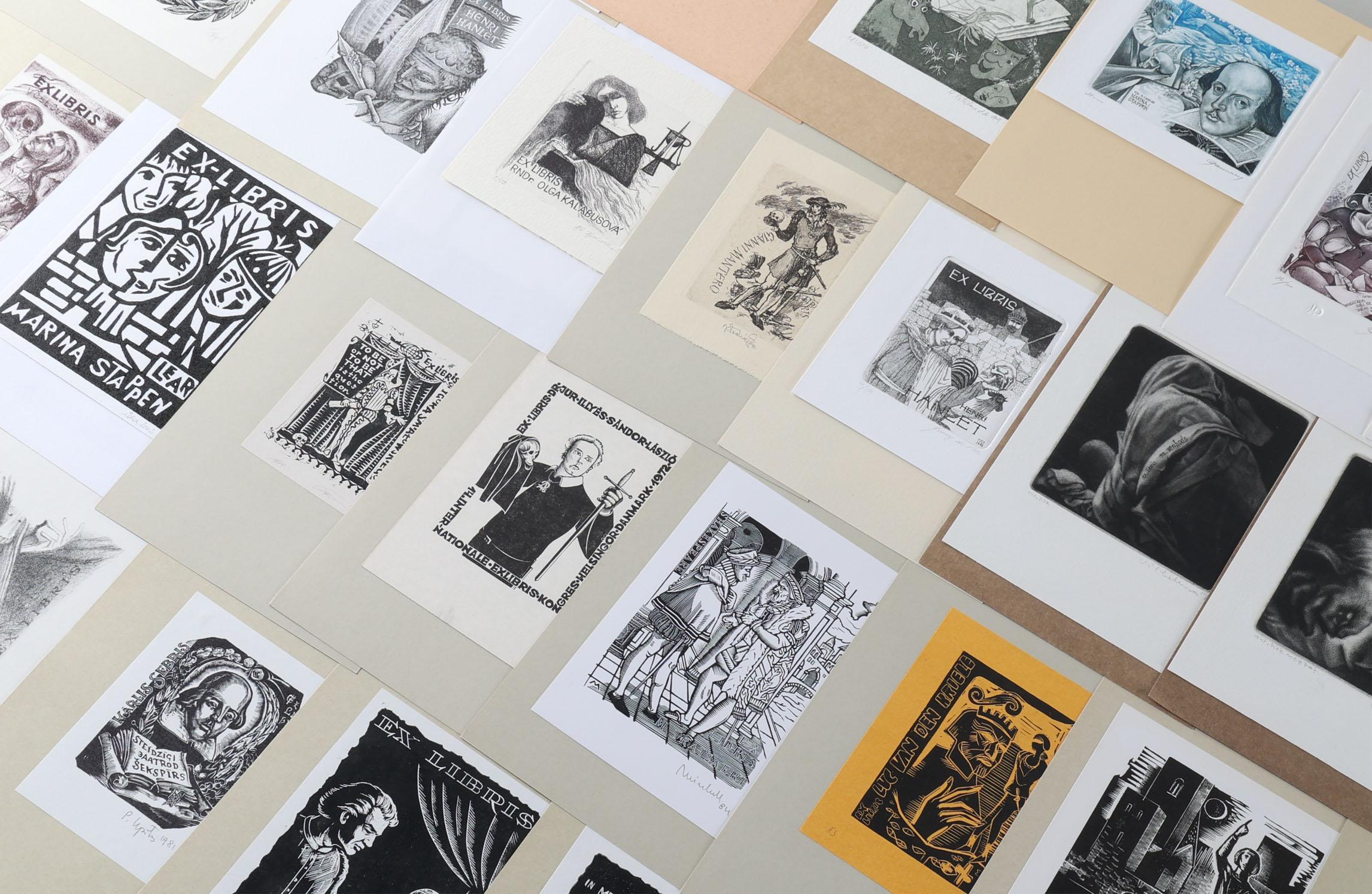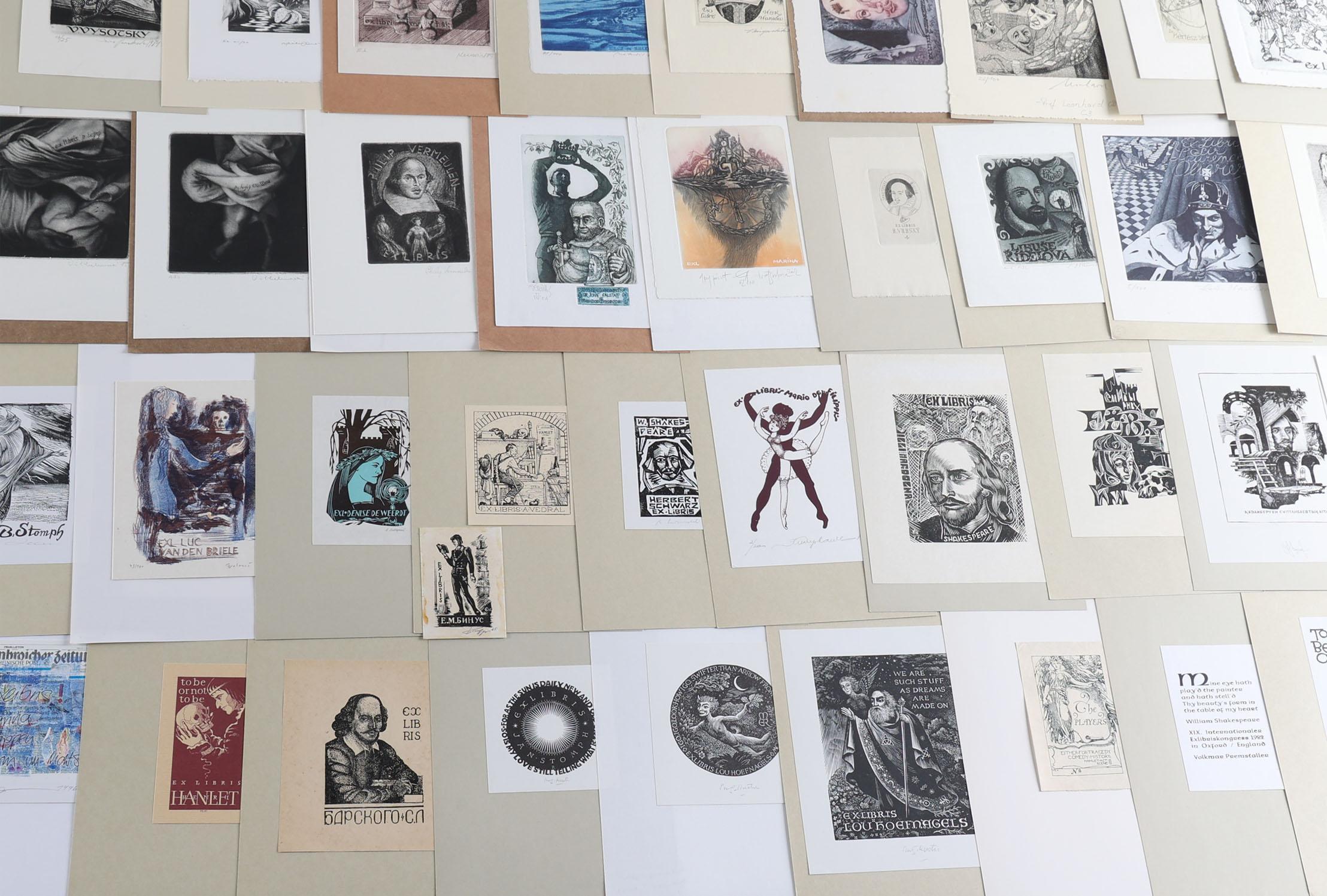 collectie van plm. 80 exlibris, thema: Shakespeare. Gemaakt door kunstenaars met de letters K t/m V. Plm. 30 x diepdruk (vrijwel alle gesigneerd), rest hoogdruk / vlakdruk (deels gesigneerd). Werk van o.a. Kisseljowa, De Vries, Pauwels, Kuehn, Myashita, Neuwirt, Nue, Rovegno, Peterknecht, Vodraszka, Kotrba, Rueter, Koch.
