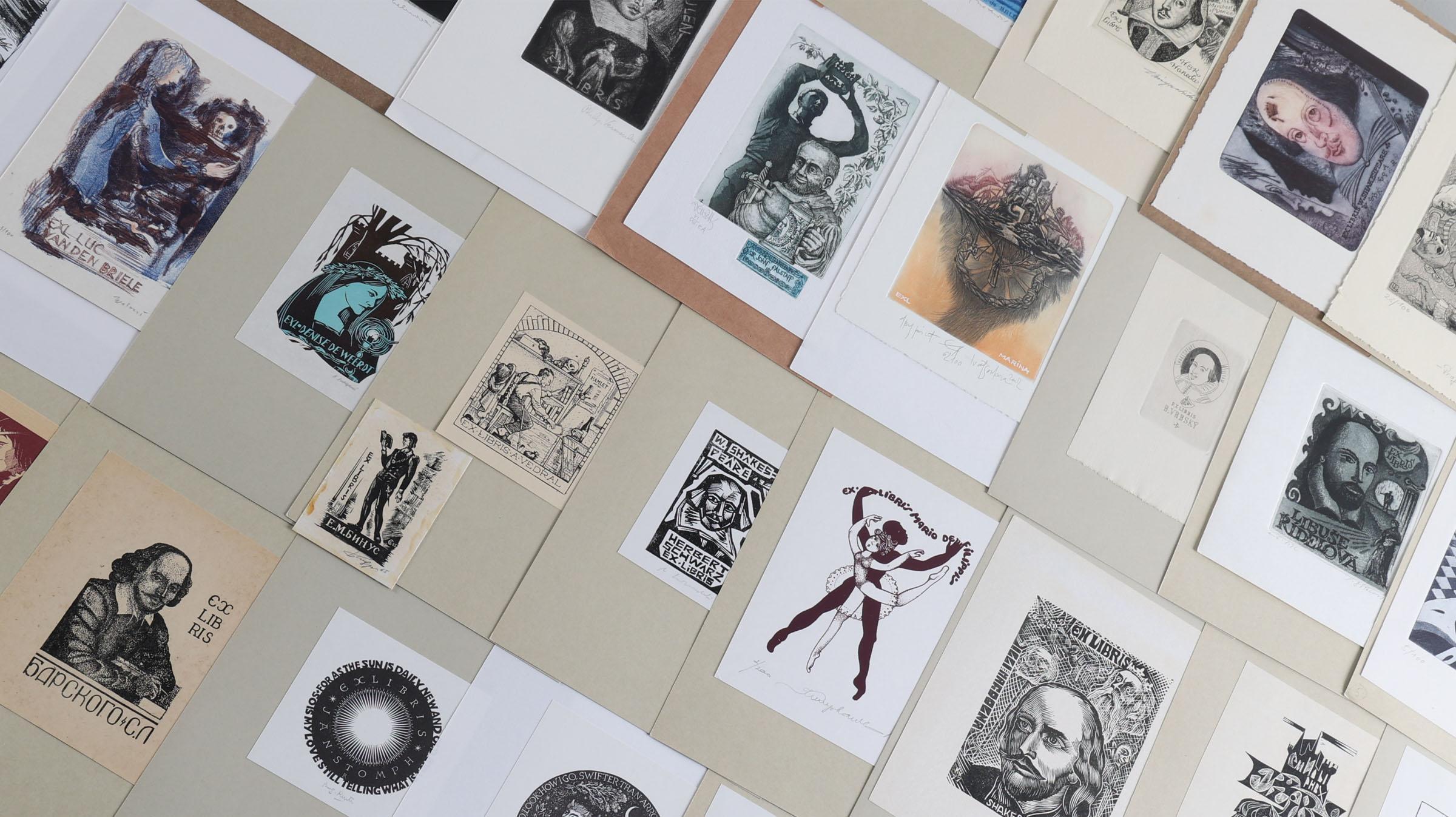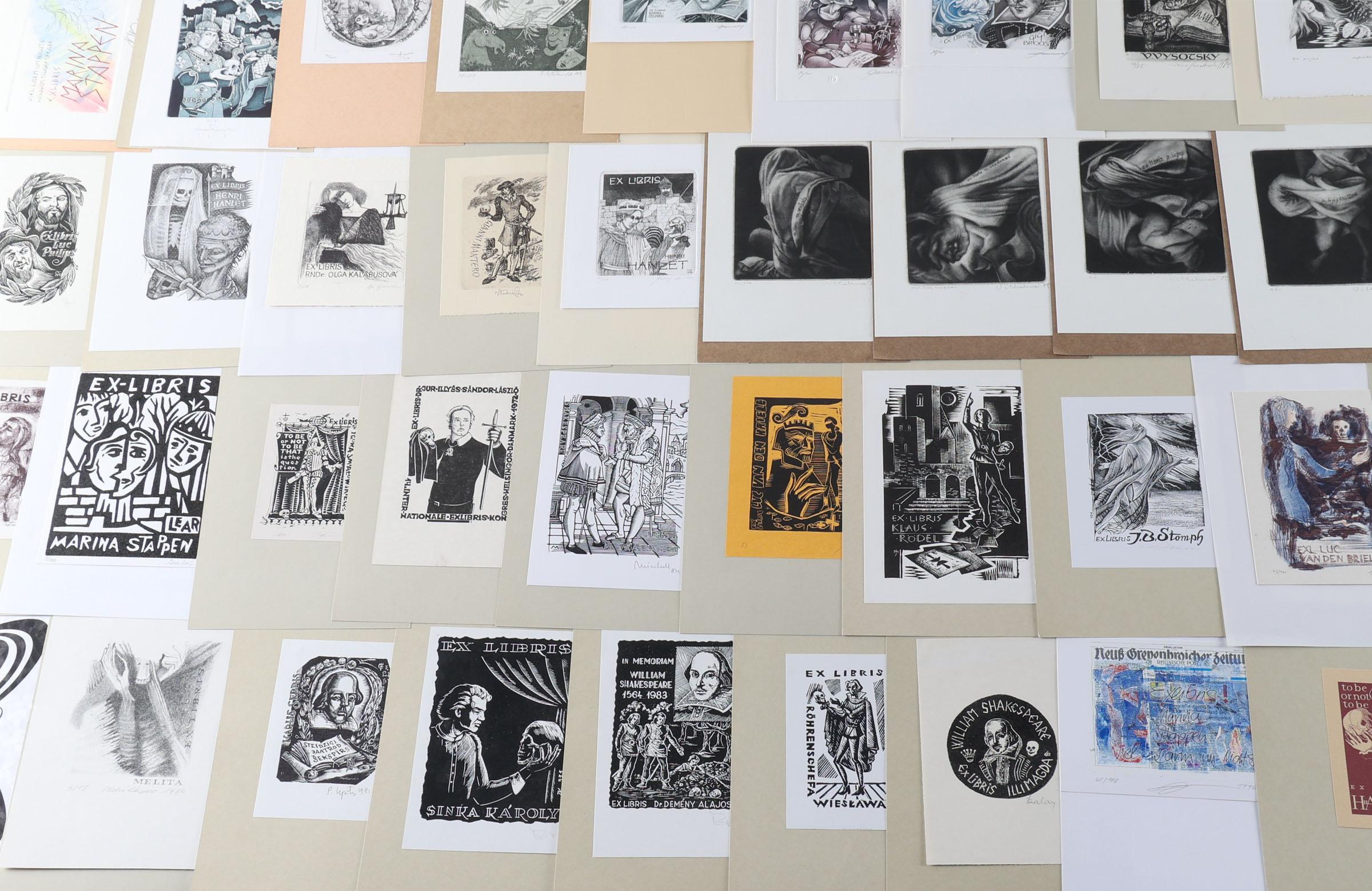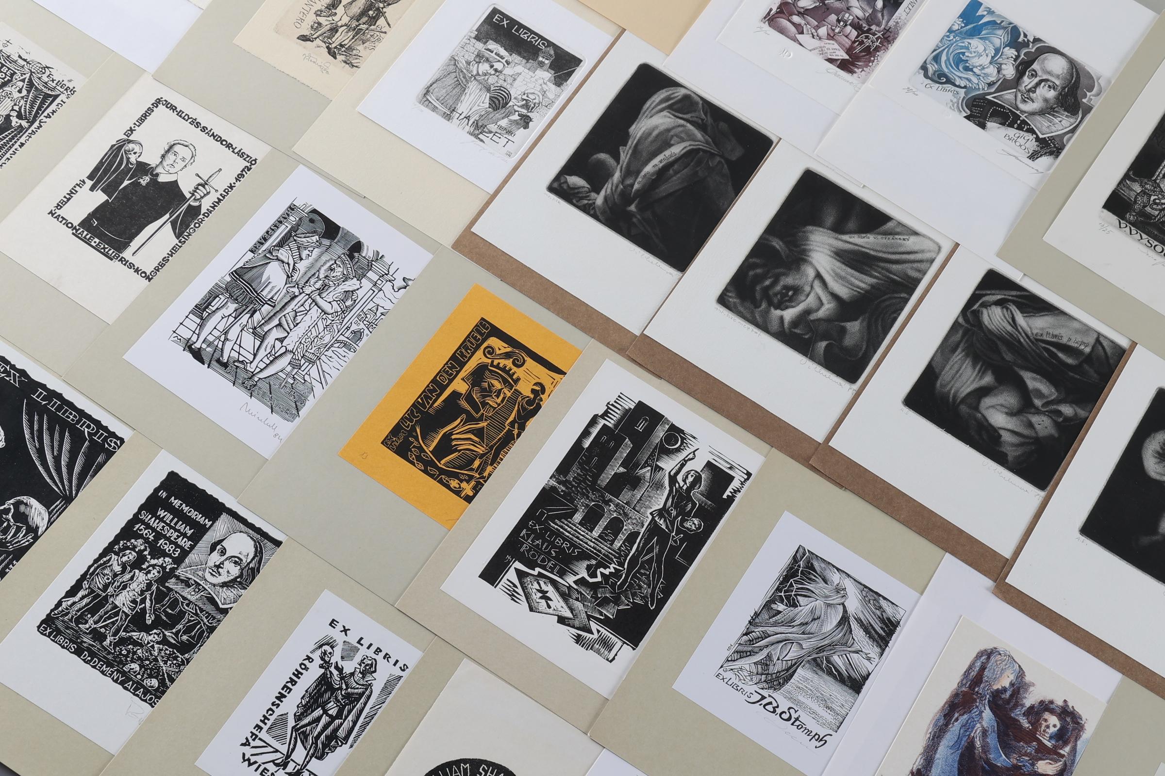 collectie van plm. 80 exlibris, thema: Shakespeare. Gemaakt door kunstenaars met de letters K t/m V. Plm. 30 x diepdruk (vrijwel alle gesigneerd), rest hoogdruk / vlakdruk (deels gesigneerd). Werk van o.a. Kisseljowa, De Vries, Pauwels, Kuehn, Myashita, Neuwirt, Nue, Rovegno, Peterknecht, Vodraszka, Kotrba, Rueter, Koch.