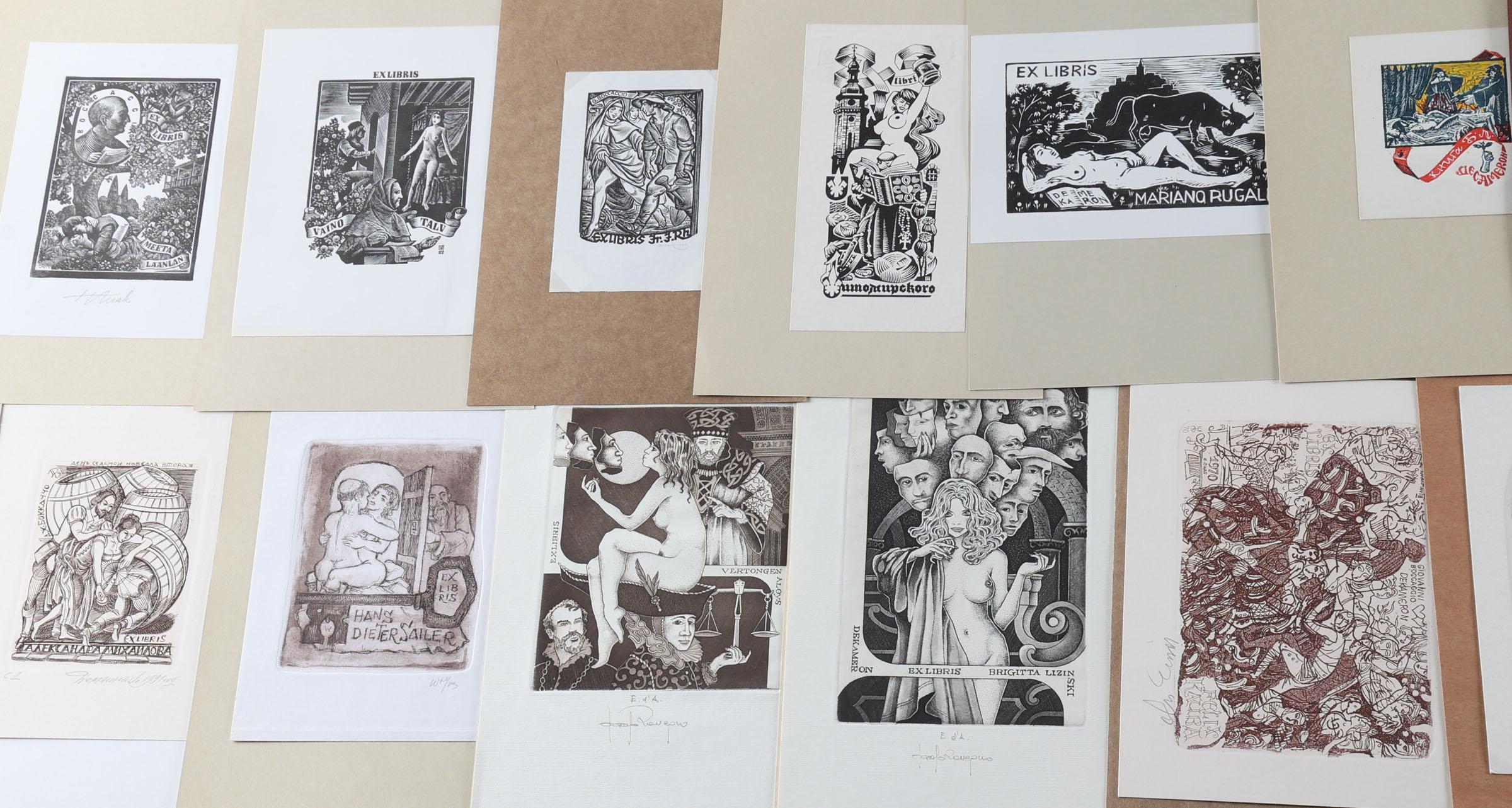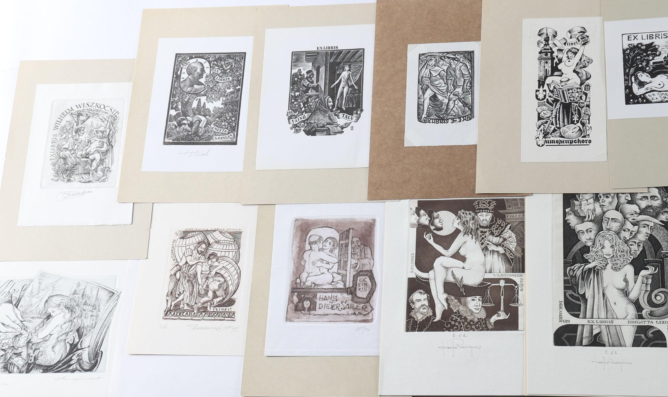 collectie van plm. 25 exlibris, thema: Boccatio / Decamerone. Plm. 15 x diepdruk (alle gesigneerd), rest hoogdruk / vlakdruk. Opgeplakt. Werk van o.a. Bednarik, Aulmann, Bekker, Van Damme, Kirnitsky, Mommen, Okas, Rovegno, Henault, Pauwels, Pugachevsky.