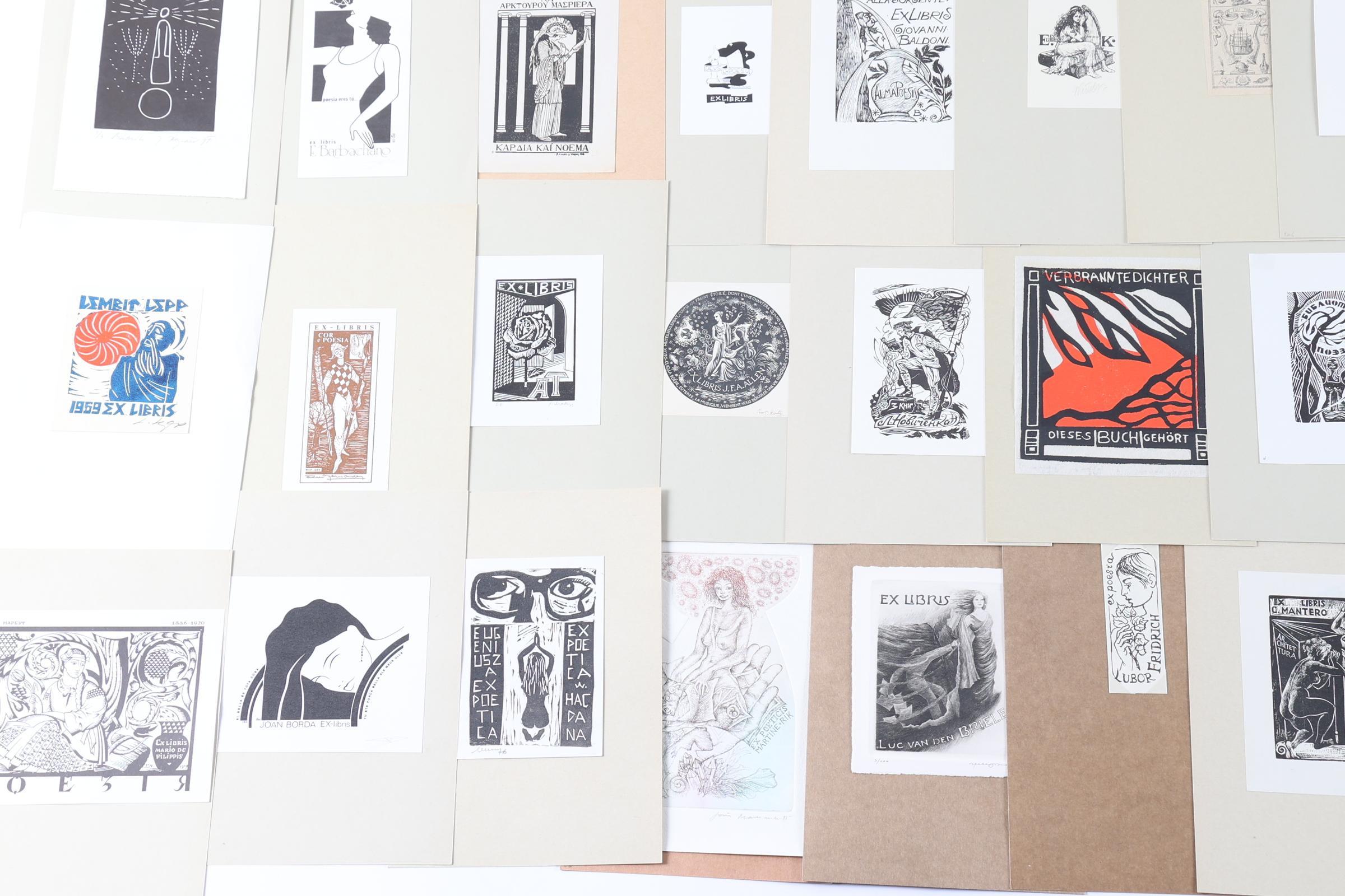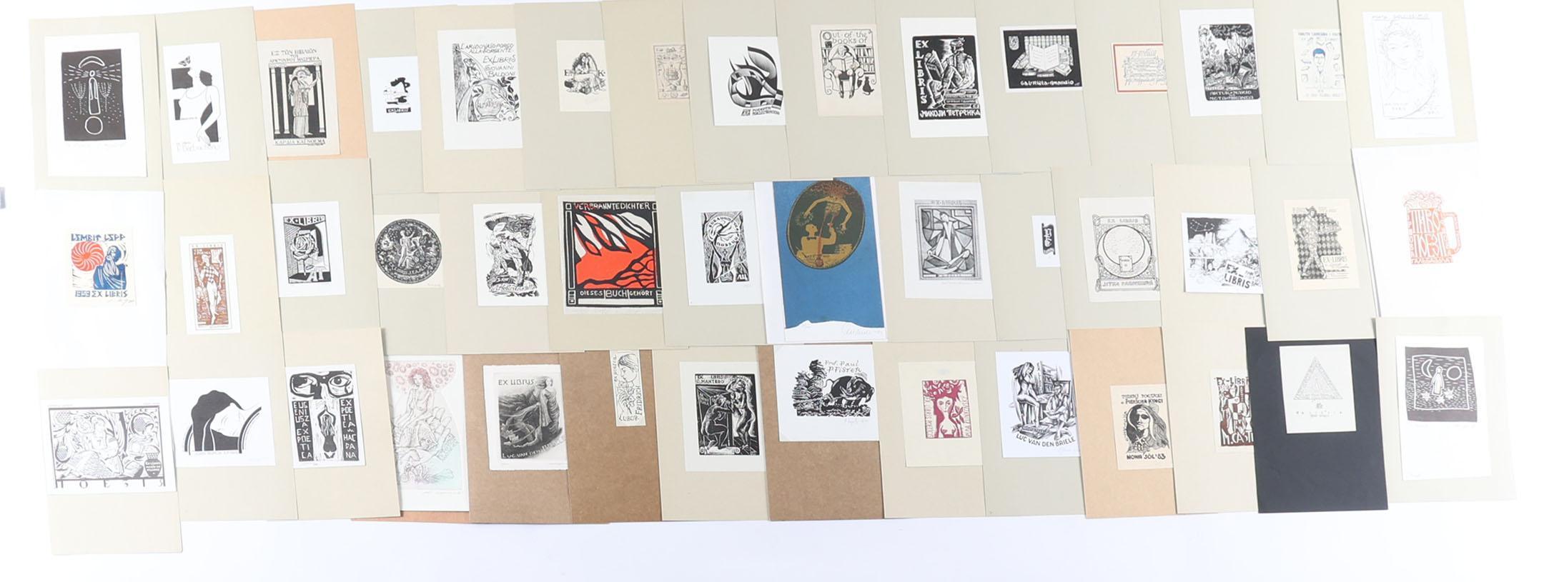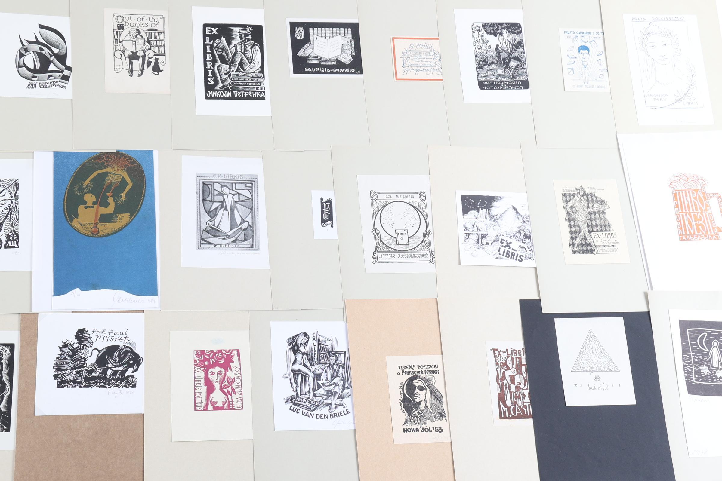 collectie van plm. 40 exlibris, thema: poëzie. 2 x Diepdruk, rest hoogdruk / vlakdruk. deels gesigneerd, opgeplakt.