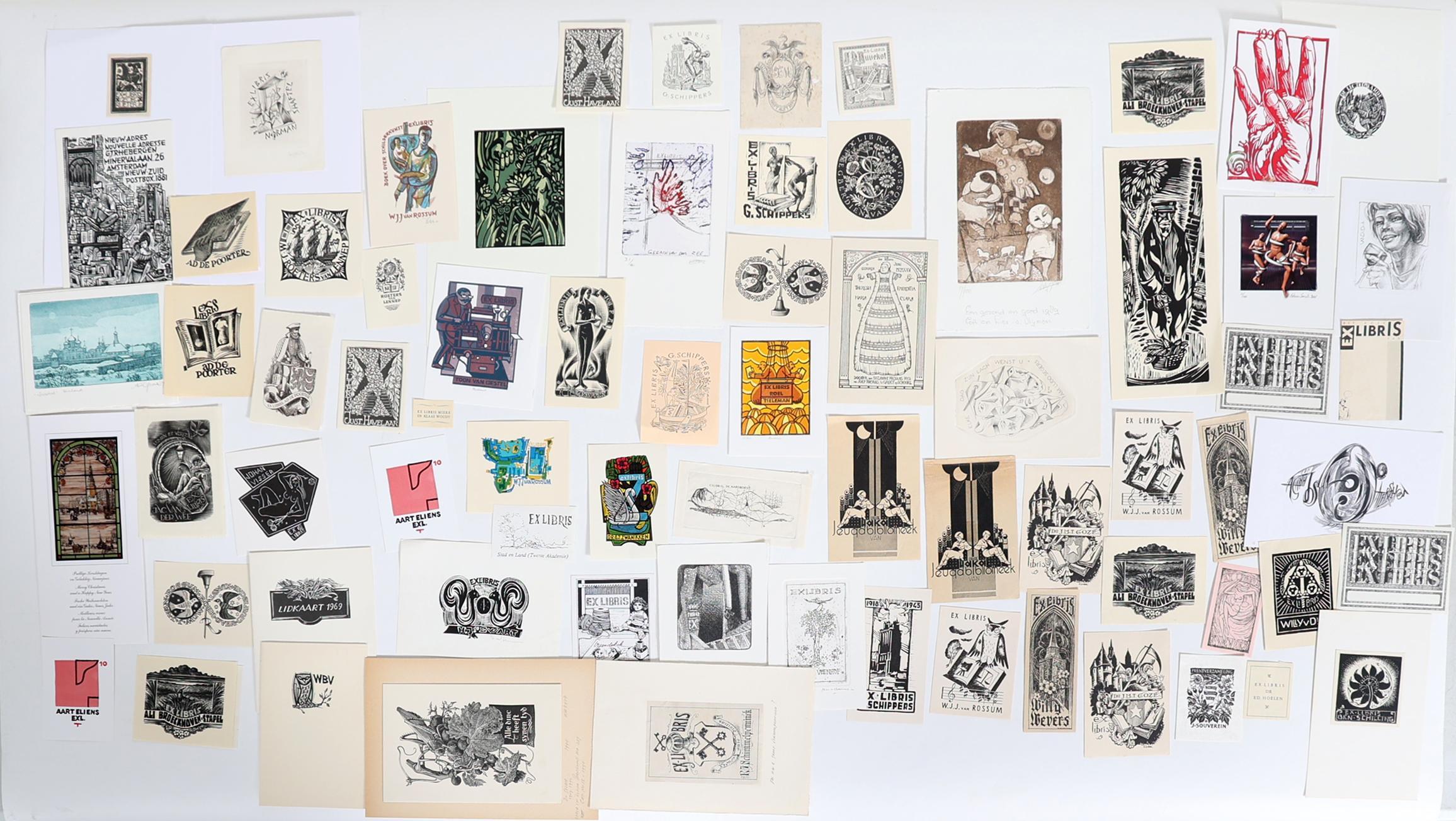 collectie van plm. 150 Nederlandse exlibris / kleingrafiek, voornamelijk hoogdruk, deels gesigneerd, deels opgeplakt. Gemaakt door o.a. Van Vlijmen, Bieruma Oosting, Blokhuis, Battermann, De Ruyter, Van Doorn, Bulder, Spronk.