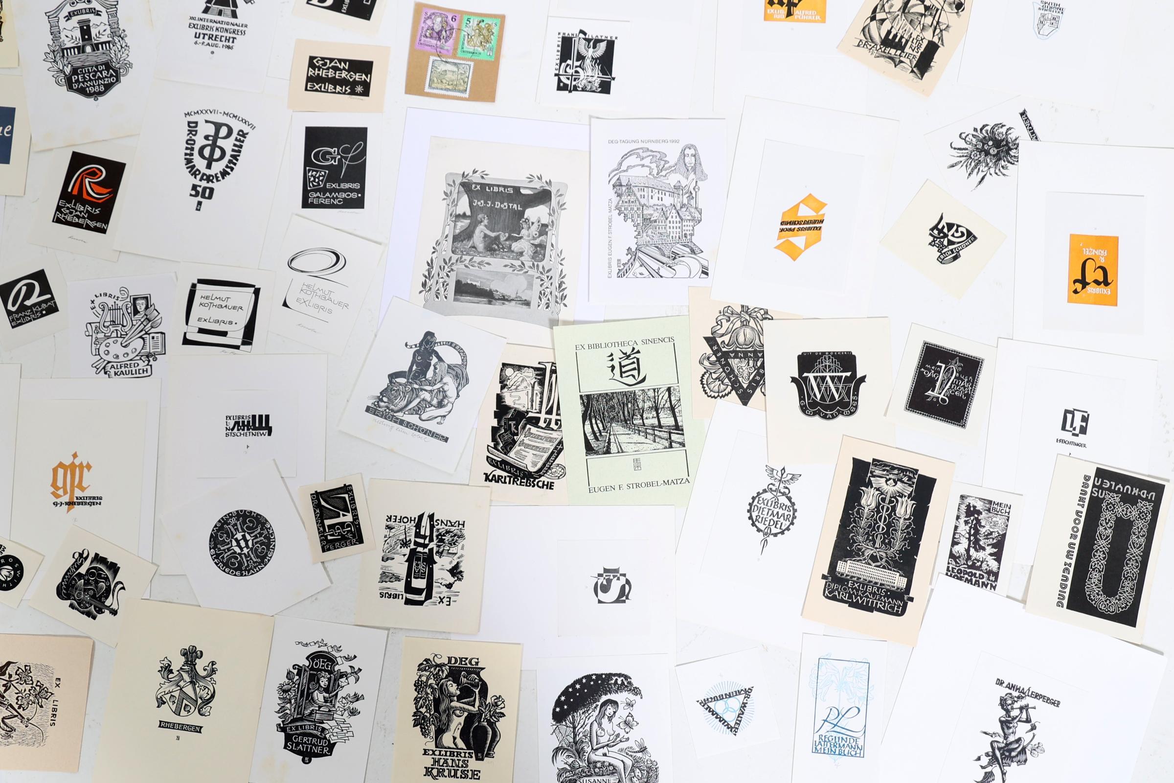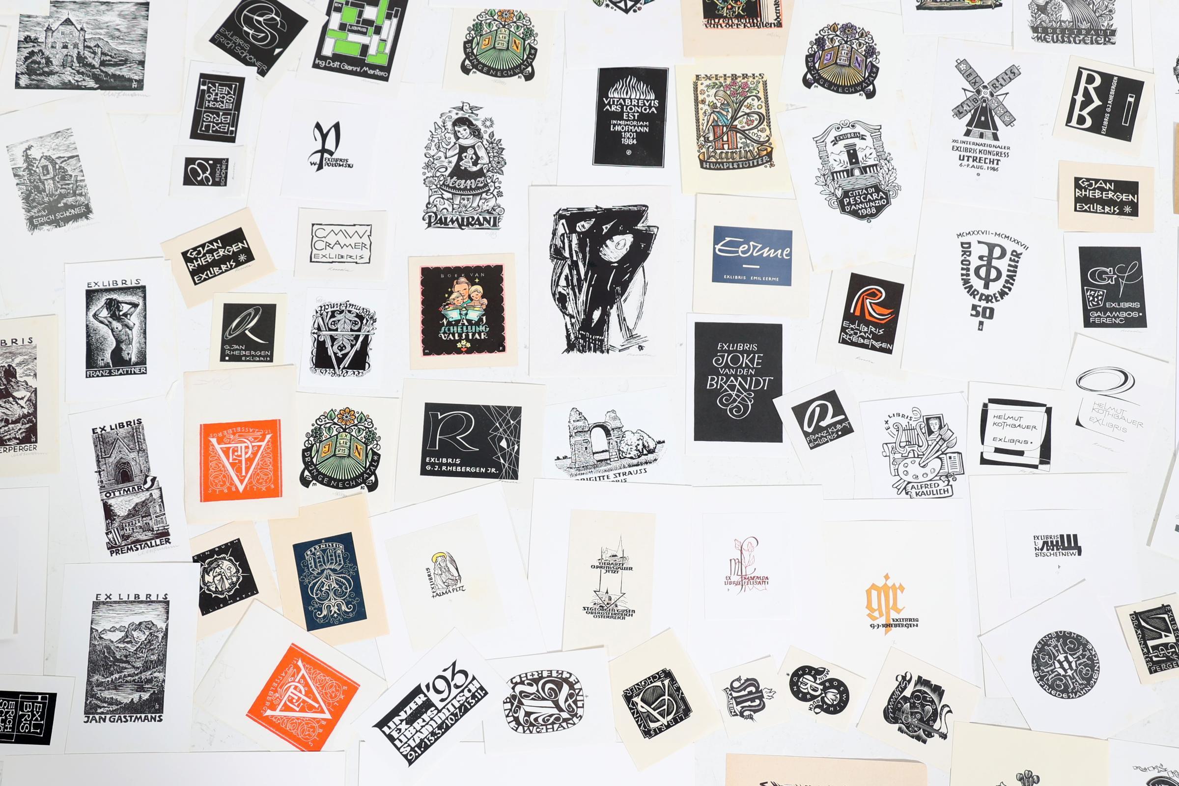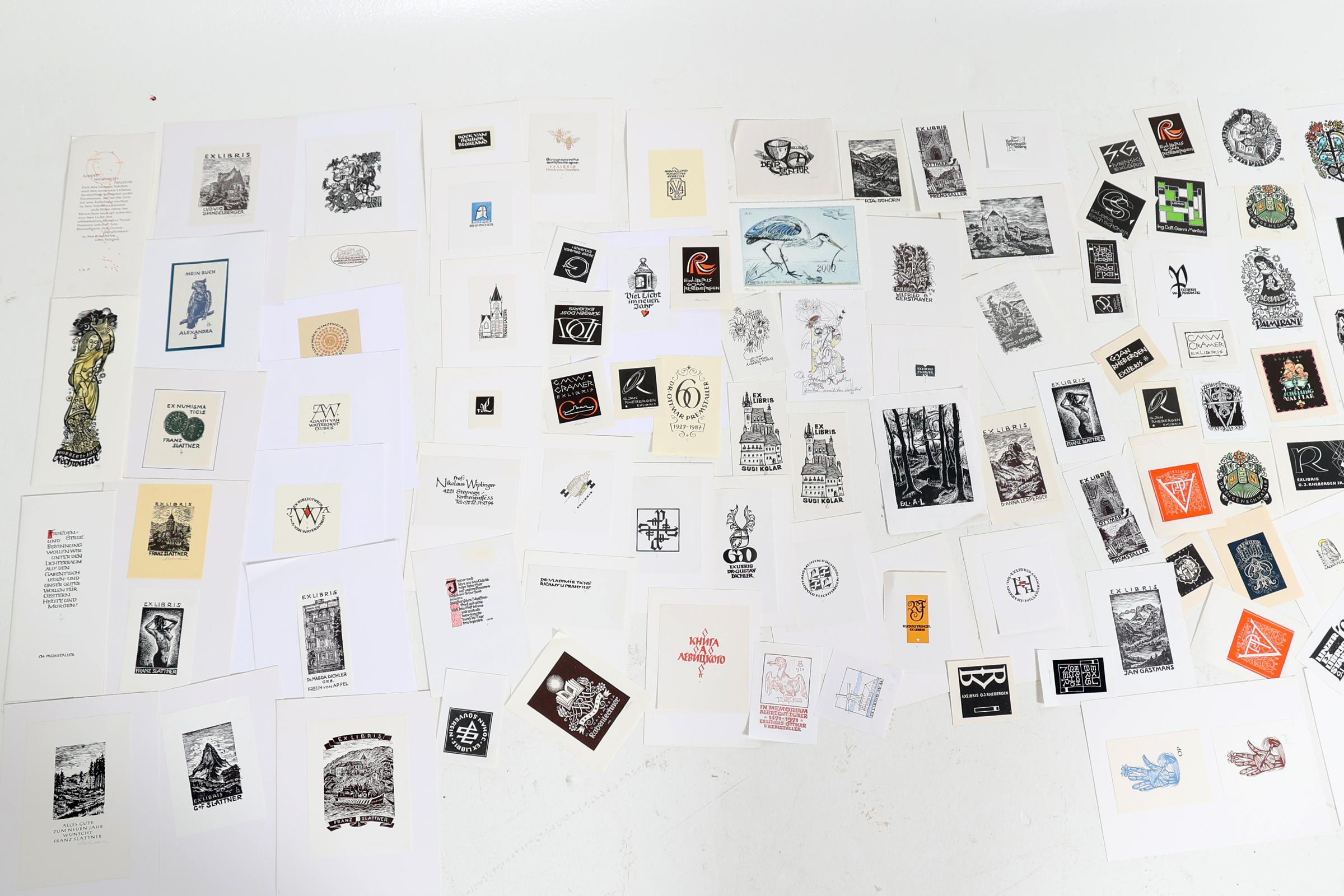 collectie van plm. 150 exlibris / kleingrafiek, gemaakt door Oostenrijkse kunstenaars. Hoogdrukken, deels gesigneerd, deels opgeplakt. Gemaakt door. o.a. Hofmann, Premstaller, Stumvoll, Haselbock, Hofer, Roveda.