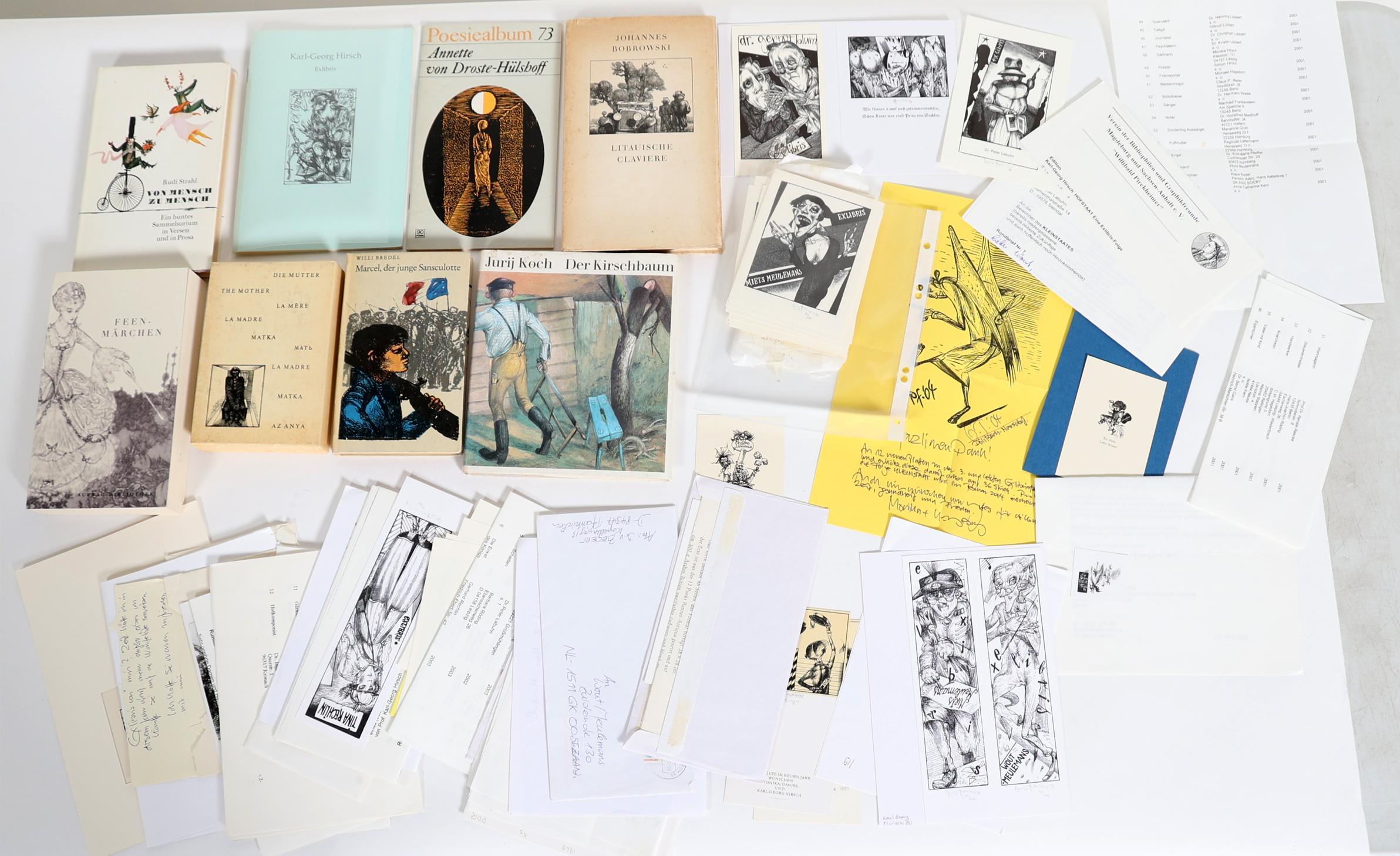 Hirsch, Karl-Georg, plm. 85 exlibris op naam van Meulemans (restoplagen, 3 verschillende), X6, gesigneerd. Toegevoegd: correspondentie van Hirsch, met enkele grafiek. Verder toegevoegd: 'Werkliste der Exlibris von Karl-Georg Hirsch, 1962-1992' (Meussgeier). Verder toegevoegd: 7 door Hirsch geïllustreerde boeken (o.a. 'Die Mutter', 'Von Mensch zu Mensch', 'Litauische Klaviere', 'Feeenmaerchen')